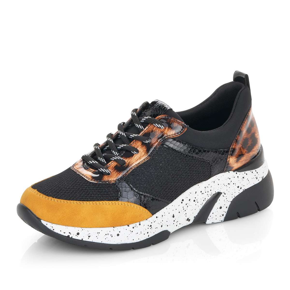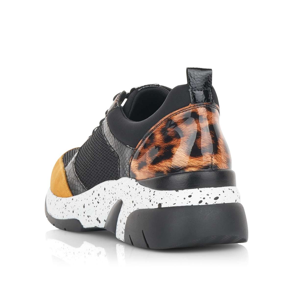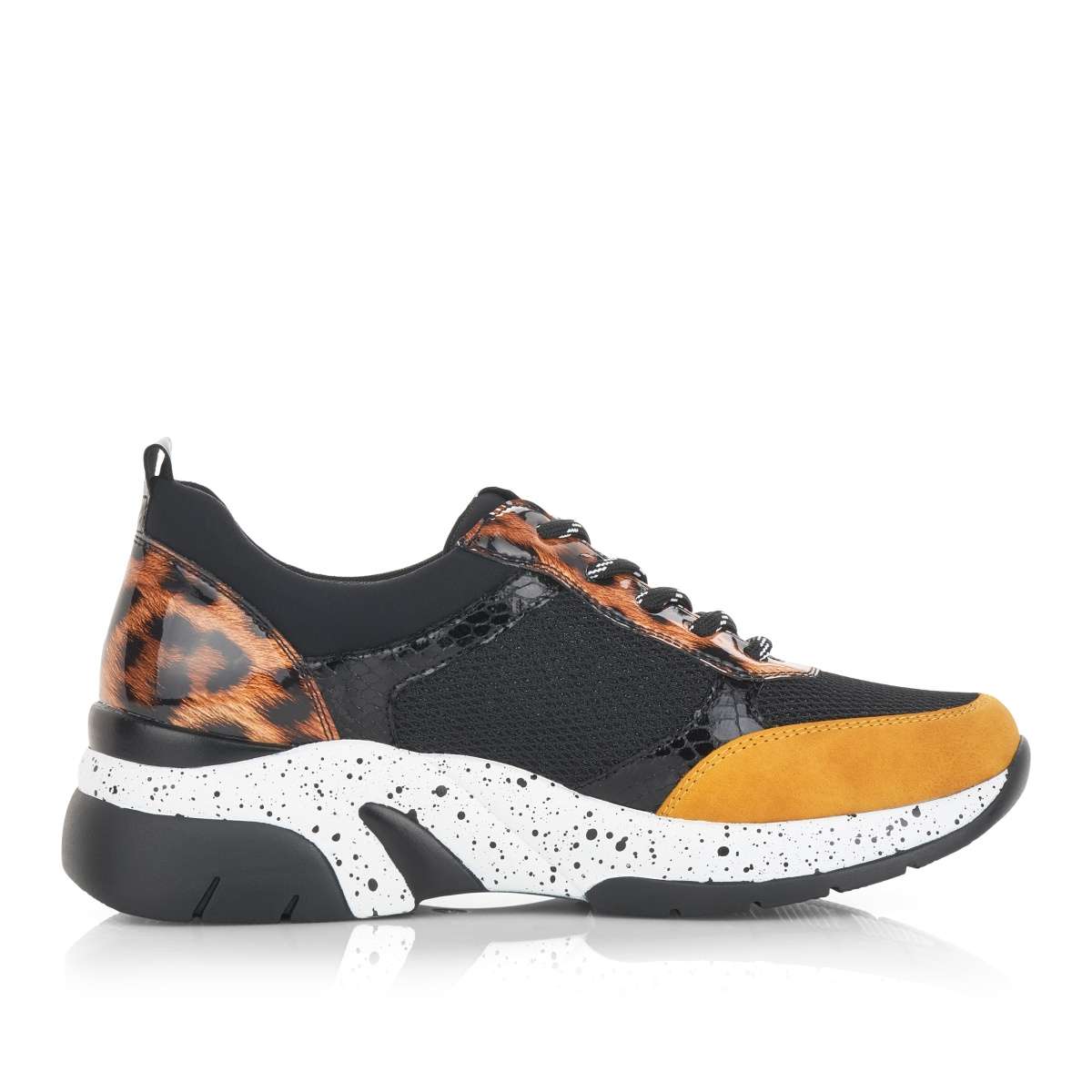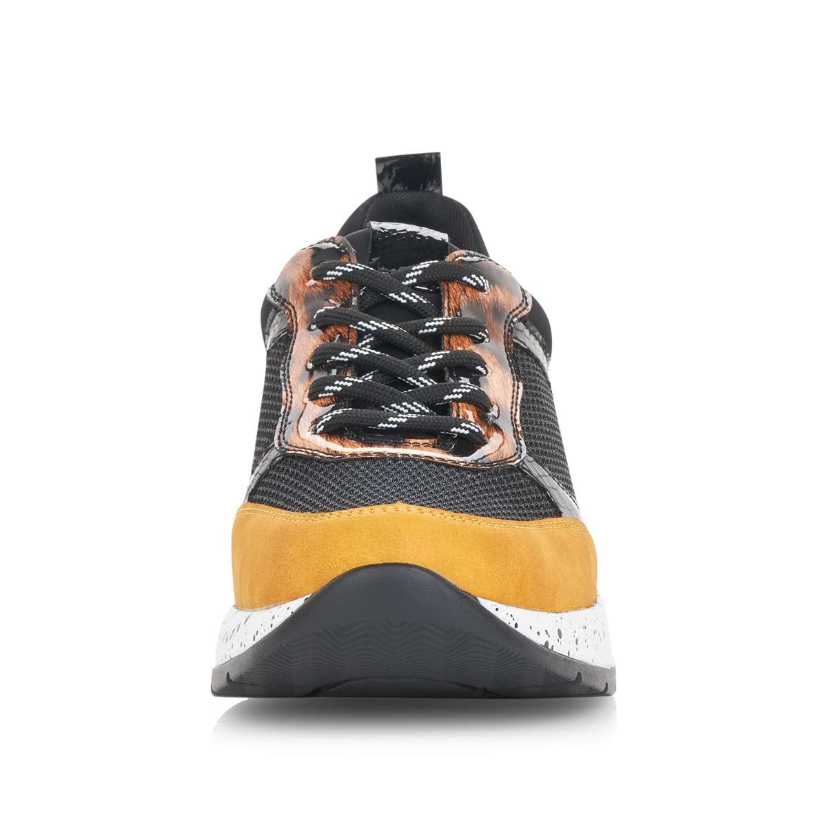 Dámské černé tenisky jsou zdobené žlutým lemem špice a lesklými díly s motivem zvířecí kůže. Šněrováním si je upravíte dle svých potřeb. Pevná vyšší podešev je barevně sladěná se svrškem a vyjímatelnou stélku můžete kdykoliv vyměnit či vyvětrat. Tento model užijete jak k sukni do práce, tak na procházky ke kraťasům nebo kalhotám.
