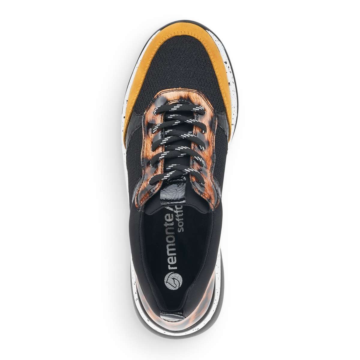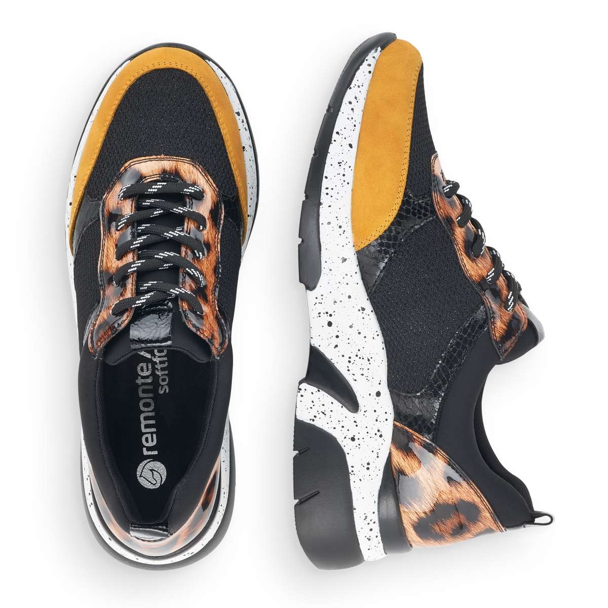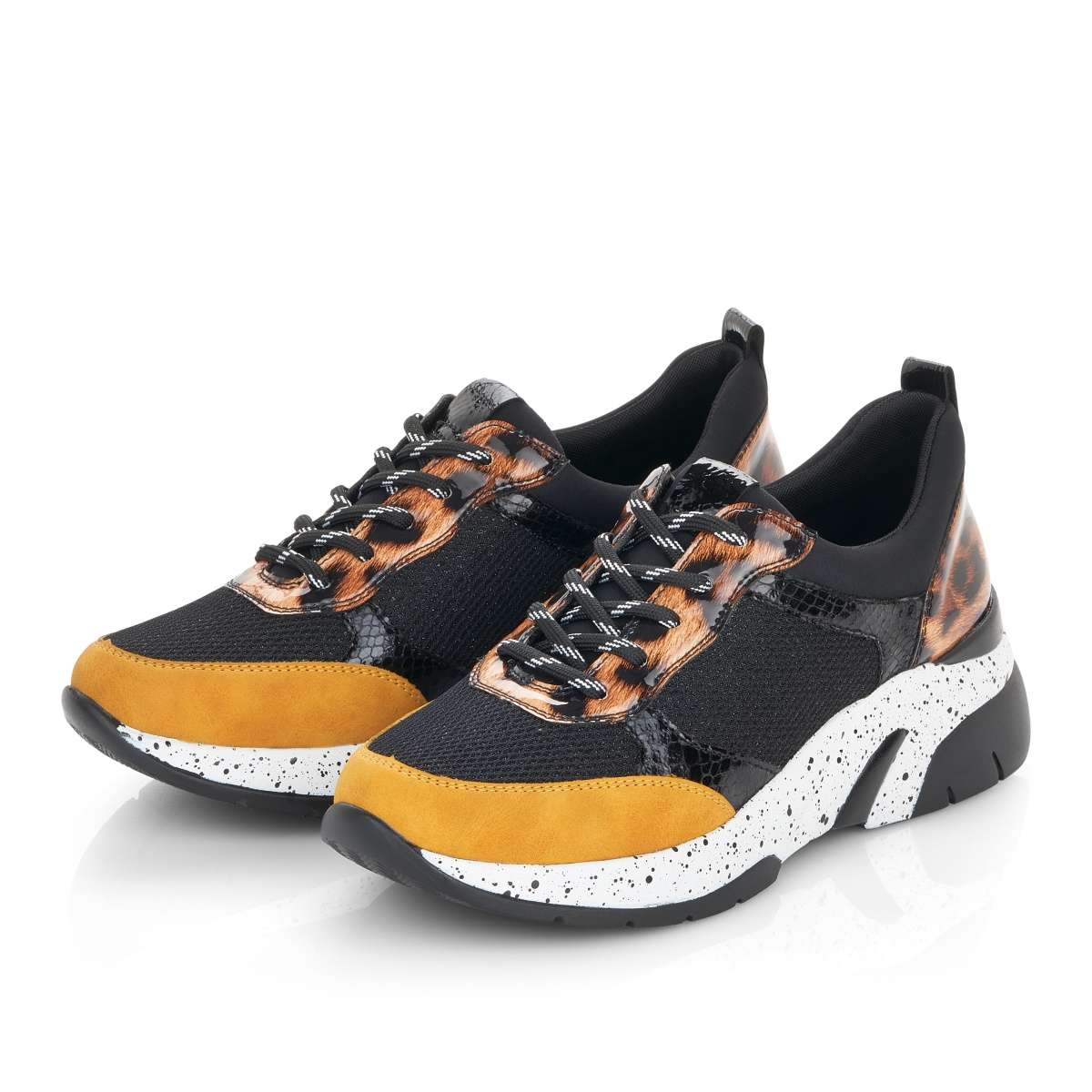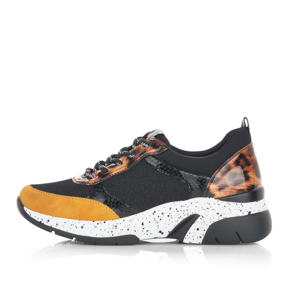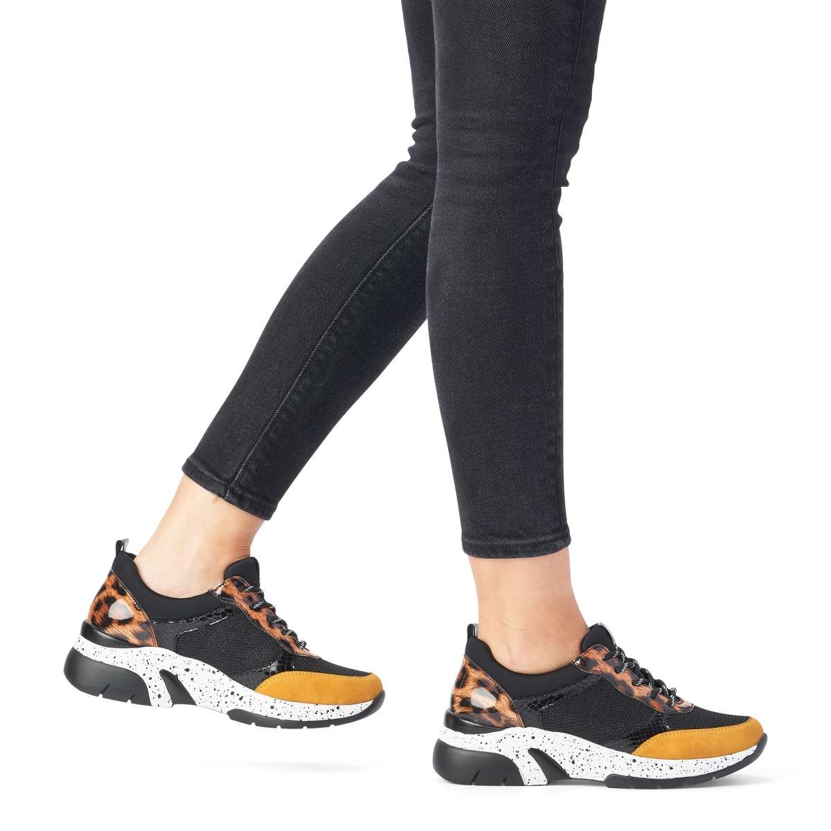 Dámské černé tenisky jsou zdobené žlutým lemem špice a lesklými díly s motivem zvířecí kůže. Šněrováním si je upravíte dle svých potřeb. Pevná vyšší podešev je barevně sladěná se svrškem a vyjímatelnou stélku můžete kdykoliv vyměnit či vyvětrat. Tento model užijete jak k sukni do práce, tak na procházky ke kraťasům nebo kalhotám.