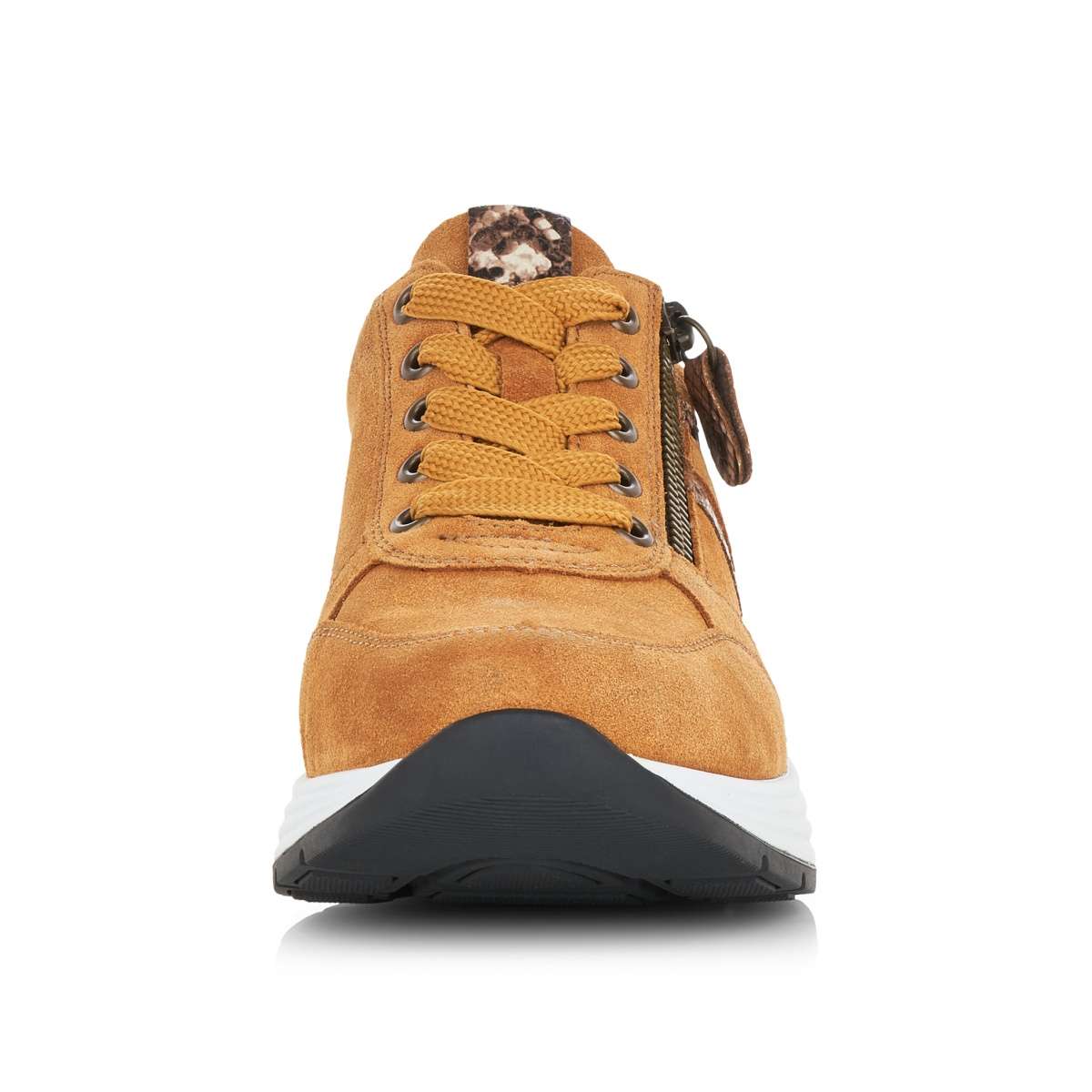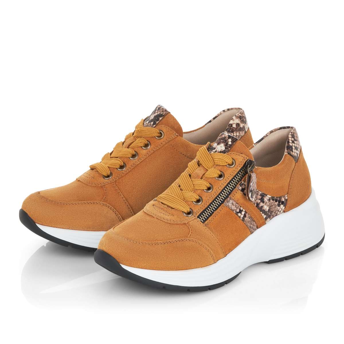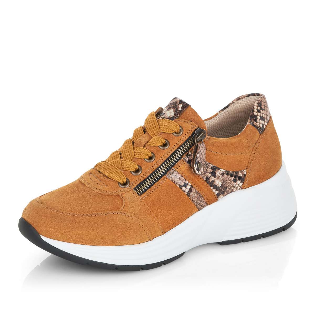 Dámské tenisky značky REMONTE (vyšší řada značky Rieker) s ozdobným zipem by měla mít každá žena v botníku. Ke snadnému obouvání slouží šněrování, kterým si obuv upravíte přímo na nohu. Tato obuv je vybavena vyjímatelnou stélkou, která je vyrobena z unikátní paměťové pěny, a proto se maximálně přizpůsobí tvaru Vašeho chodidla. Pevná podešev je vysoká cca 5,6 cm a dodá Vám příjemný pocit při každém kroku. Tento model má mnoho využití, můžete si je vzít na procházku s přáteli nebo do práce.