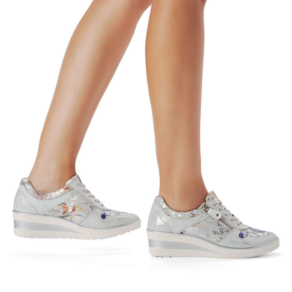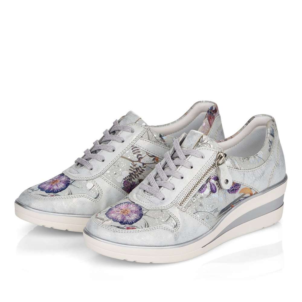 Detailní informace Obuv REMONTE – jedná se o vyšší řadu značky RIEKER, tato obuv se vyznačuje vynikající kombinací svrchních materiálů. Tento model tenisek Vás svým provedením zaujme na první pohled. Svršek vyrobený v kombinaci metalických a designově květovaných částí je ozdoben jemným prošíváním. Snadné nazouvání umožní funkční zip na vnější straně a šněrováním si obuv přizpůsobíte dle Vašich požadavků. Stélka je vyrobena z unikátní paměťové pěny, která změkčuje každý Váš došlap, a navíc je vyjímatelná. Kvalitní syntetická podešev je v nejvyšším místě pod patou vysoká cca 5 cm a ozdobena je stříbrnými pruhy. Tento model Vám svým vzhledem dává prostor pro snadnou kombinaci s Vašimi letními outfity.