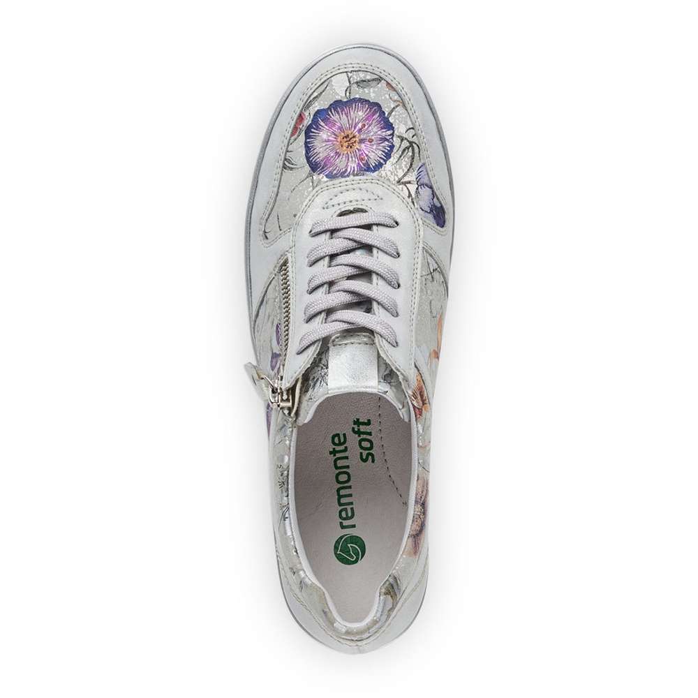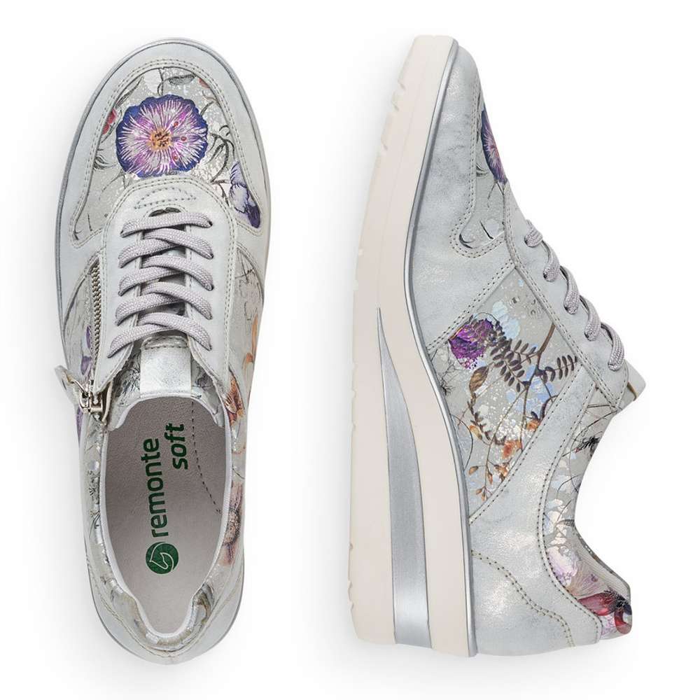 Obuv REMONTE – jedná se o vyšší řadu značky RIEKER, tato obuv se vyznačuje vynikající kombinací svrchních materiálů. Tento model tenisek Vás svým provedením zaujme na první pohled. Svršek vyrobený v kombinaci metalických a designově květovaných částí je ozdoben jemným prošíváním. Snadné nazouvání umožní funkční zip na vnější straně a šněrováním si obuv přizpůsobíte dle Vašich požadavků. Stélka je vyrobena z unikátní paměťové pěny, která změkčuje každý Váš došlap, a navíc je vyjímatelná. Kvalitní syntetická podešev je v nejvyšším místě pod patou vysoká cca 5 cm a ozdobena je stříbrnými pruhy. Tento model Vám svým vzhledem dává prostor pro snadnou kombinaci s Vašimi letními outfity. Technologie: RemonteSoft – unikátní stélka z paměťové pěny, která změkčuje došlap, ale také se maximálně přizpůsobí tvaru Vašeho chodidla. Tato bota je vybavena vyjímatelnou stélkou.