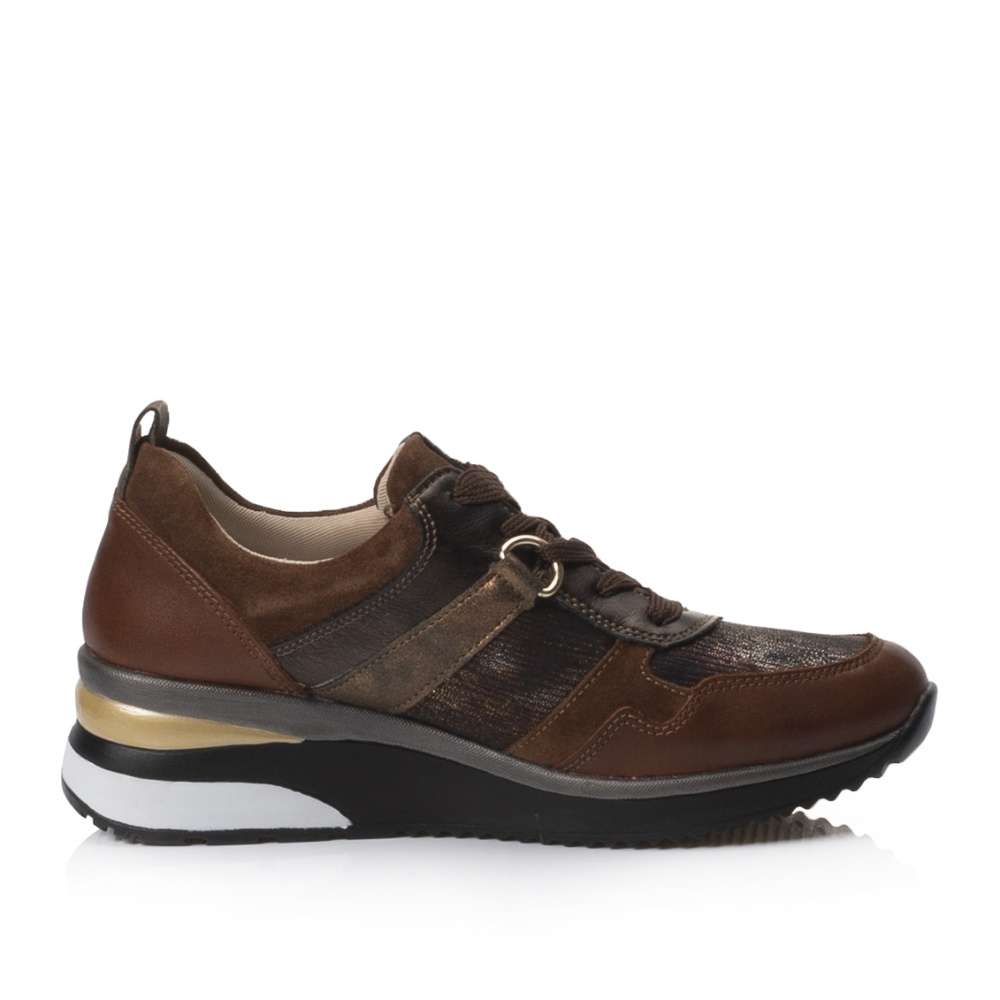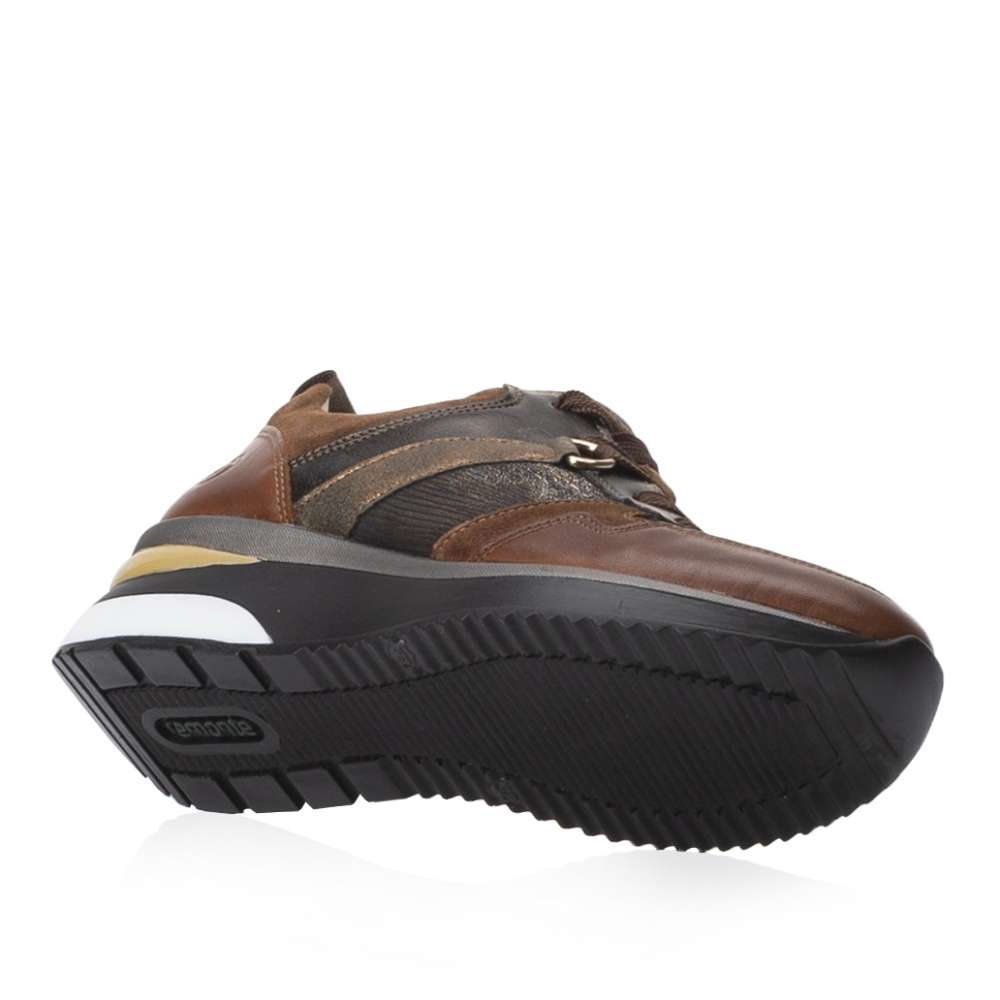 Kožený svršek je kombinací více hnědých odstínů a okrasnou přezkou, čímž dodává teniskám jedinečný styl.