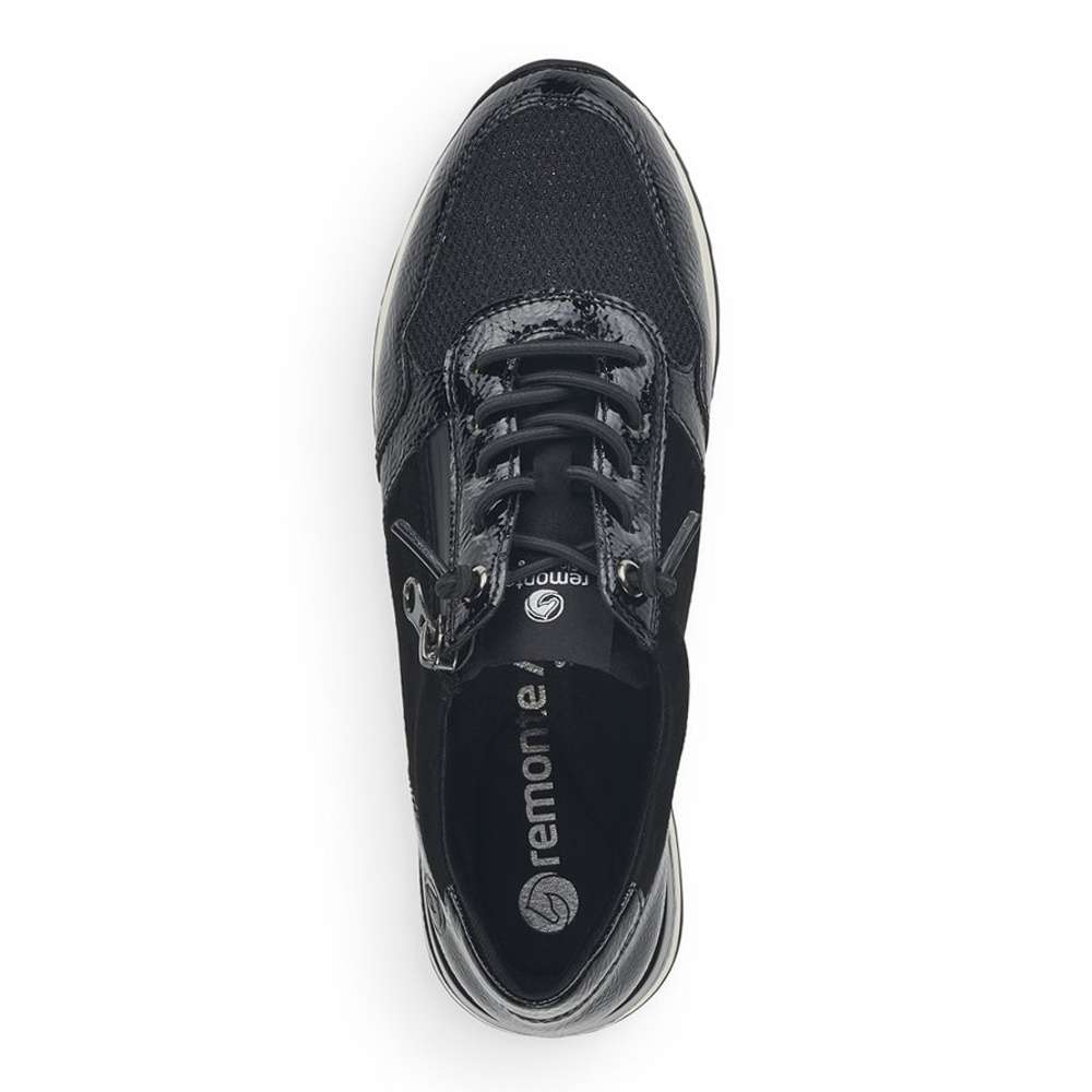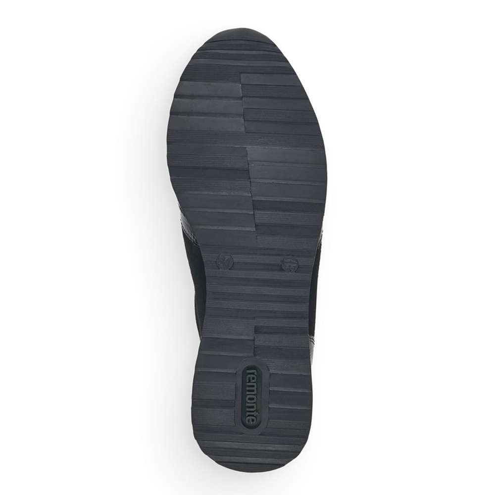 Detailní informace Obuv REMONTE – jedná se o vyšší řadu značky RIEKER, tato obuv se vyznačuje vynikající kombinací svrchních materiálů. Jednoduše elegantní vzhled těchto tenisek doplní Vaše outfity. Svršek černé barvy je složen z lesklých, jemně broušených a textilních částí, které spolu dokonale ladí. Snadno si obuv nazujete díky funkčnímu zipu a šněrování pružnou gumičkou, která má spíše dekorativní účel. Vyjímatelná paměťová stélka je příjemně měkká a podešev svým kontrastním vzhledem doladí vzhled obuvi k dokonalosti. Tato obuv bude skvěle vypadat například s kalhotami na procházce městem.