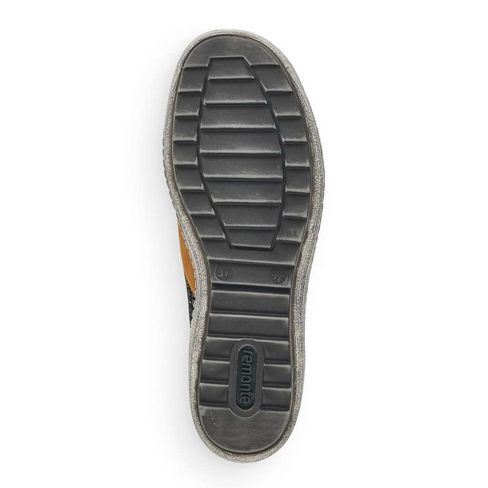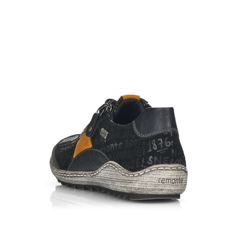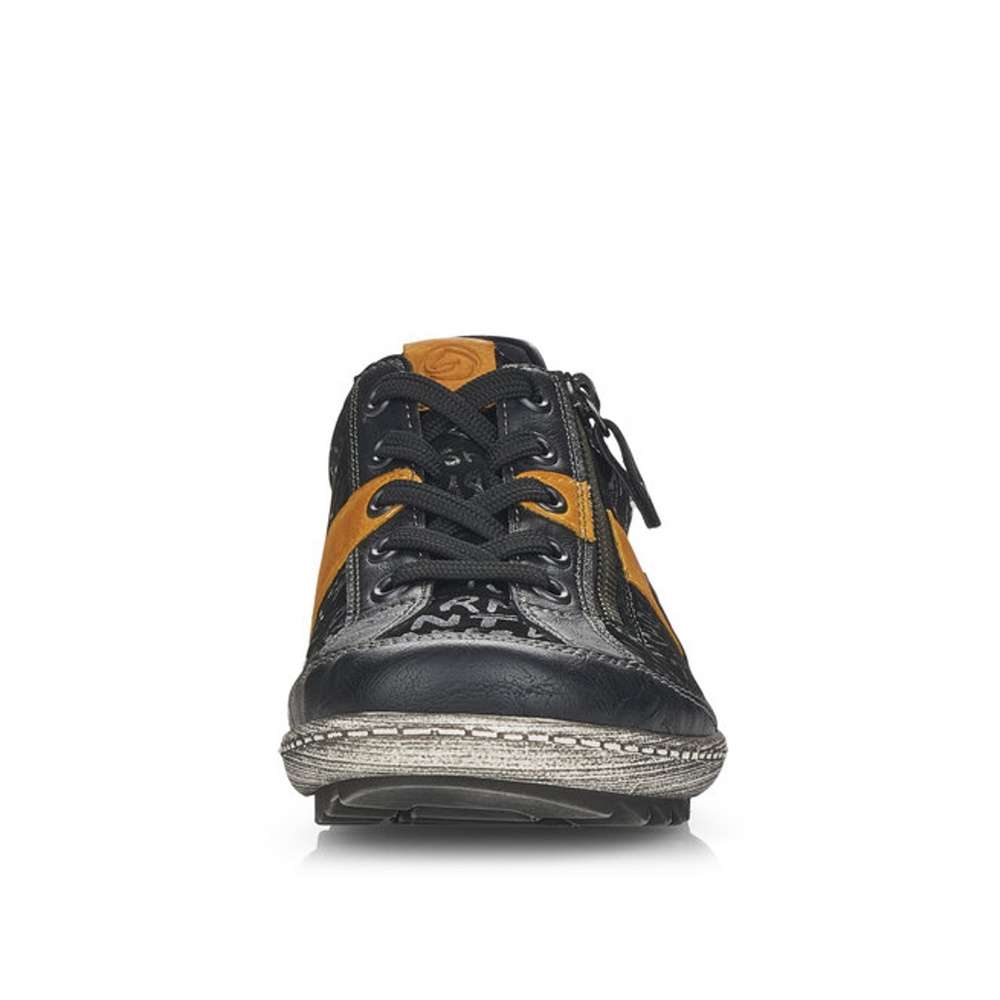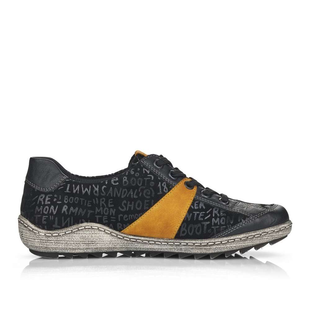 „Remonte“ stříbrný popis tenisek na tmavém podkladu s černými pásky krásně hraje se žlutými výraznými doplňky. Šněrování a funkční zip Vám zajistí pohodlné obutí i vyzutí obuvi.