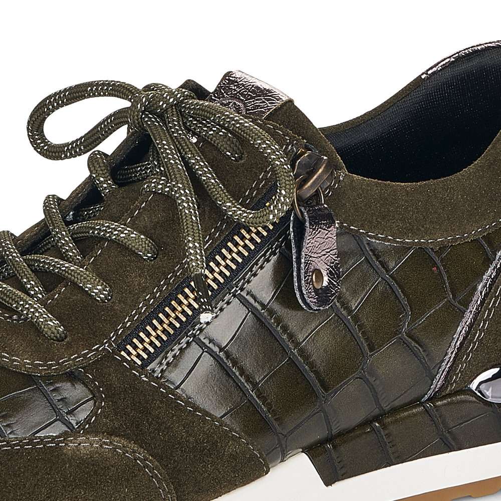 Na svršku obuvi se prolínají části z broušené kůže s částmi hadího vzoru a k dokonalosti je dolaďují bronzové prvky. Snadno si obuv nazujete díky funkčnímu zipu a šněrování žíhanými tkaničkami.