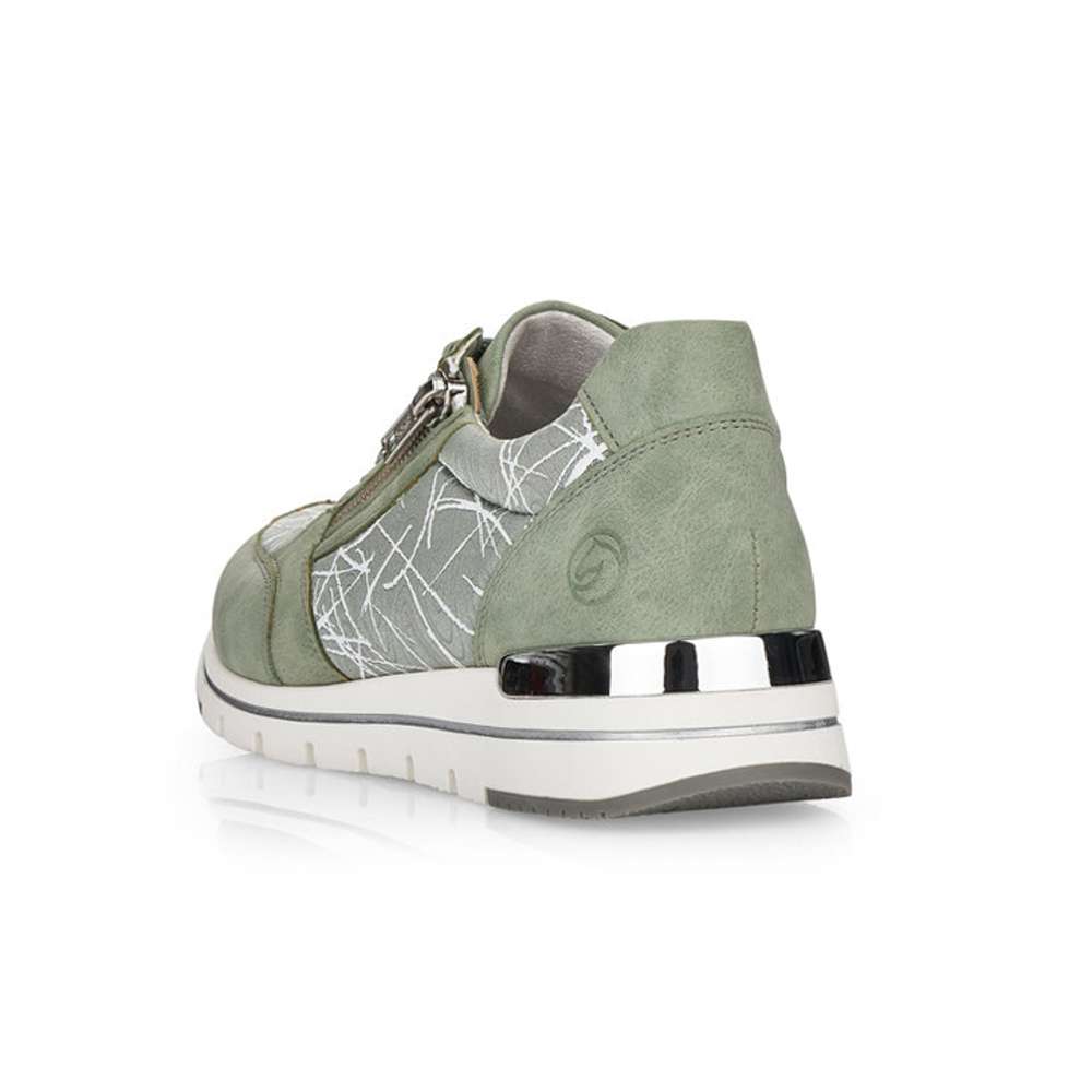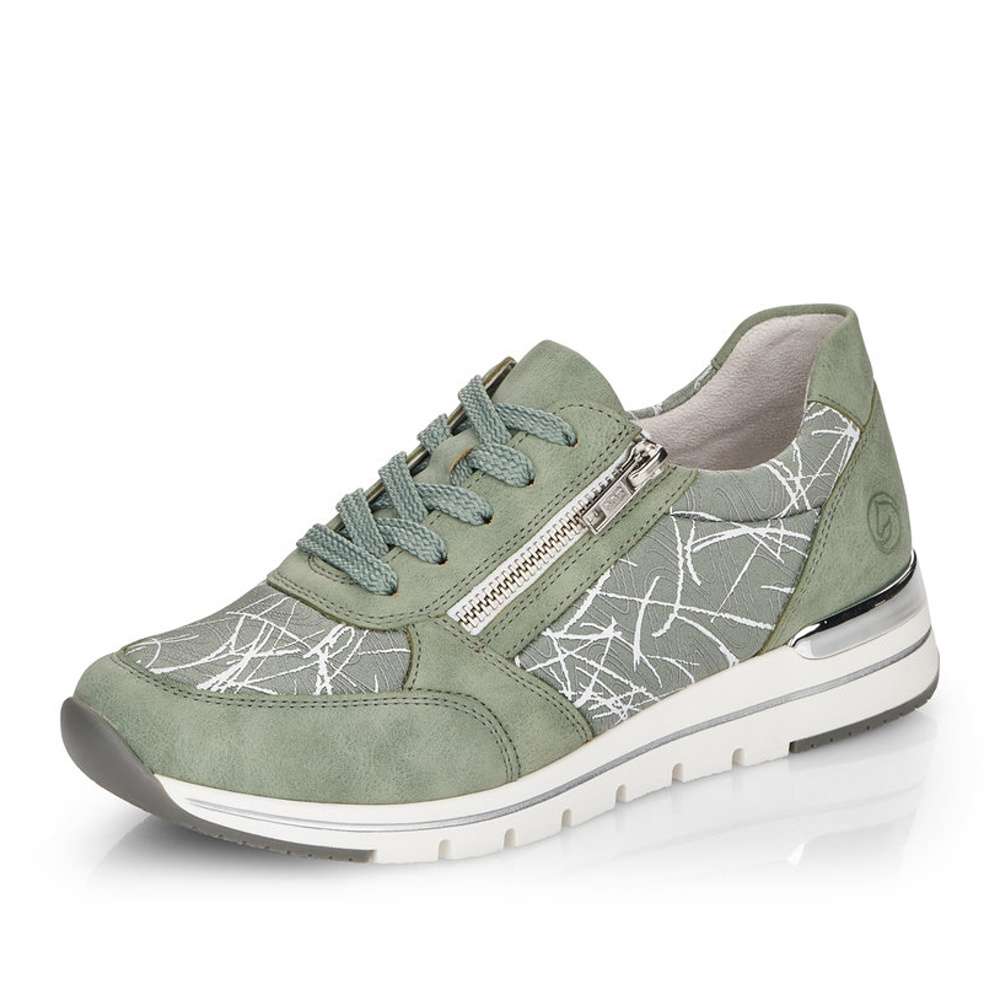 Obuv REMONTE je vyšší řadou značky RIEKER a vyznačuje se kvalitou použitých materiálů. Tuto tenisku si zamilujete díky jejímu modernímu vzhledu i díky pohodlí, které Vám poskytne stélka z paměťové pěny. Svršek boty je z prodyšného materiálu a kombinuje odstíny zelené barvy i s poutavým vzorem. Na vnější straně tenisky se nachází funkční zip a botu lze uzavírat i tkaničkami. Na patě se nachází krásný stříbrný prvek, barvou ladící se zipem a proužkem na podešvi. Boty z řady Remonte Vám zajistí maximální komfort a pohodlí při celodenním nošení ať už se vydáte na výlet do města nebo na kávu s kamarádkou. Technologie: RemonteSoft – unikátní stélka z paměťové pěny, která změkčuje došlap, ale také se maximálně přizpůsobí tvaru Vašeho chodidla. Vyjímatelná stélka-Tato bota je vybavena vyjímatelnou stélkou.