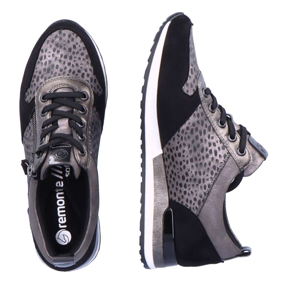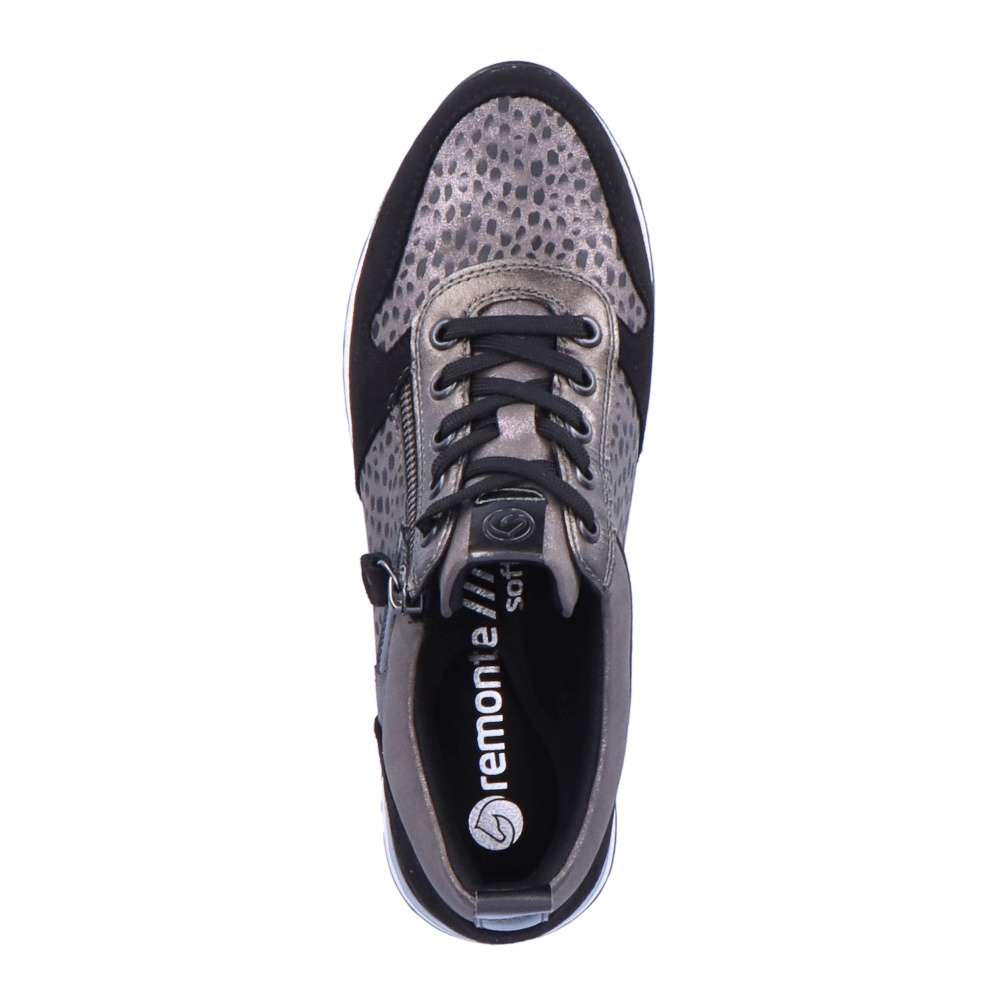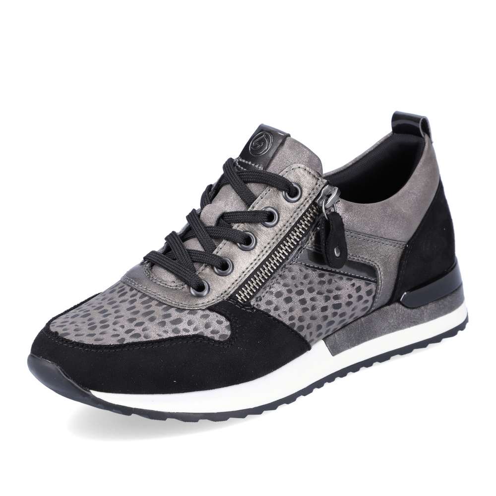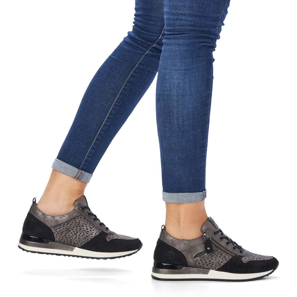 Obuv REMONTE – jedná se o vyšší řadu značky RIEKER, tato obuv se vyznačuje vynikající kombinací svrchních materiálů. Tyto pohodlné městské tenisky budou tou správnou volbou. Svršek obuvi je poskládán z několika různých částí, které spolu utváří skvělý design. Obuv si rychle nazujete díky funkčnímu zipu a přizpůsobíte díky šněrování tkaničkami. Vyjímatelná paměťová stélka zajistí maximální pohodlí po celý den a kvalitní podešev svým provedením doladí celkový vzhled obuv k dokonalosti. Tenisky budou skvěle vypadat s kalhotami, ale třeba i dlouhými šaty.