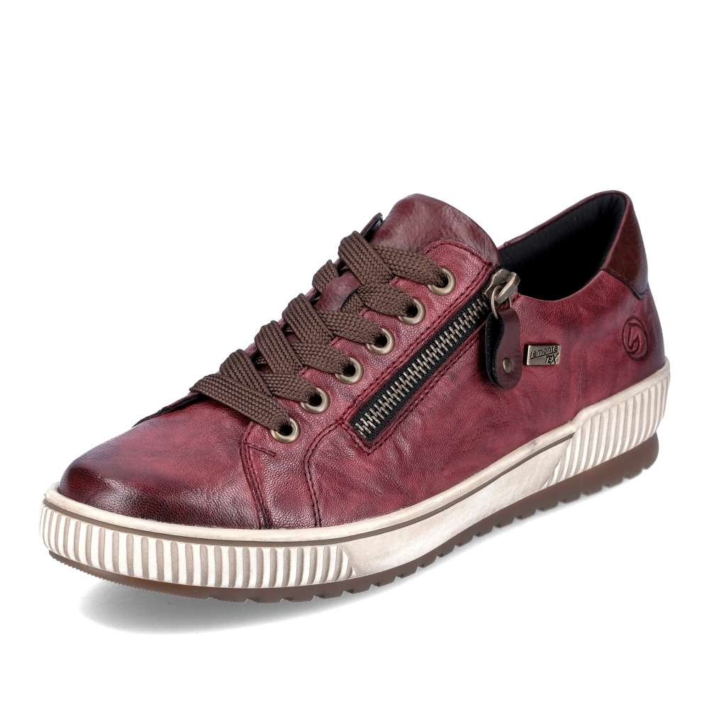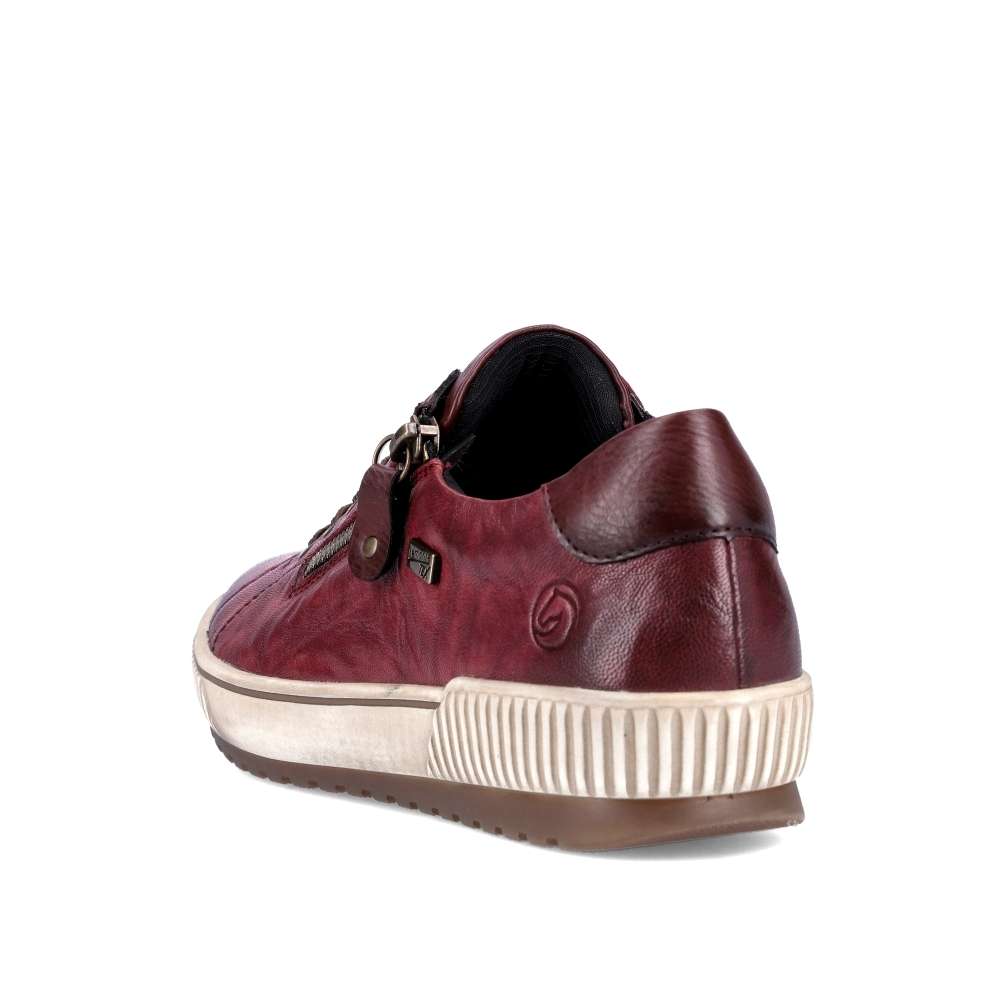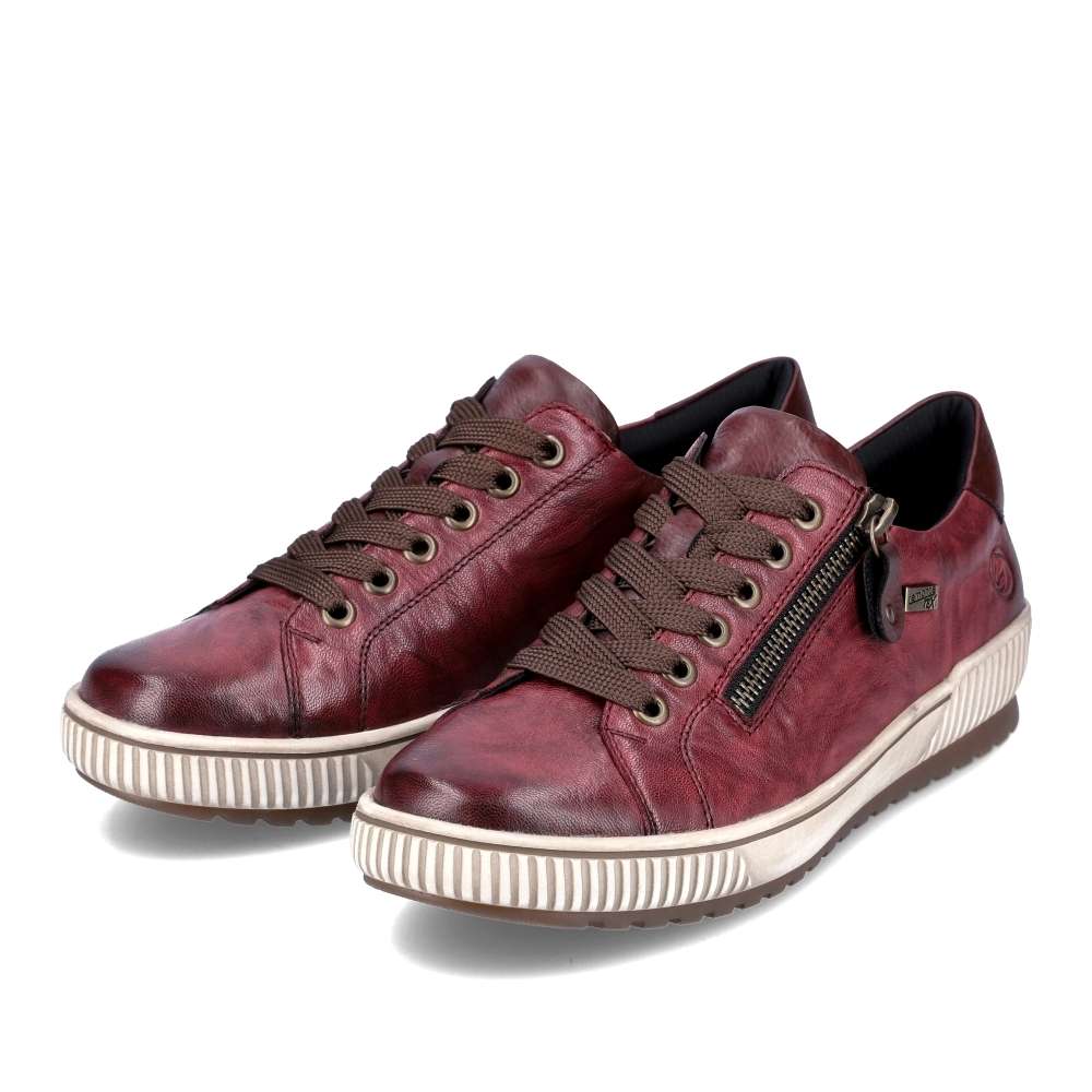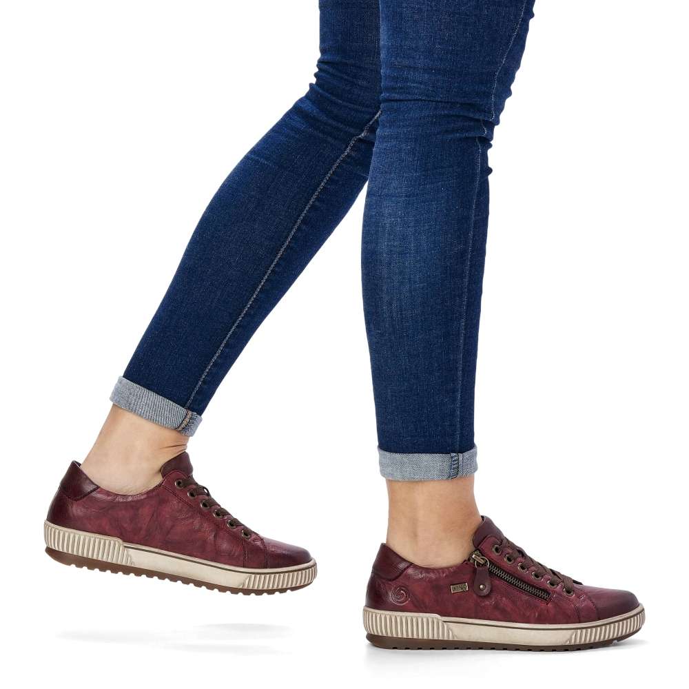 Obuv REMONTE je vyšší řadou značky RIEKER, obuv se vyznačuje kvalitou použitých materiálů. Dokonalé dámské tenisky Remonte v nové vínově červené podzimní barvě, které musí doplnit Váš botník. I přes jednoduchý svršek mají tyto botičky styl, který zaujme každého okolo. Svršek vyroben z kvalitní kůže, ozdoben zipem, tkaničkami a logo značky REMONTE, která je vtištěná u paty. Kvalitní vyjímatelná stélka se přizpůsobí chodidlu a budete se cítit jako na obláčku. Tato obuv skvěle padne ke kalhotám a jeansům na procházce městem. Technologie Remonte TEX – funkční vrstva, díky které je svršek boty nepromokavý a přesto prodyšný. Remonte Soft – unikátní stélka vyrobená z prodyšného materiálu, která svým tvarem a materiálem zajistí pocit pohodlí při celodenním nošení. Tato bota je vybavena vyjímatelnou stélkou.