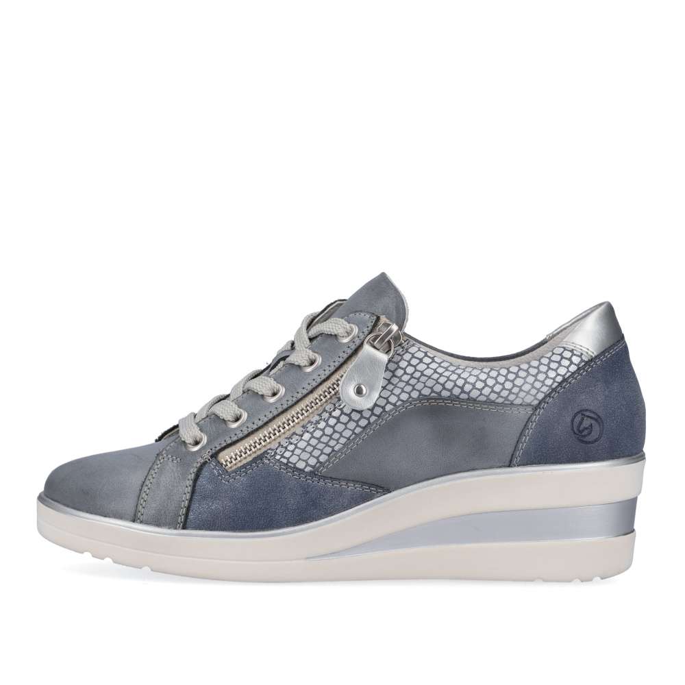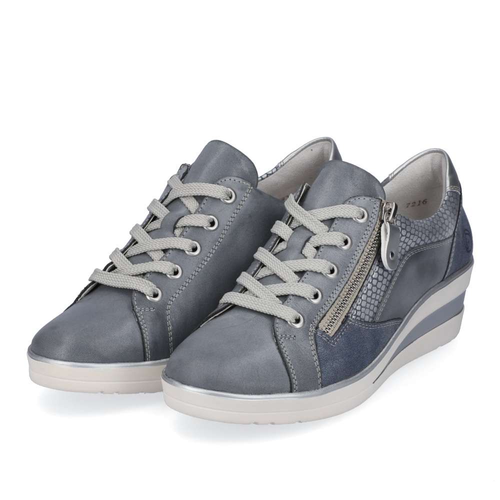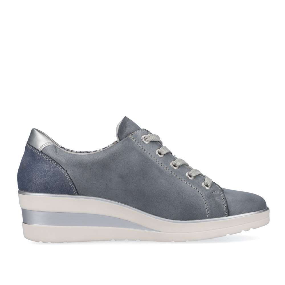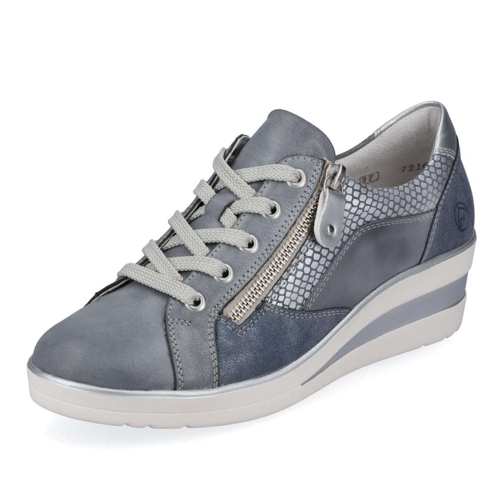 Detailní informace Obuv REMONTE – jedná se o vyšší řadu značky RIEKER, tato obuv se vyznačuje vynikající kombinací svrchních materiálů. Tyto šněrovací boty jsou dokonalým každodenním společníkem v modro-šedé barvě. Šněrování je doplněno zipem a to zaručuje optimální oporu a perfektní střih. Tlumící a lehká podrážka s klínovým podpatkem a extra měkká vyjímatelná stélka jsou další argumenty pro tuto botu. Šířka H vám dává větší volnost v botě. To znamená – nekonečné procházky nejsou žádným problémem!