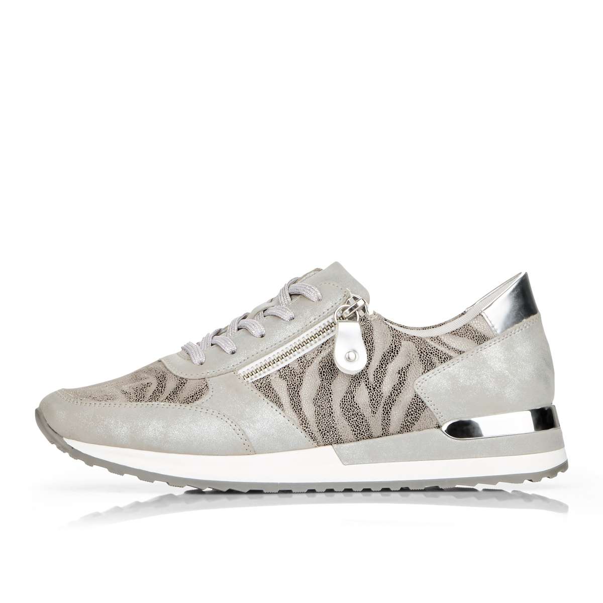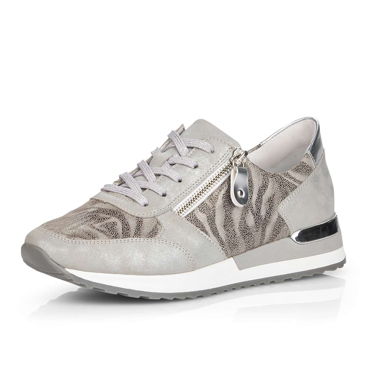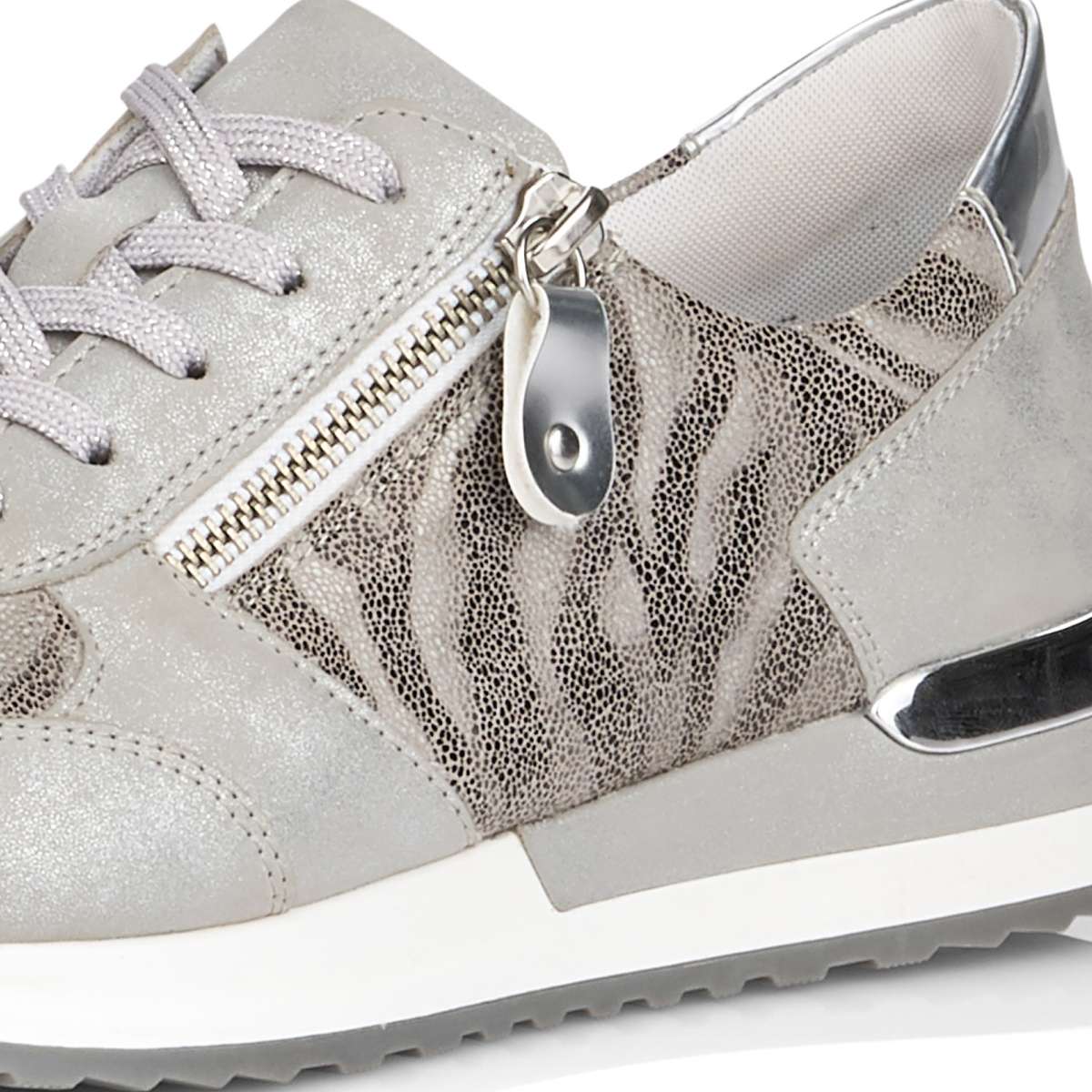 Obuv REMONTE je vyšší řadou značky RIEKER, obuv se vyznačuje kvalitou použitých materiálů, komfortnější šířkou a nadměrnými velikostmi. Tato dámská teniska Vás zaujme na první pohled svým jedinečným zpracováním. Propojení odlišných designových materiálů, jednoduché šněrování, zip na vnější straně či kontrastní podešev se stříbrnou ozdobou to jsou zdobné znaky této obuvi. Pro Vaše pohodlí na každém kroku je paměťová stélka vyjímatelná. Tato obuv bude dobře vypadat s jakýmkoliv outfitem.