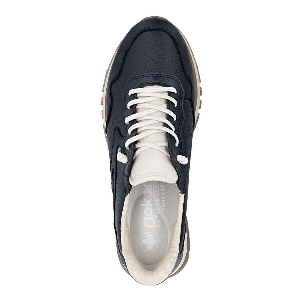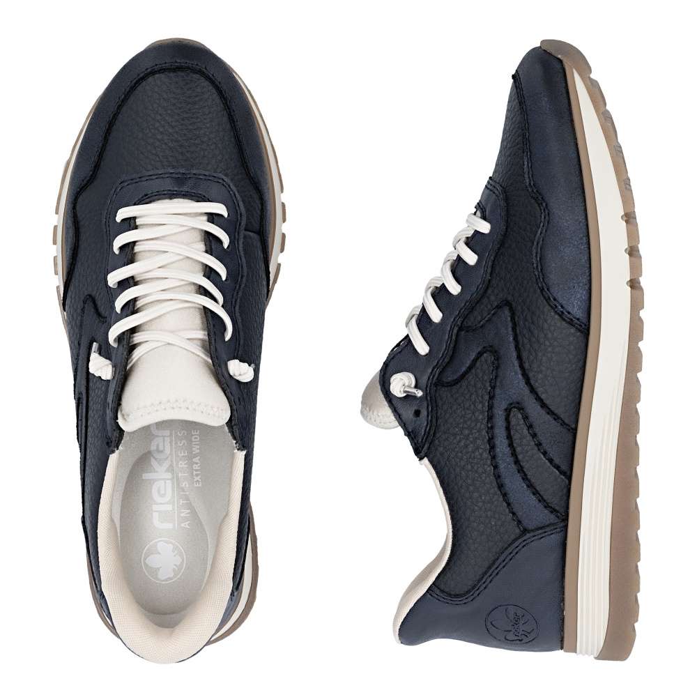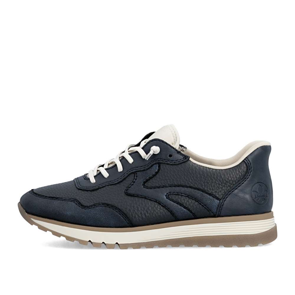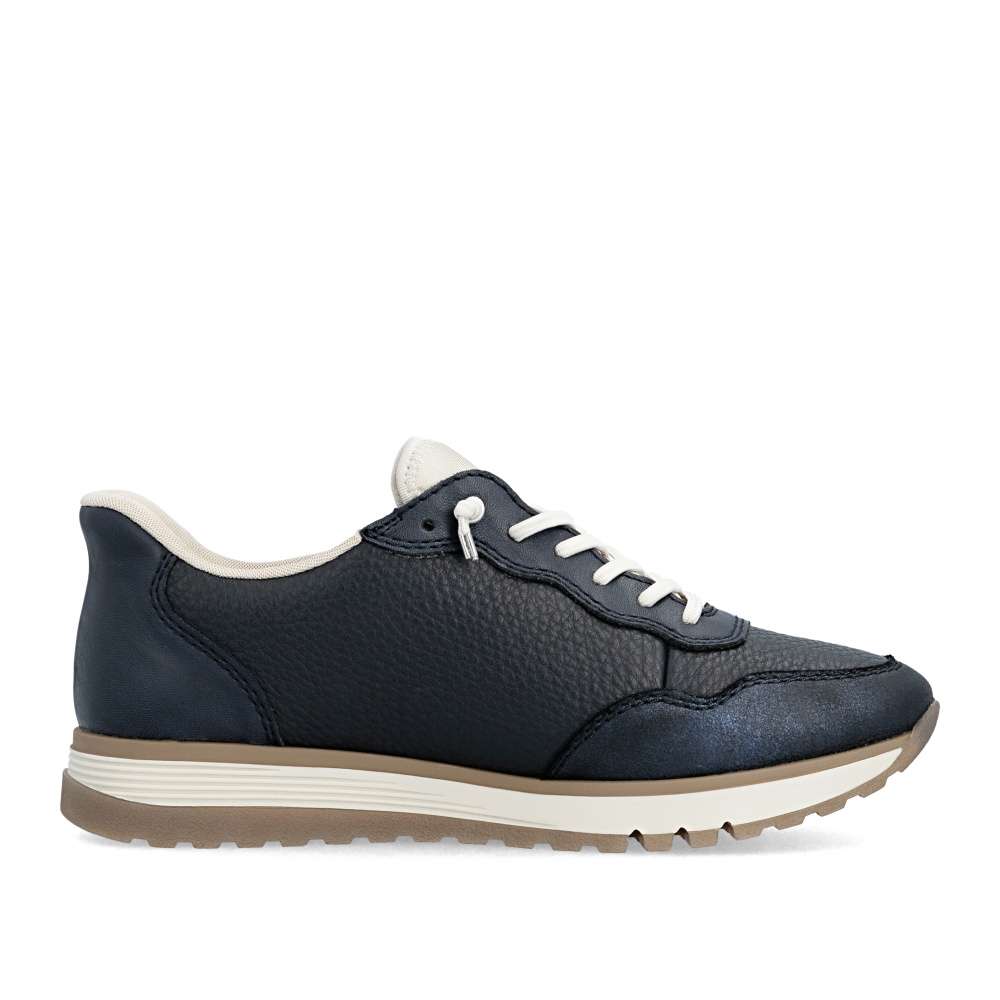 Tyto tenisky RIEKER dokazují, že sportovní obuv nemusí být jen praktická – může být také stylová. Tmavě modrý svršek s působivými liniemi a světlý odstín na nártu vytváří moderní a svěží kontrast, který okamžitě upoutá pozornost. Namísto šněrování je pružná gumička usnadňující nazutí a vyjímatelná stélka svou měkkostí vytvoří dokonalý komfort při nošení. Podešev s propracovaným designem tlumí nárazy a zajistí pohodlí po celý den – ať už jste na procházce, ve městě nebo na rychlém výletu.