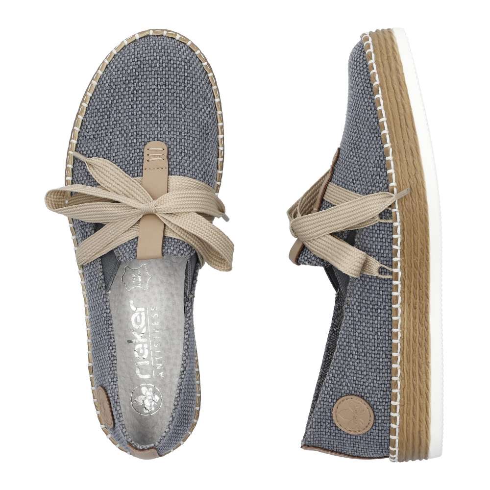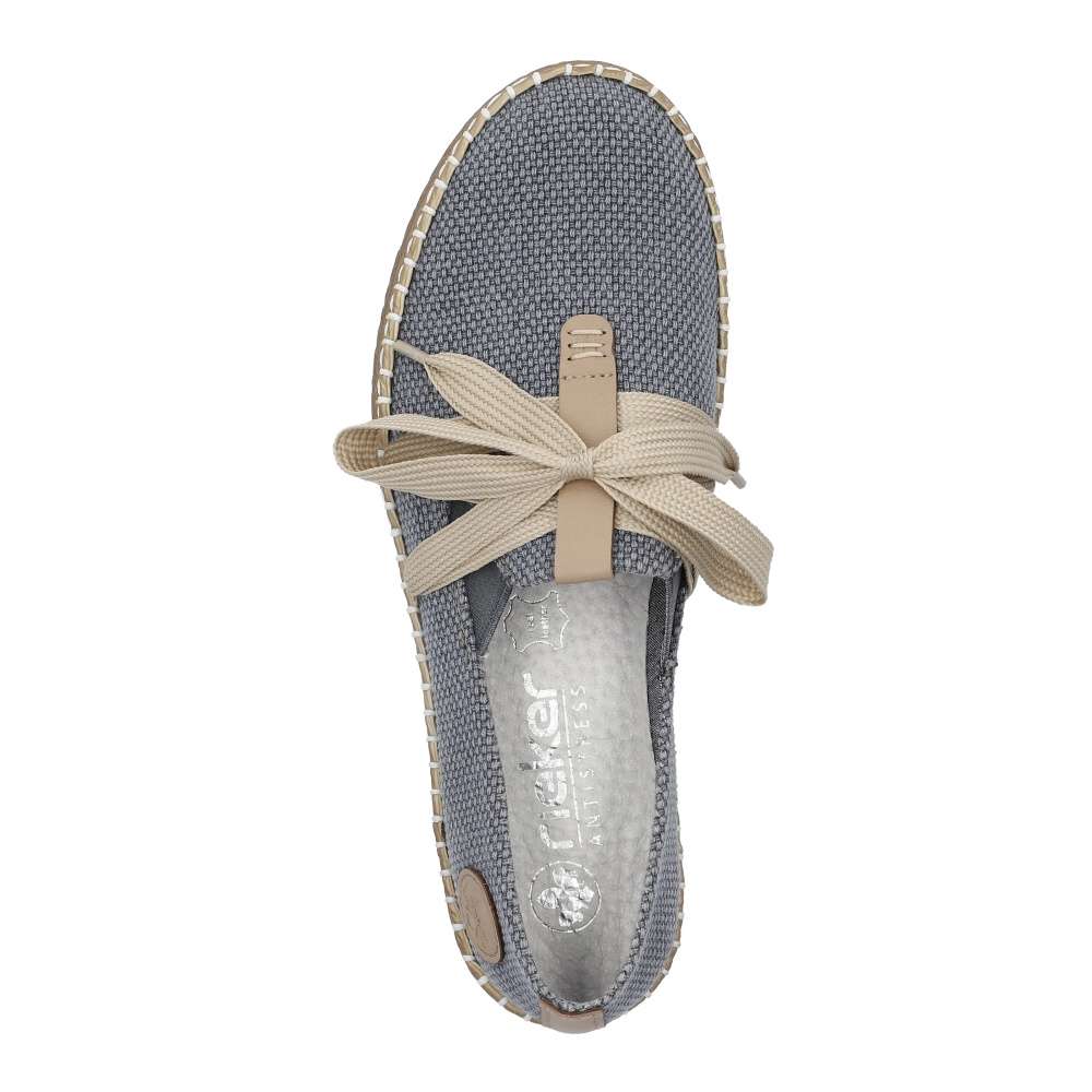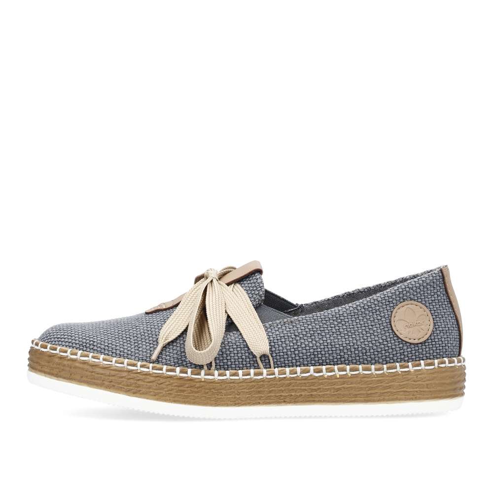 Plátěné mokasíny Vás osloví díky zdobným prvkům v podobě mašle z tkaniček a decentního loga značky RIEKER. Pružné gumičky po stranách skvěle napomůžou Vašemu obutí. Jistě také oceníte měkkou stélku z přírodní usně, která dodá běžné chůzi pohodlnost a komfort. Dámský model, se kterým si můžete vyrazit například na procházku do parku. Technologie: Antistress – podešev je díky této technologii lehká, flexibilní, absorbuje nárazy při došlapu a snadno se přizpůsobí každé noze.