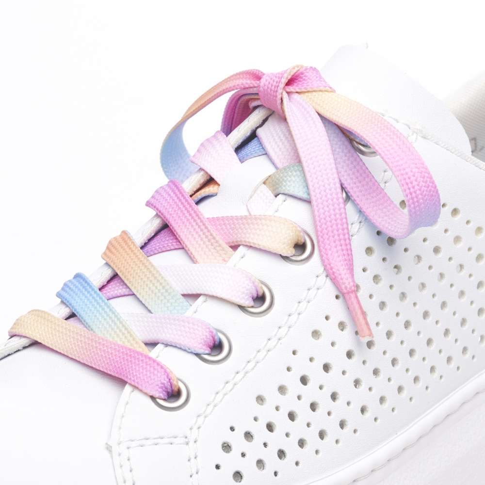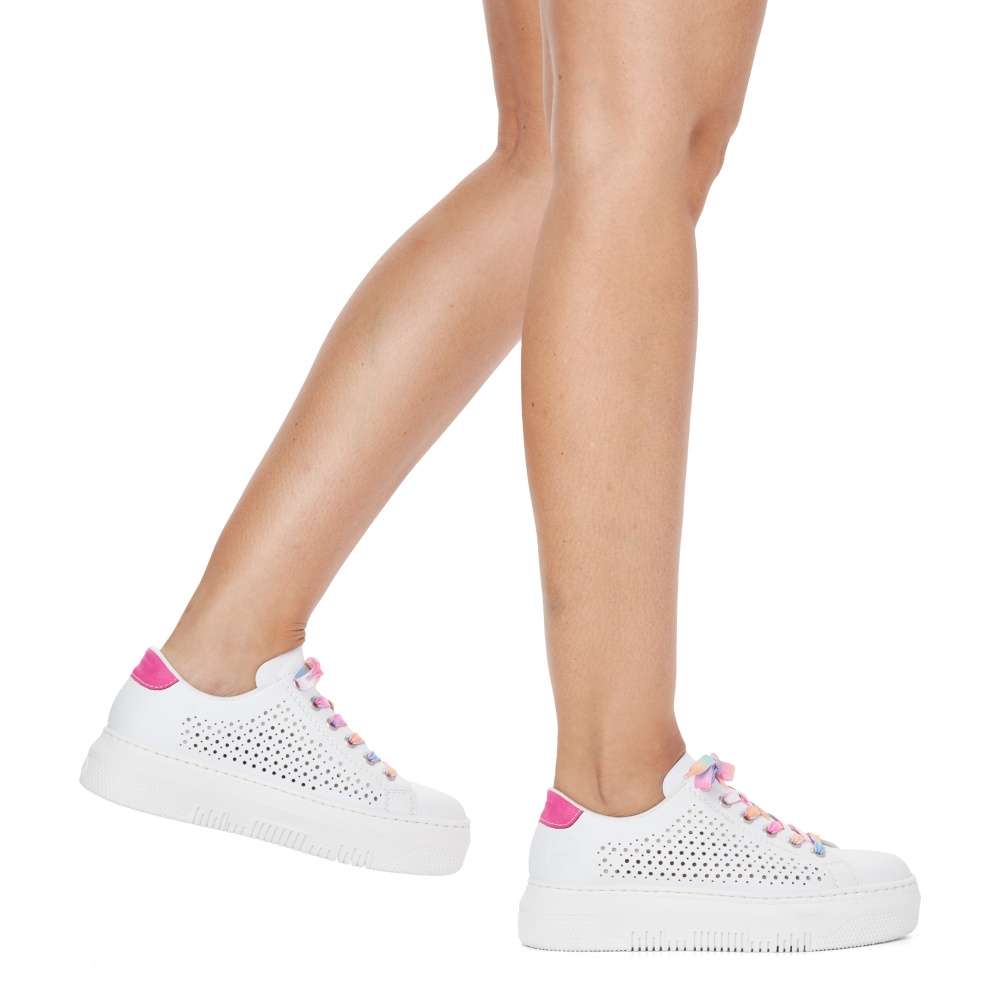 Hledáte boty, které budou stejně barevné jako je konečně jaro a léto? Tak nutně potřebujete tyto jedinečné tenisky, které budou Vašim dokonalým doplňkem. Bílý perforovaný svršek, jenž na patě má zářivě růžový detail v kombinaci s barevnými tkaničkami se postarají o pozornost Vašeho okolí. Dodají každému Vašemu outfitu šmrnc a díky měkké stélce z kůže navíc i pohodlí. V těchto teniskách Vás nikdo nepřehlédne a bude se ptát, kde jste je zakoupila. Navíc v nich budete v létě naprosto spokojená, protože bota je krásně vzdušná. Tento model musíte mít! Technologie: Antistress – podešev je díky této technologii lehká, flexibilní, absorbuje nárazy při došlapu a snadno se přizpůsobí každé noze.