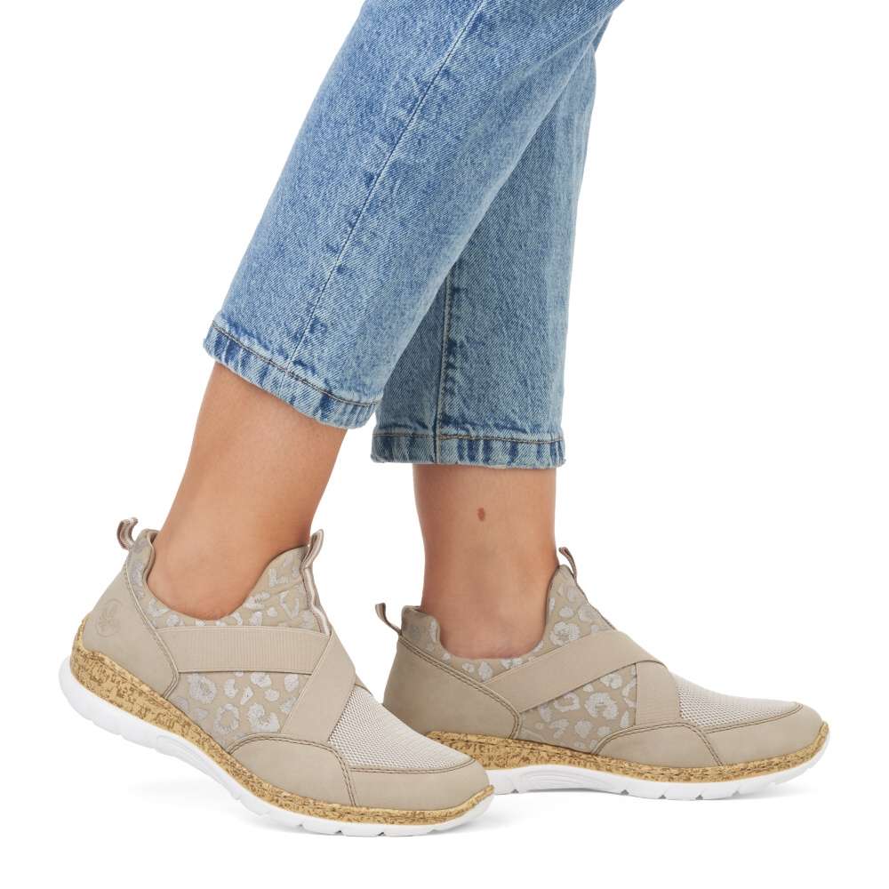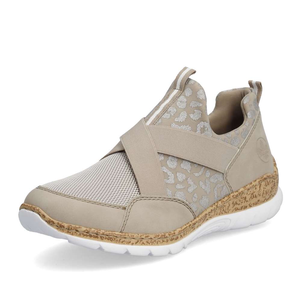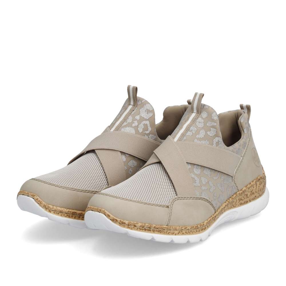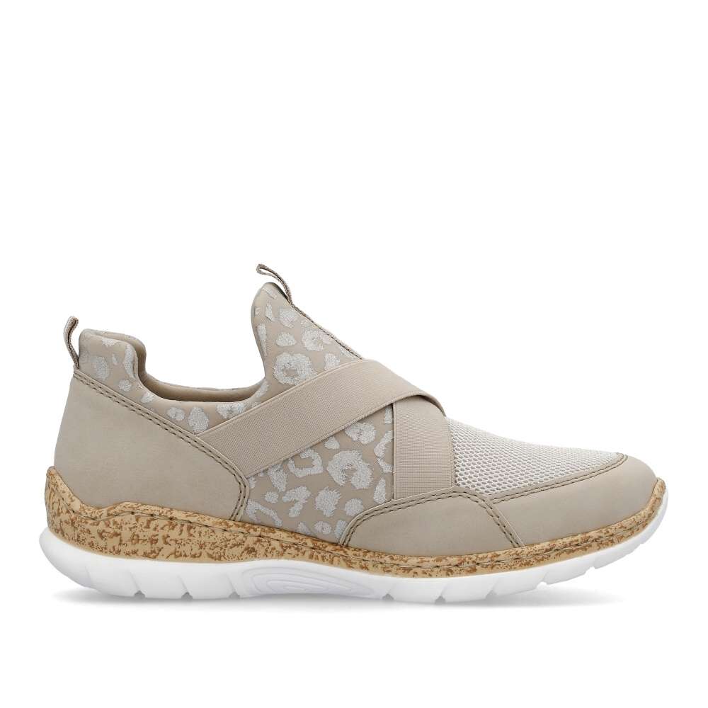 Detailní informace Tento model značky RIEKER bude Vaším skvělým společníkem na procházkách městem. Béžový svršek je ve střední části ozdoben nápadným stříbrným zvířecím vzorem a špička obuvi je vyrobena z prodyšného textilního materiálu. O dokonalé přilnutí obuvi se postará nejen pružný textilní materiál ale také zkřížené gumičkové pásky na nártu. Unikátní textilní stélka z paměťové pěny změkčí došlap a přizpůsobí se tvaru Vašeho chodidla. Podešev v horní části s imitací korku je vyrobená s technologií Antistress díky níž je lehká a flexibilní. Díky snadnému nazouvání se tato obuv stane Vaší neoblíbenější.