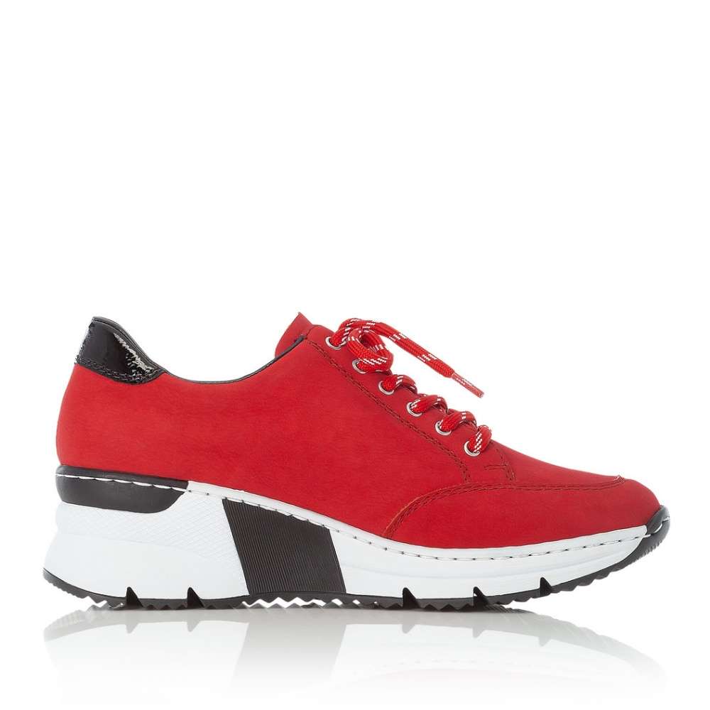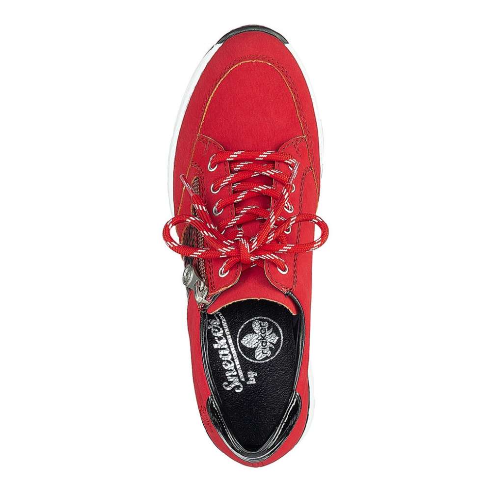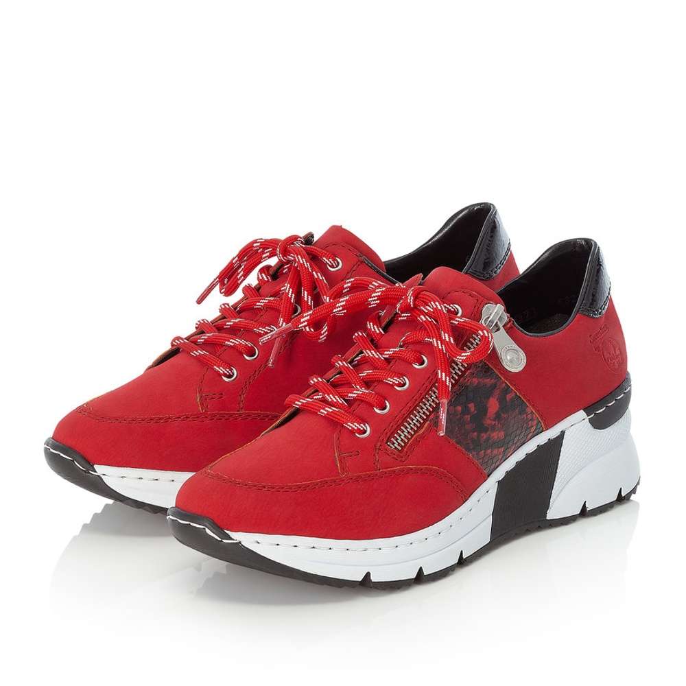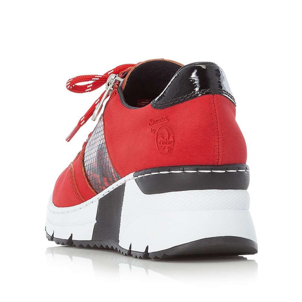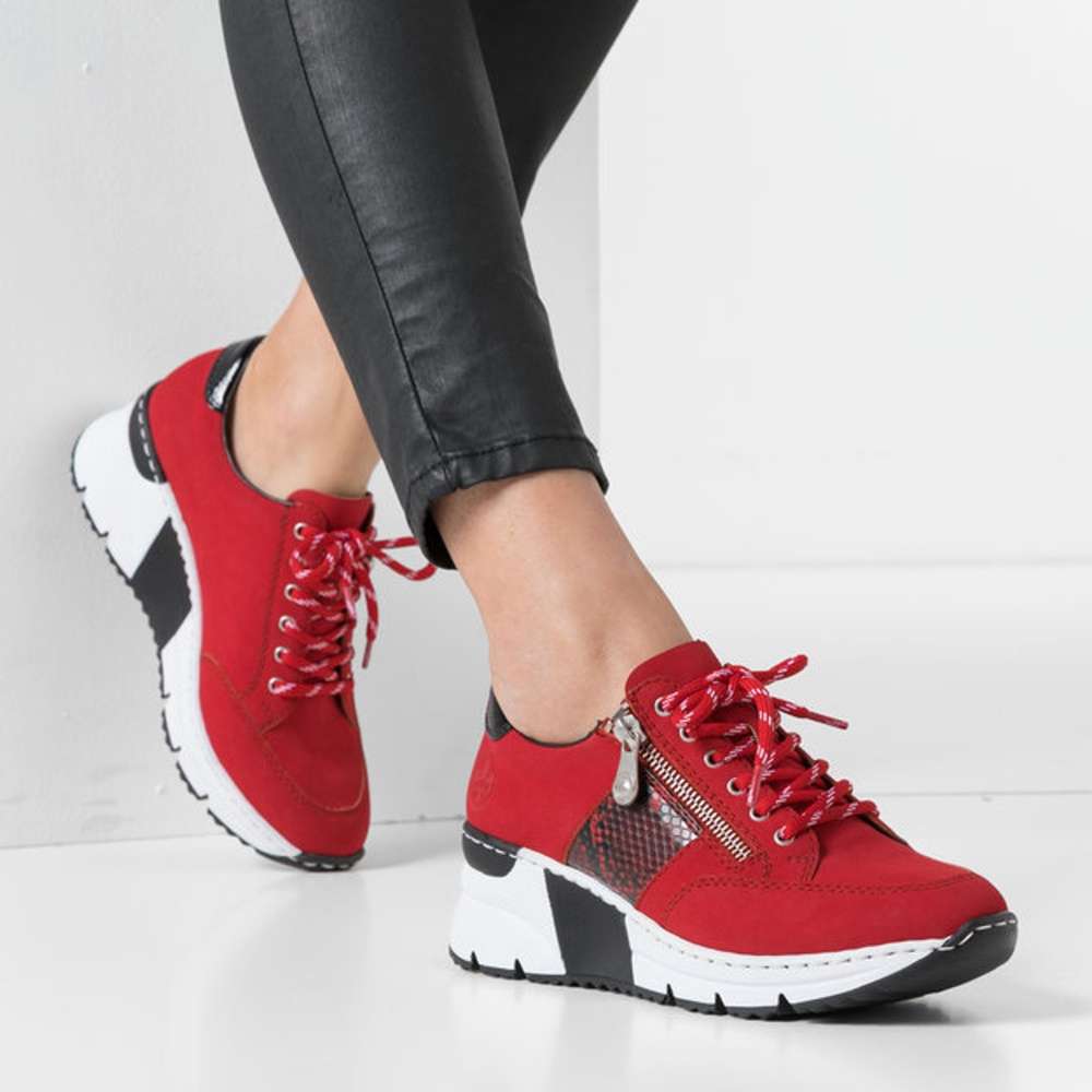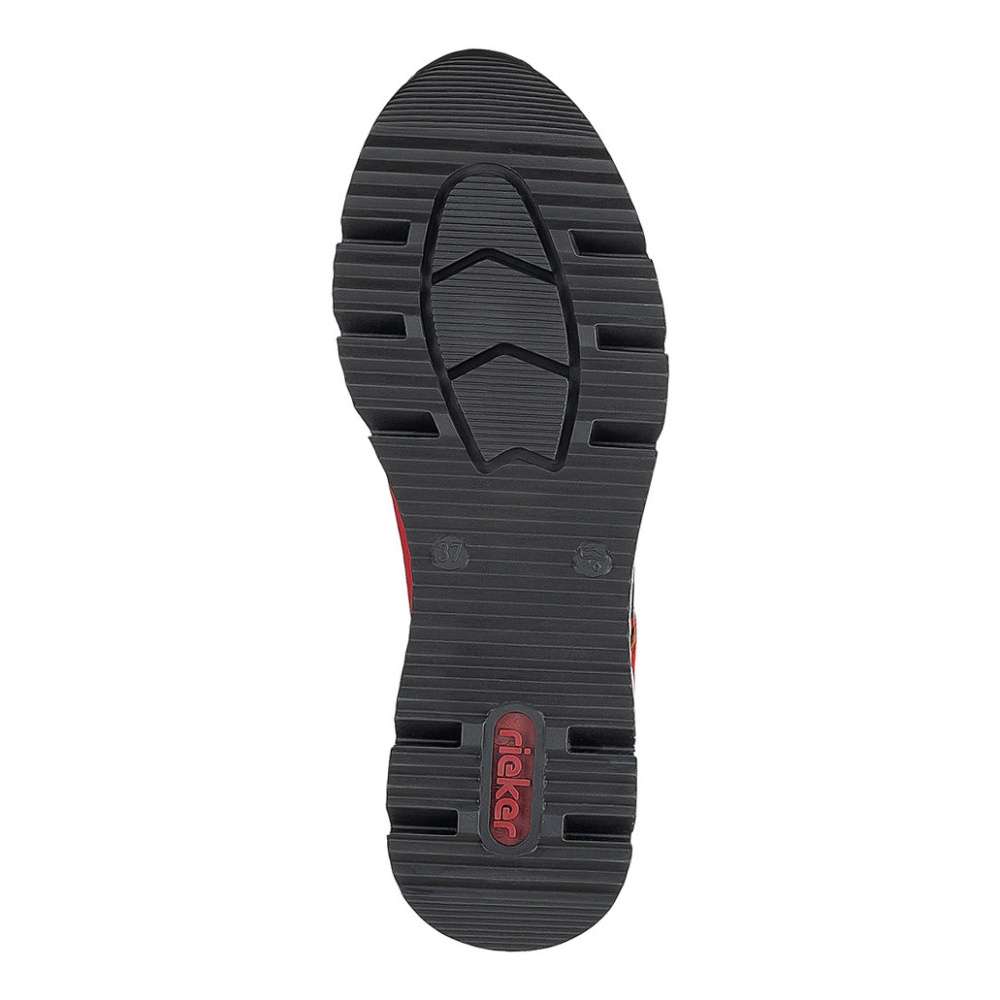Dámské tenisky značky Rieker jsou výrazně ozdobeny červenou barvou svršku doplněnou kontrastními prvky a vyšší designovou podešví. Nejen že jsou nesmírně pohodlné a vydržíte v nich ve městě klidně i celý den, ale navíc vypadají naprosto famózně. Barevně sladěné tkaničky Vám pomohou při úpravě obuvi přímo k Vaší noze. Pevná podešev s jemným vzorkem bude společně s technologií Antistress ideálním partnerem na delší pochůzky.