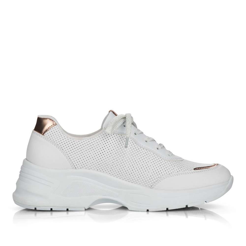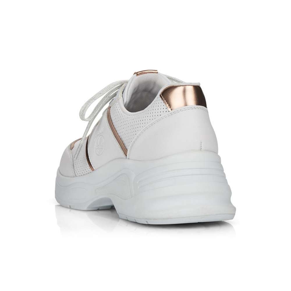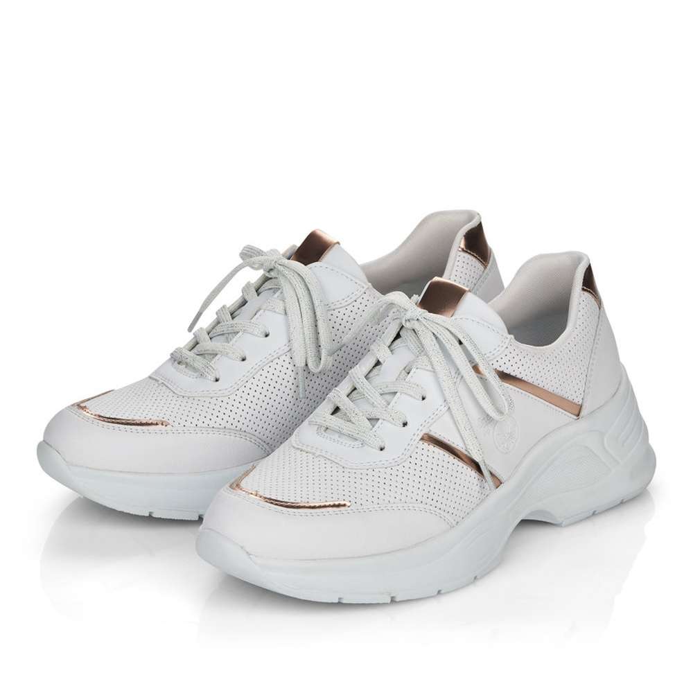 Bílý hladký svršek je ozdoben částmi v měděné barvě, vytlačeným logem značky a povrchovou perforací po stranách obuvi a na špičce. Šněrováním žíhanými tkaničkami si obuv přizpůsobíte dle svých požadavků.