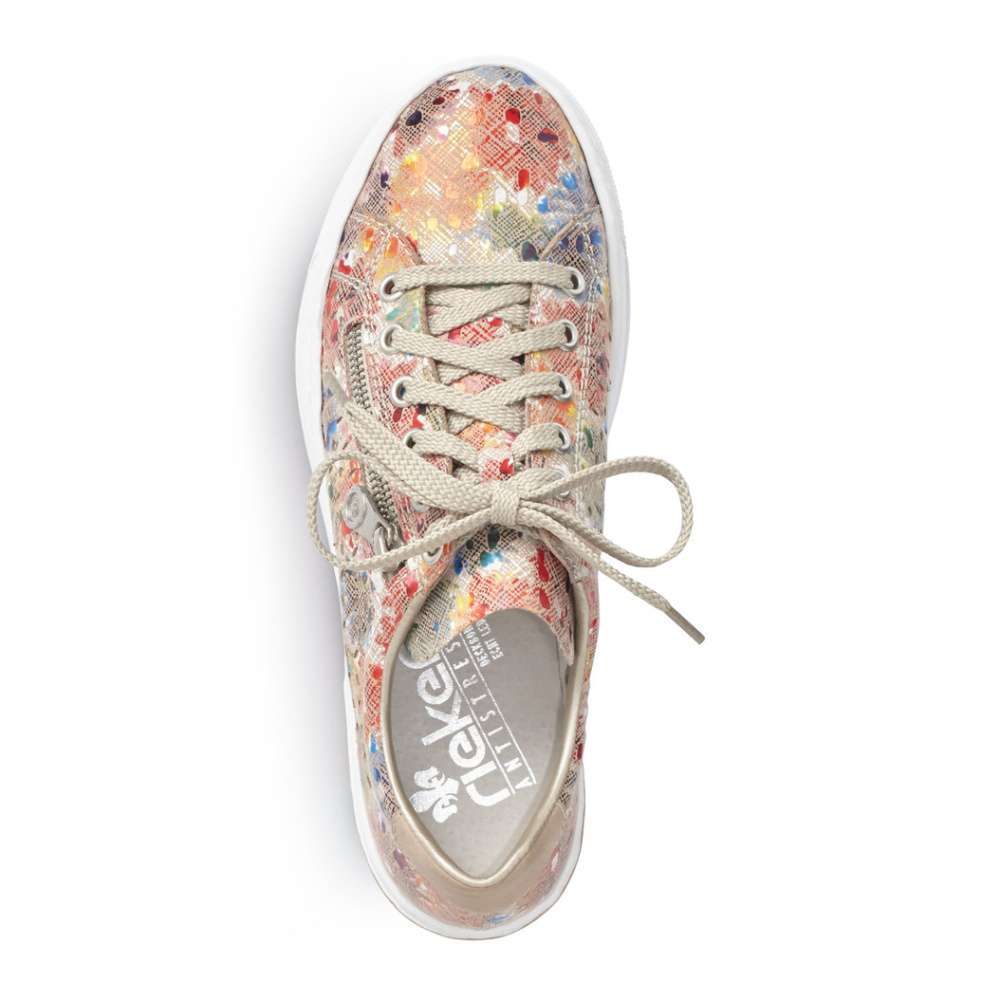 Výrazné dámské tenisky od značky RIEKER se zdobným zipem na vnější straně a barevným svrškem. Díky tkaničkám na šněrování si obuv můžete upravit přesně podle Vašich představ. Jistě také oceníte měkkou stélku z přírodní usně, která dodá běžné chůzi pohodlnost a komfort. Tato obuv se bude skvěle kombinovat jak s šaty, tak kalhotami.