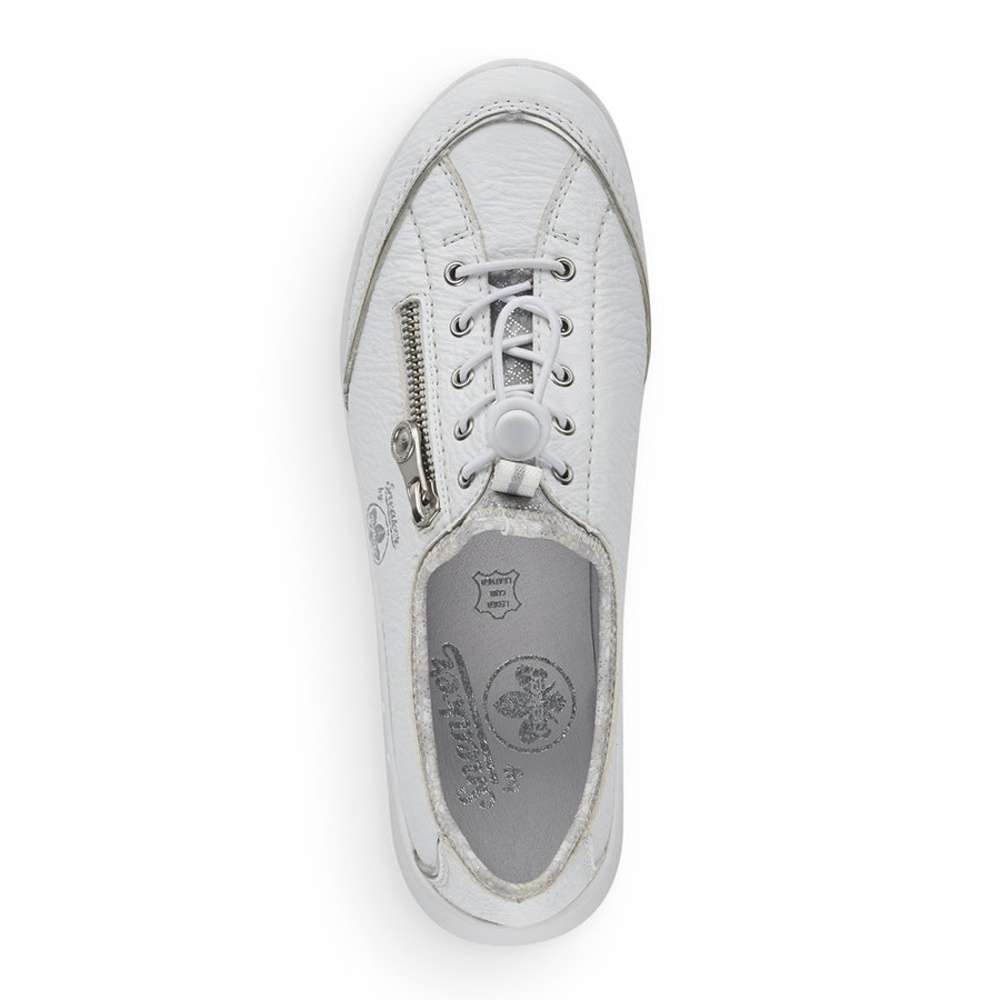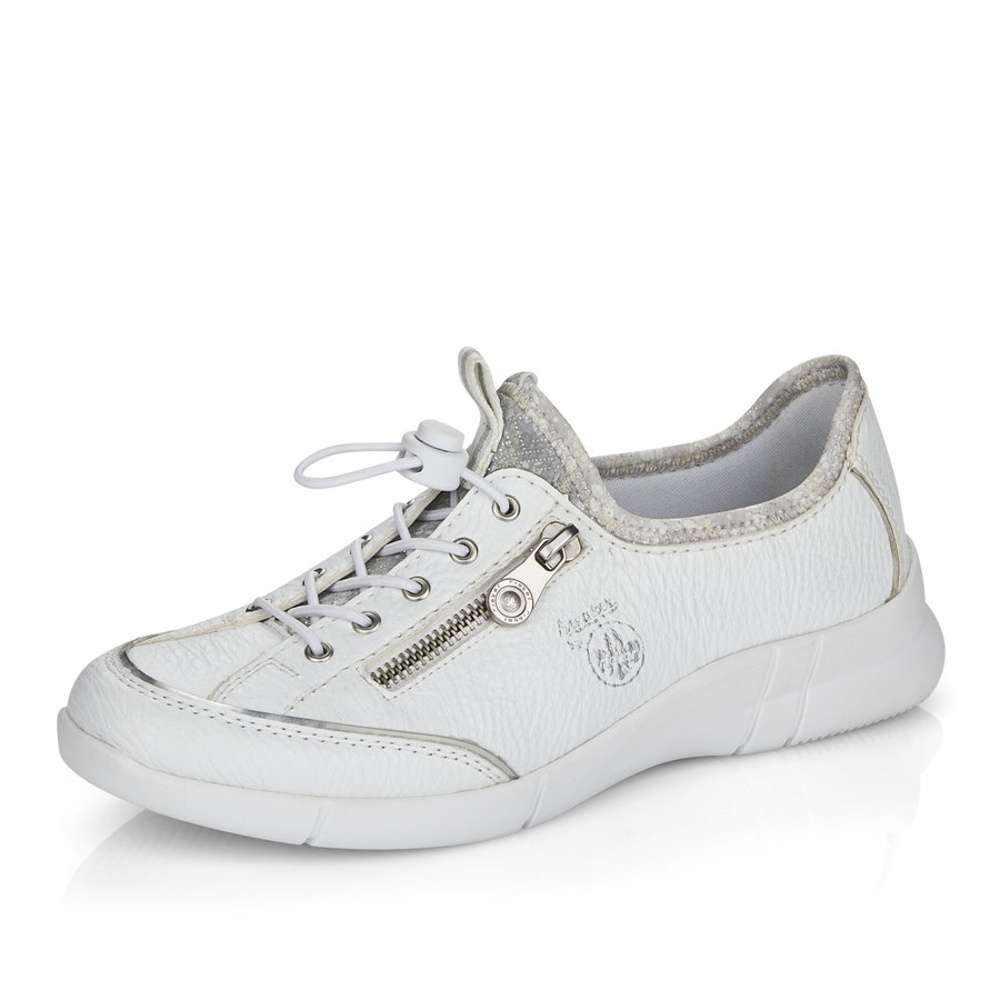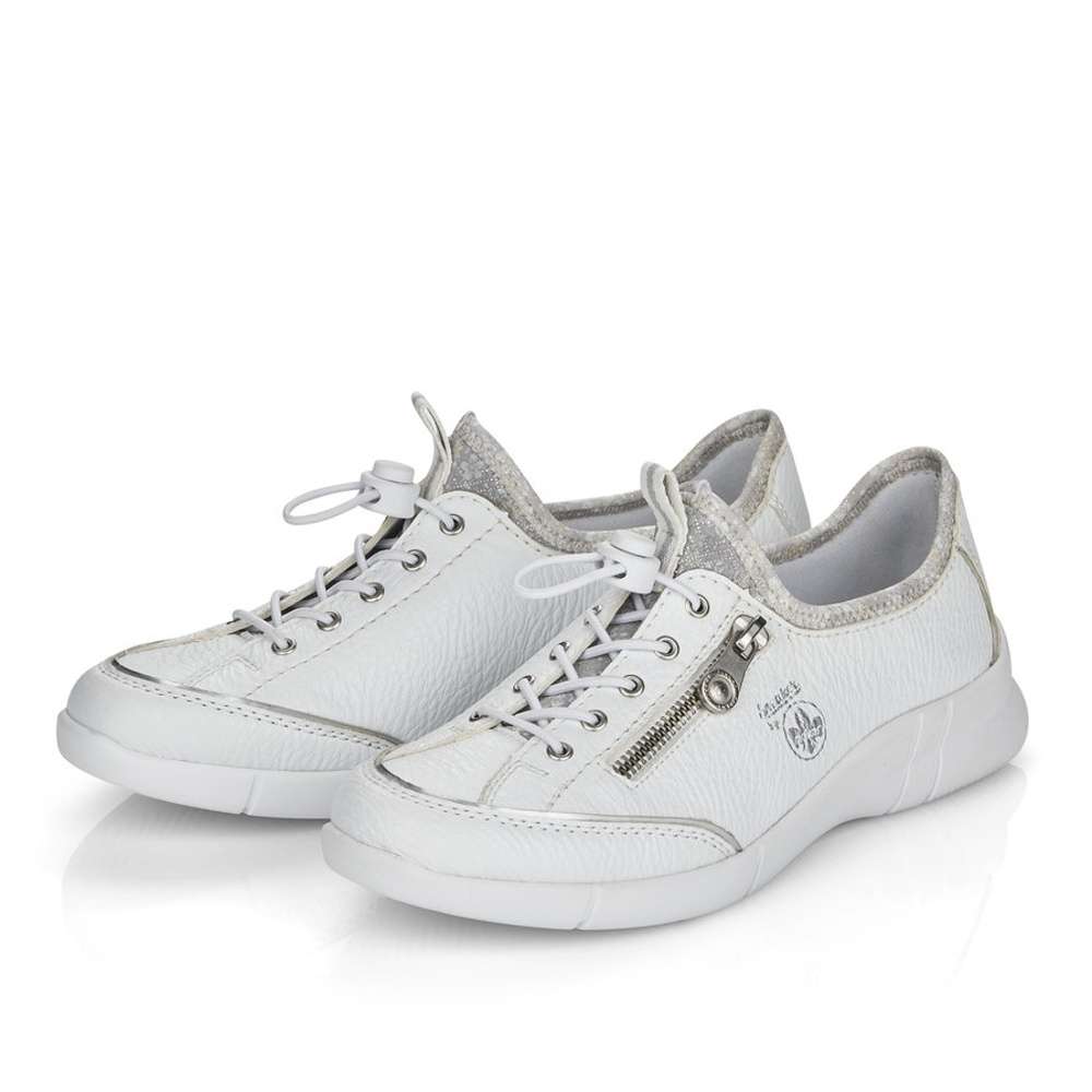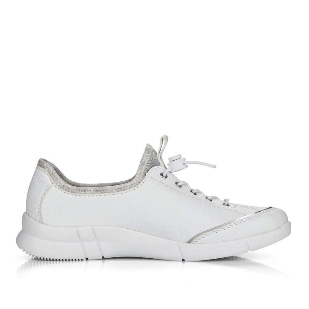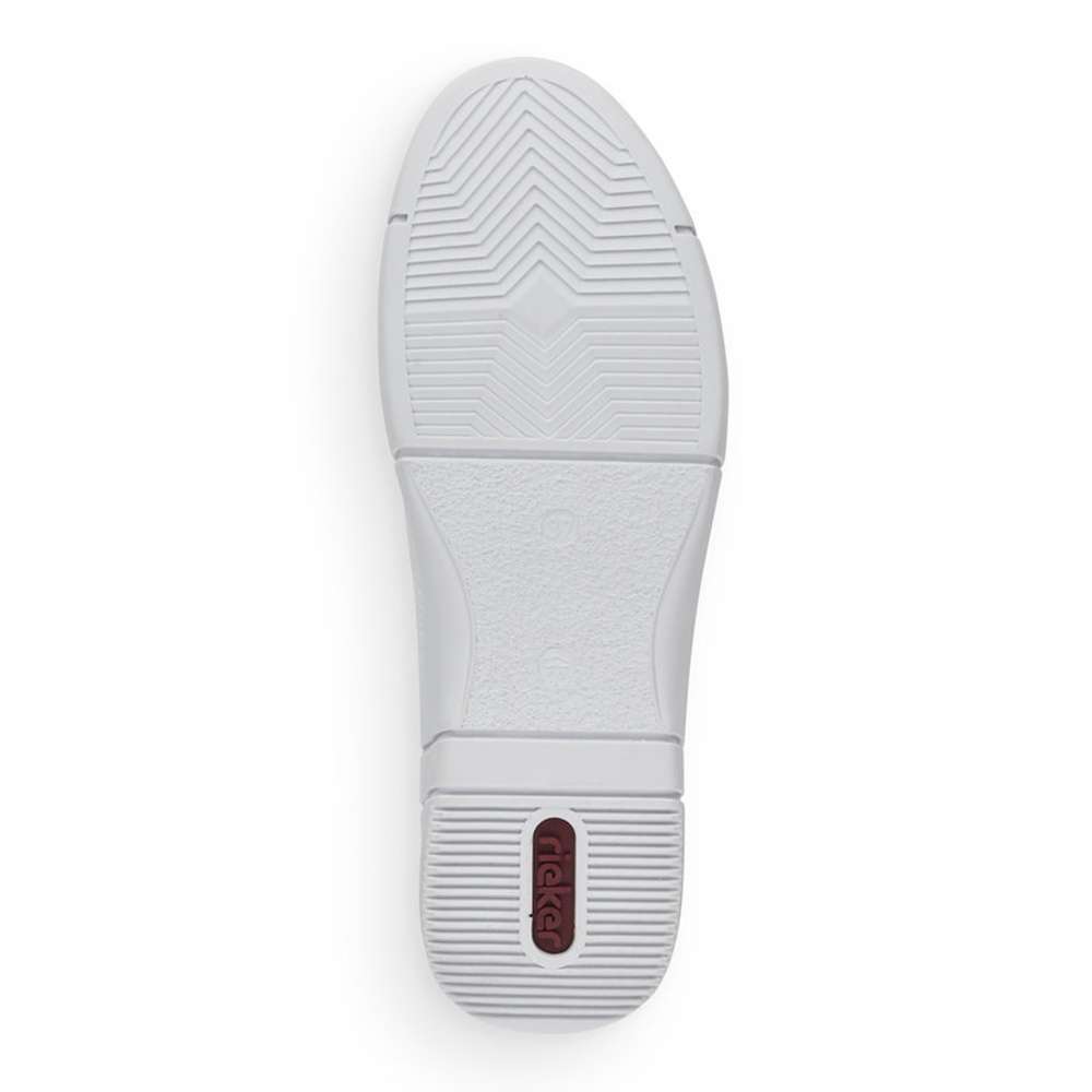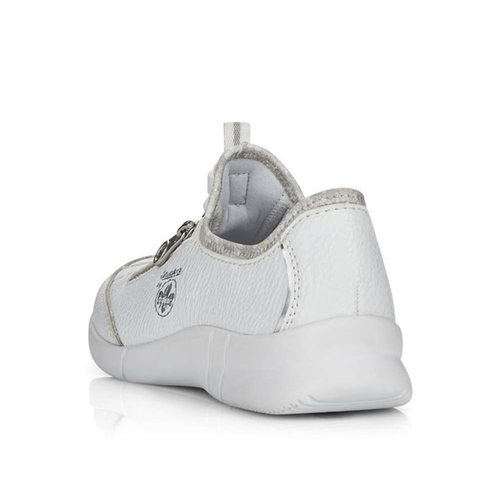 Zdánlivě jednoduchý, ale zároveň stylový model značky RIEKER v bílé barvě je lehce kombinovatelný. Doplněn je o decentní lesklé lemování na špičce a dalšími zdobnými prvky jsou zde jemné logo značky a zip z vnější strany. Pro snadné obutí slouží šněrování pomocí pružných gumiček, které lze decentně utáhnout. Udělejte radost sobě nebo potěšte tímto úžasným kouskem Vaše blízké. Technologie: Antistress – podešev je díky této technologii lehká, flexibilní, absorbuje nárazy při došlapu a snadno se přizpůsobí každé noze.