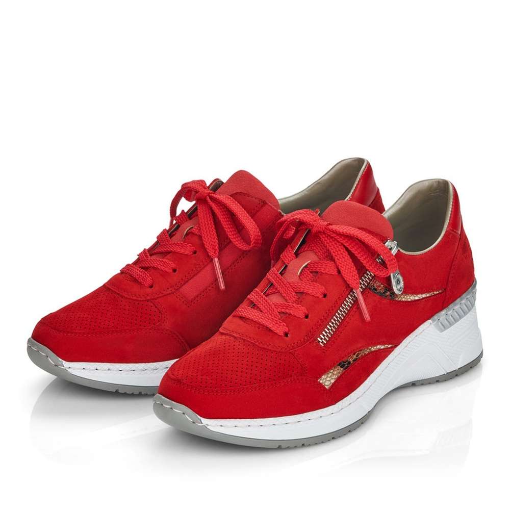 Červené tenisky od značky Rieker s částečnou perforací, která neprochází celou tloušťku materiálu jsou ozvláštněny o hadí detaily. Obutí Vám usnadní funkční zip a pružná vsazená gumička po boku.