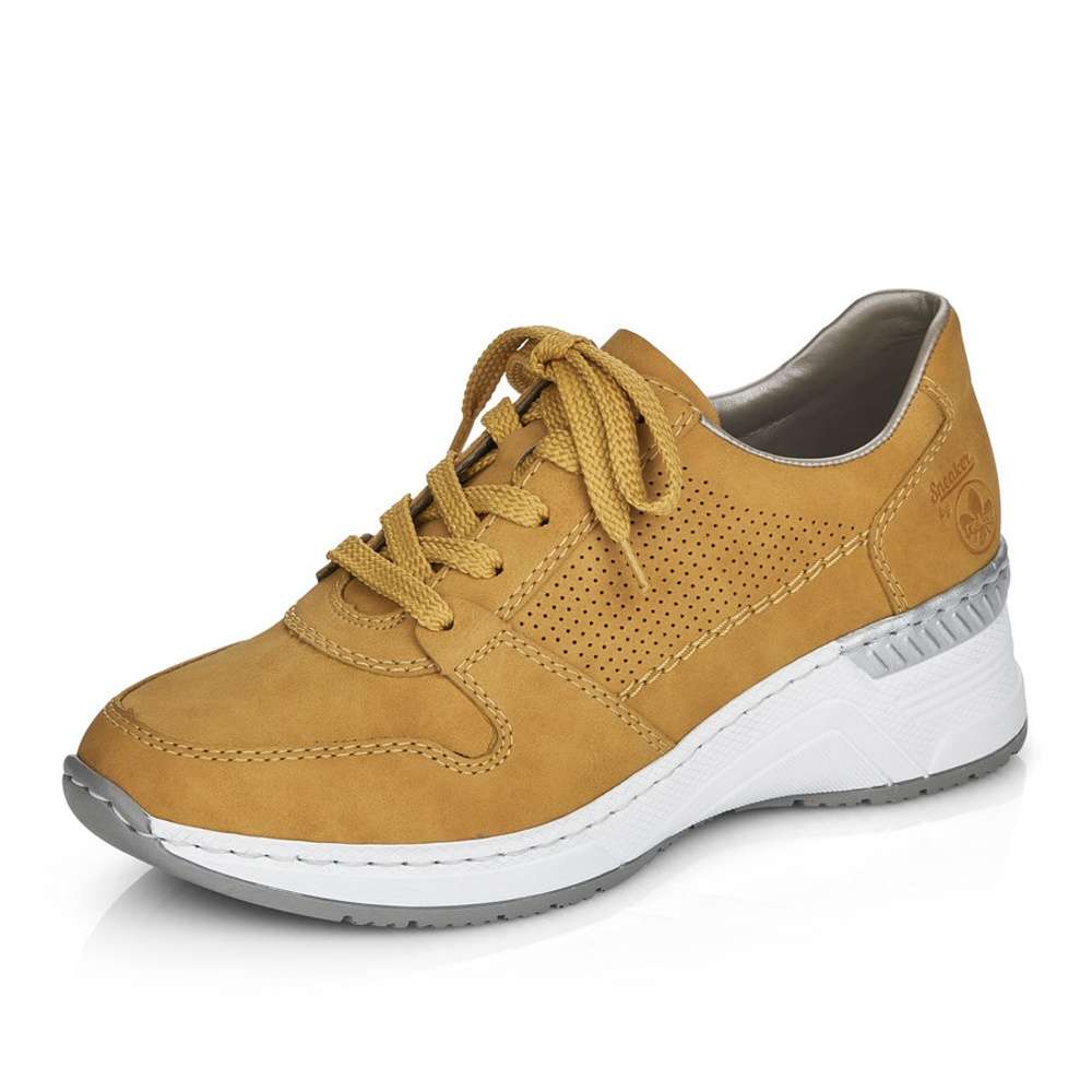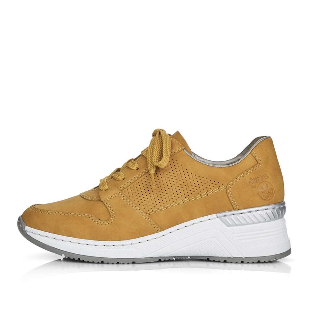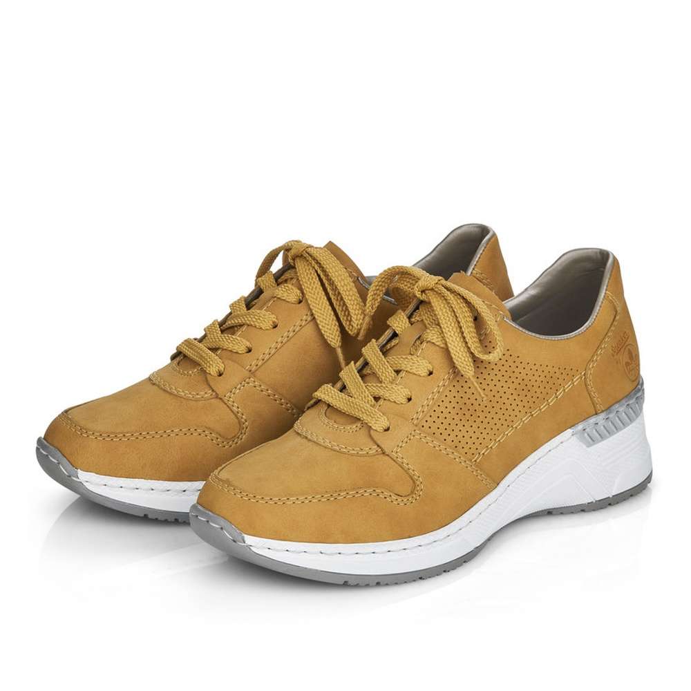 Detailní informace Exkluzvní tenisky od značky RIEKER s částečně perforovaným svrškem vyrobeným z imitace přírodní usně v krásné okrové barvě. Pro snadné obutí poslouží tkaničky na šněrování a pohodlná vyjímatelná stélka zajistí celodenní komfort. Tento model s vyšší podešví rozzáří každý z Vašich dnů.