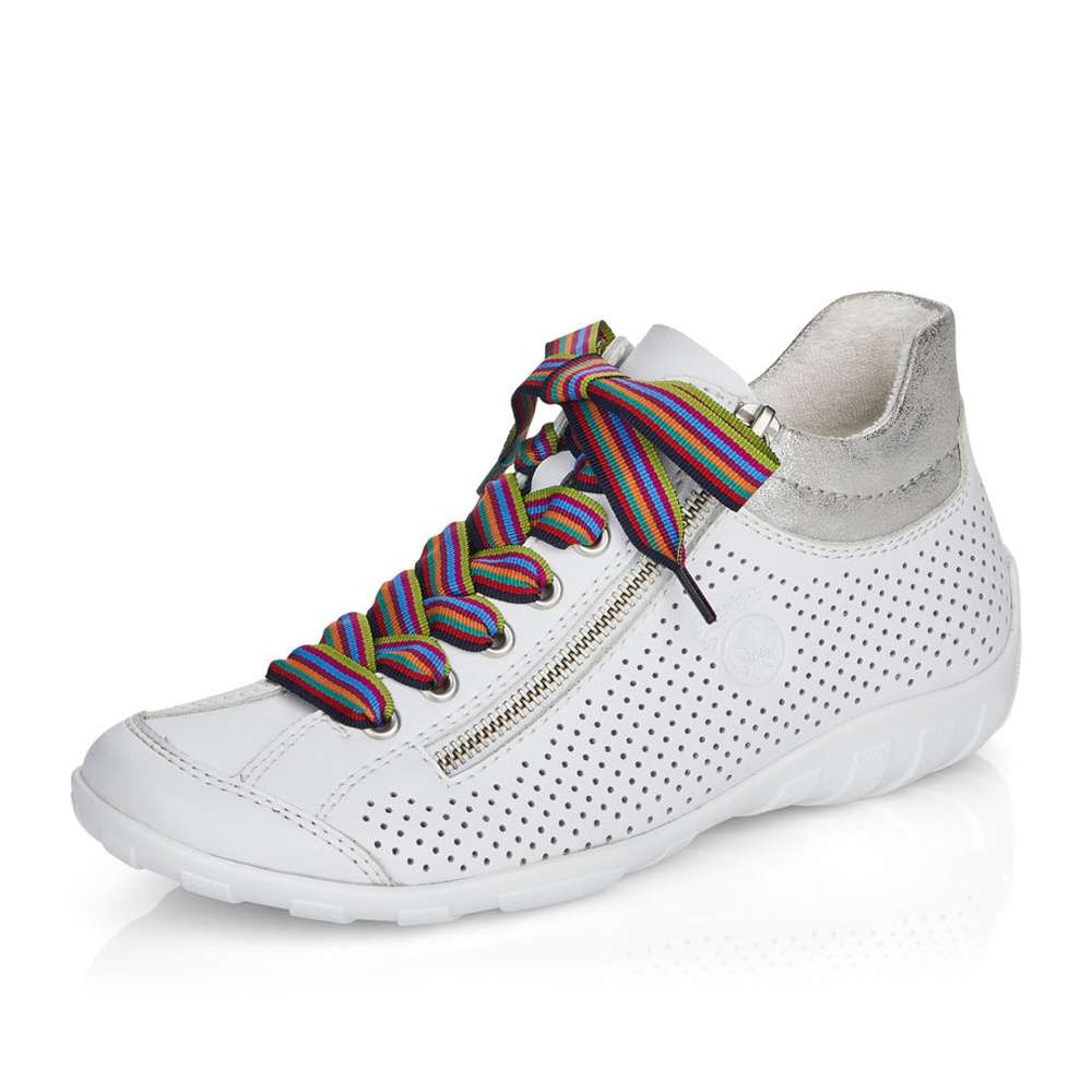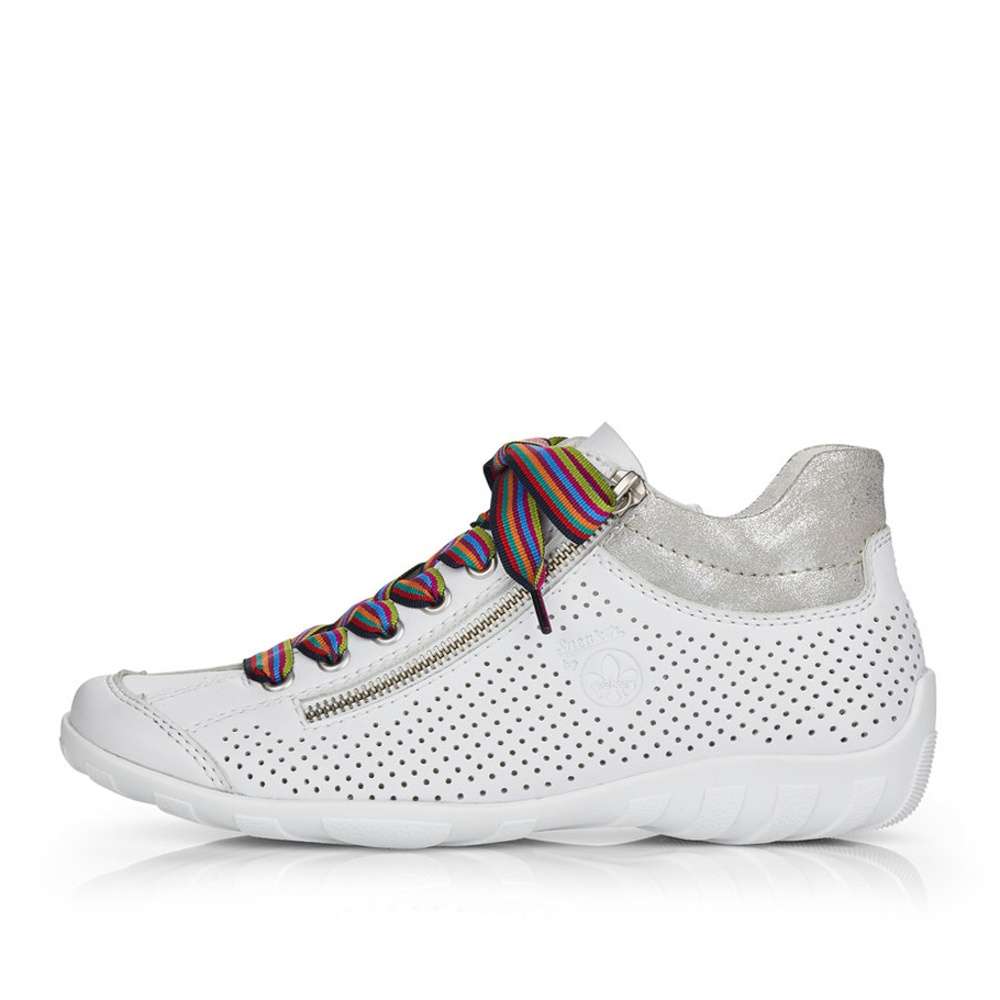 Bílý svršek je ozdoben perforací, která zajistí odvětrávání a šněrováním barevnými tkaničkami, které obuv dodají ten správný šmrnc. Snadno si obuv nazujete díky funkčnímu zipu na vnitřní straně.