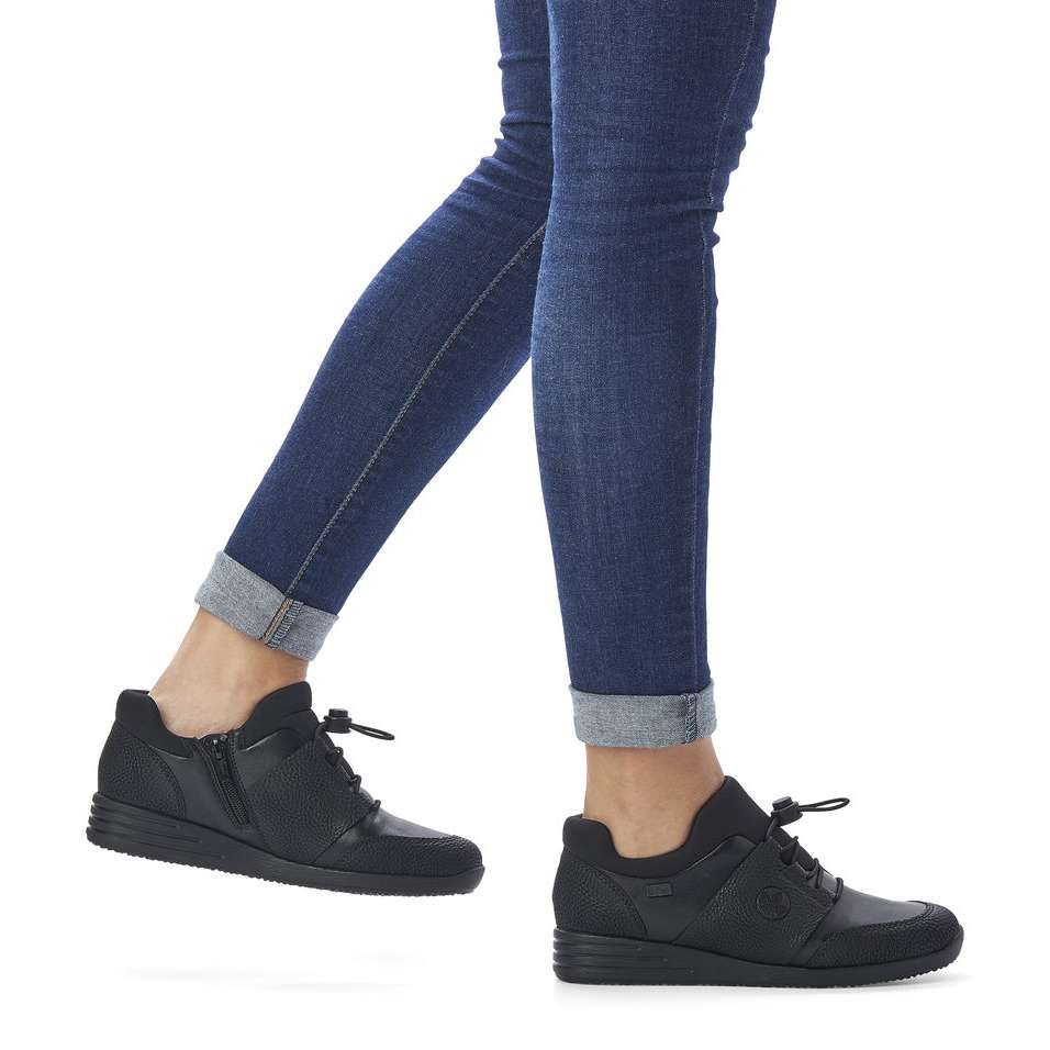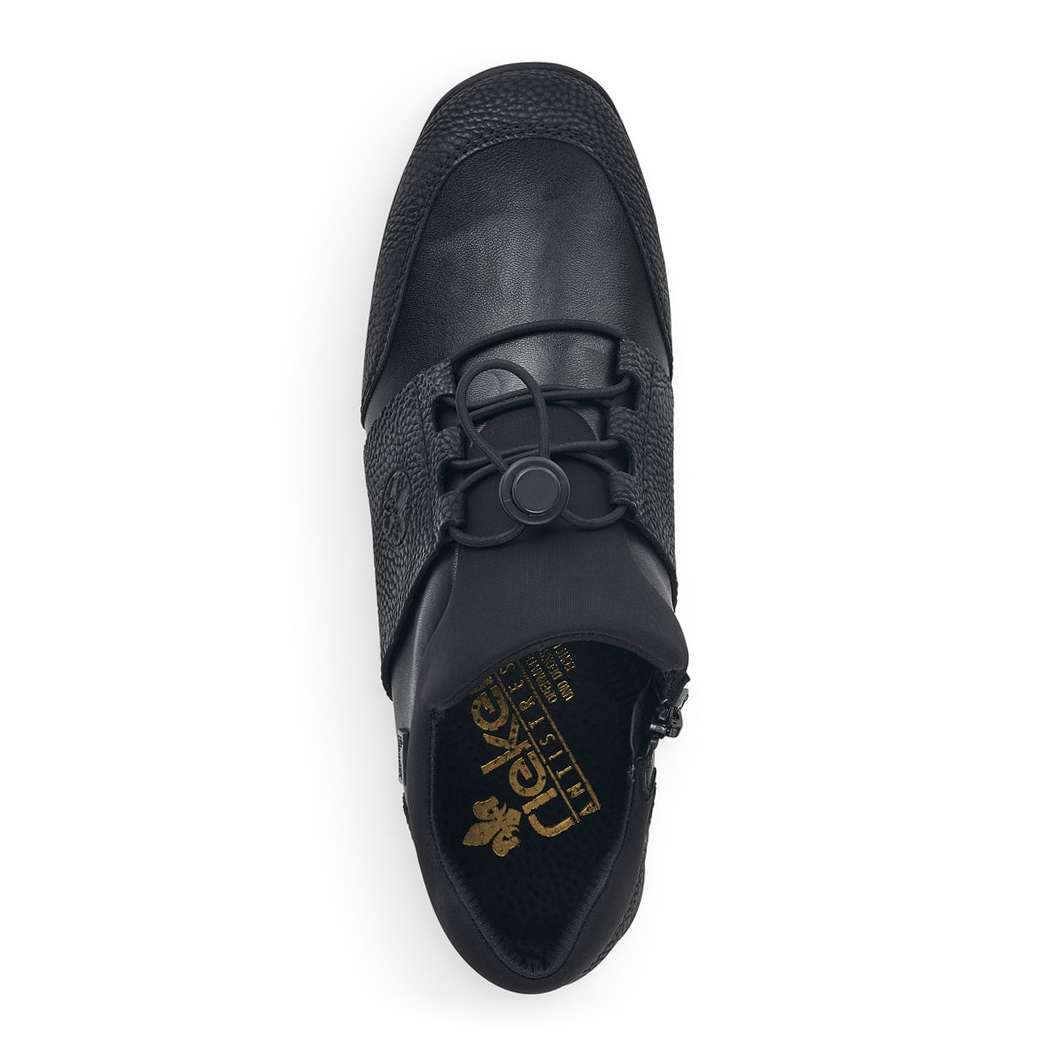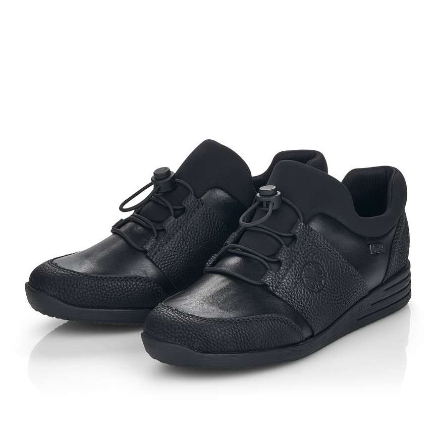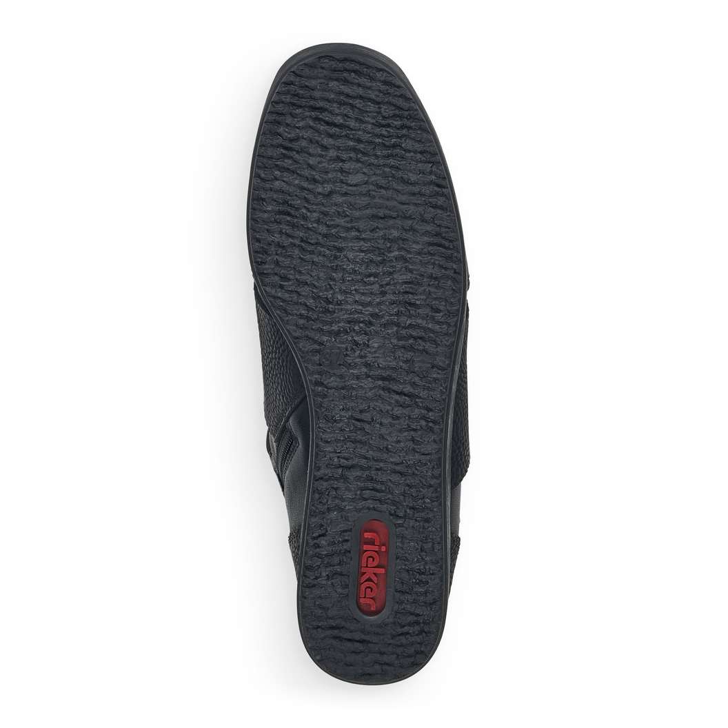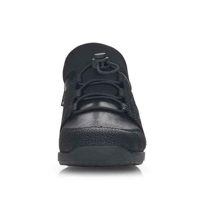 Kožený svršek je designově poskládán z hladkých a strukturovaných částí a kolem horního okraje je doplněn pružnou textilní částí. Membrána Rieker TEX se postará o nepromokavost obuvi a snadné nazouvání a přizpůsobení zajistí zip z vnitřní strany a šněrování pružnou gumičkou s jednoduchým stahovacím systémem.