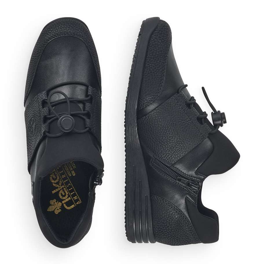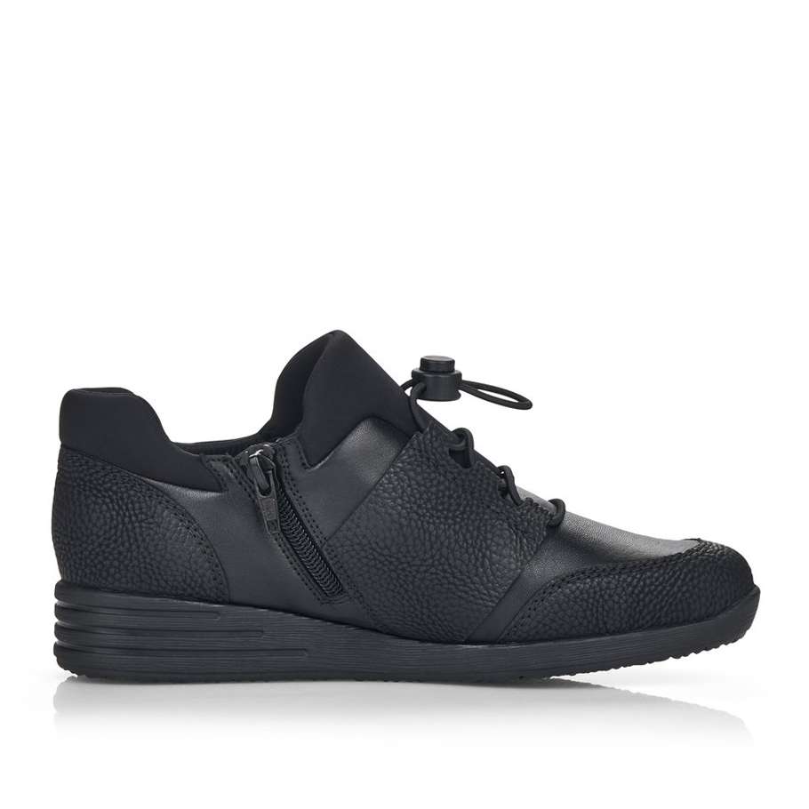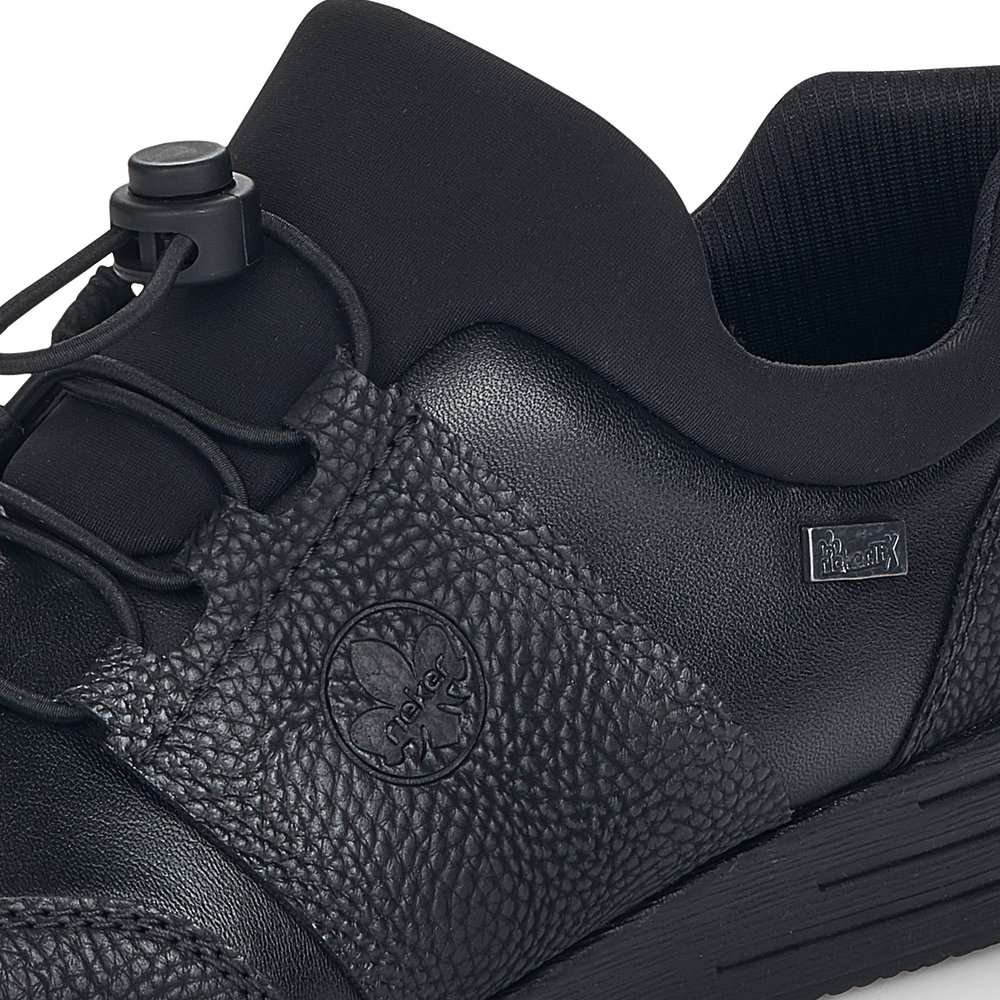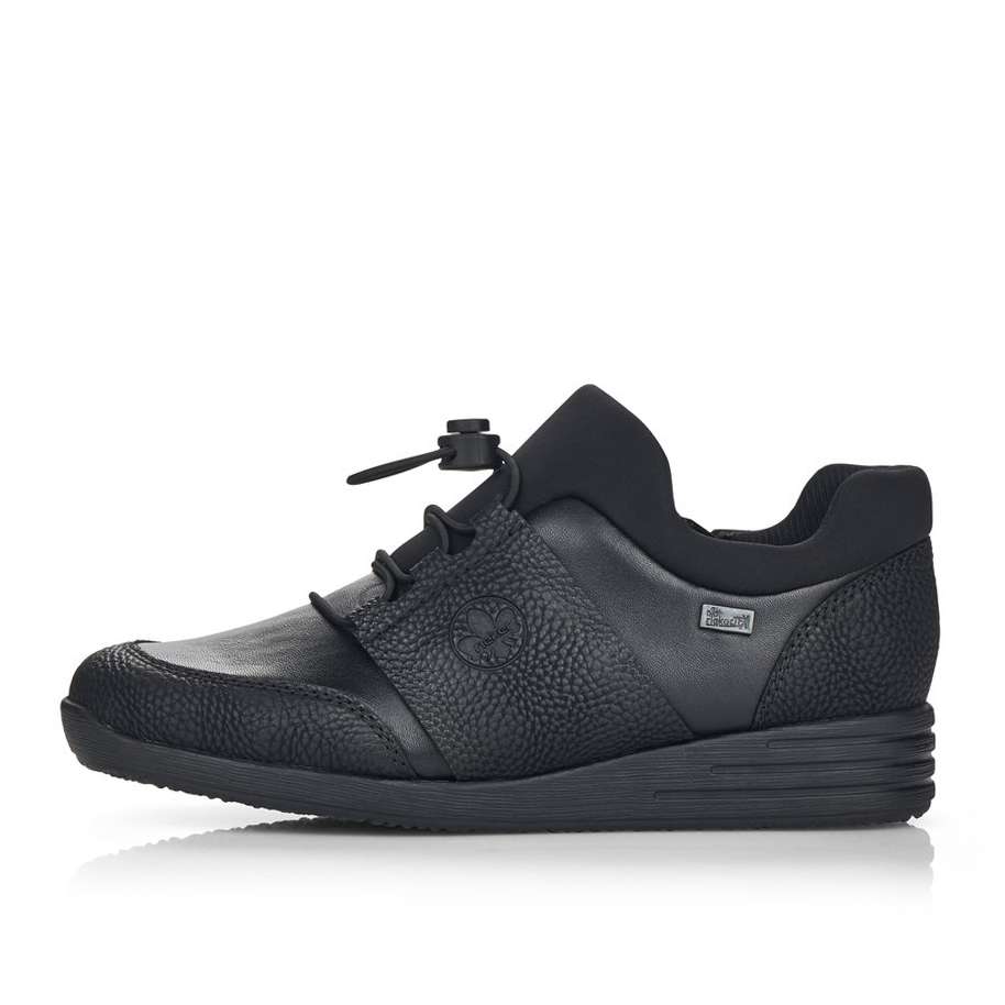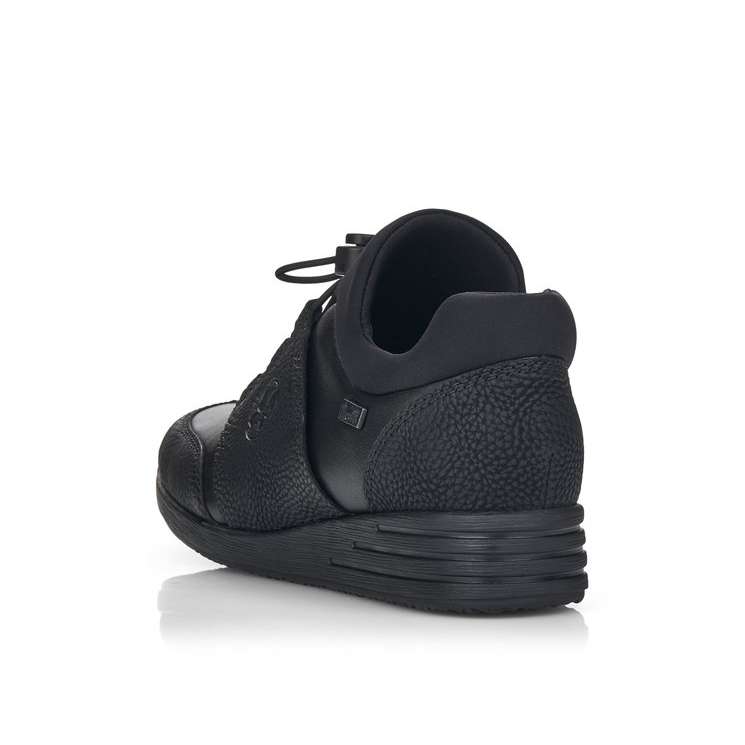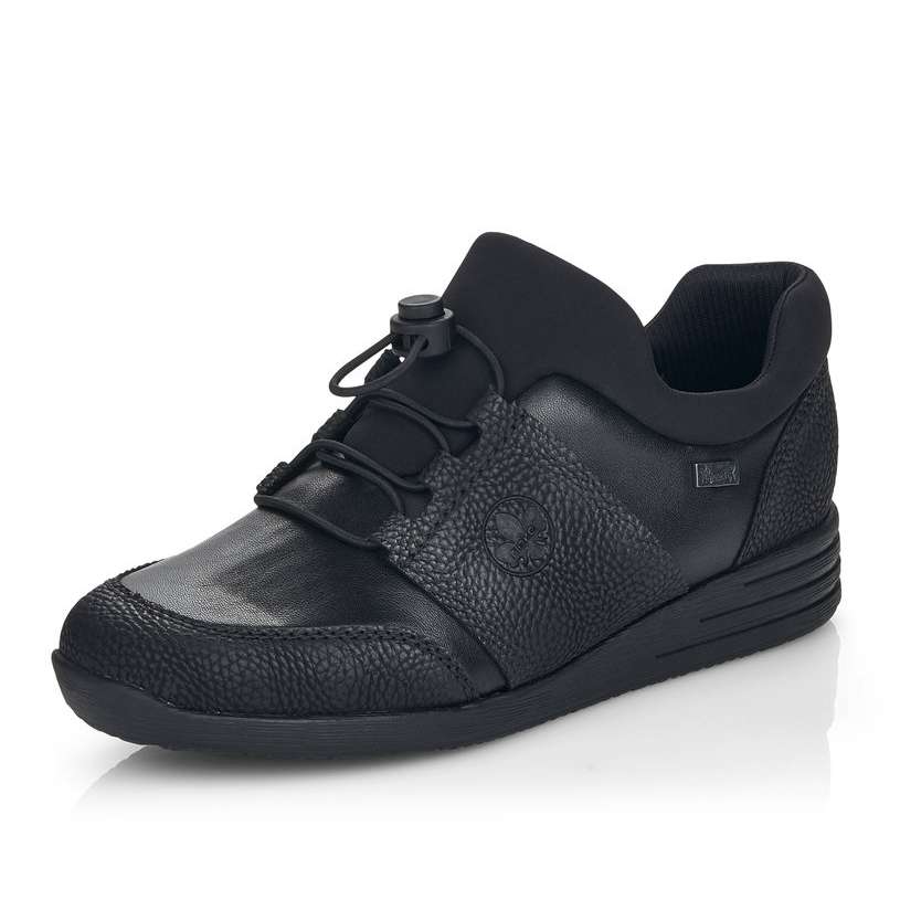 Kožený svršek je designově poskládán z hladkých a strukturovaných částí a kolem horního okraje je doplněn pružnou textilní částí. Membrána Rieker TEX se postará o nepromokavost obuvi a snadné nazouvání a přizpůsobení zajistí zip z vnitřní strany a šněrování pružnou gumičkou s jednoduchým stahovacím systémem.