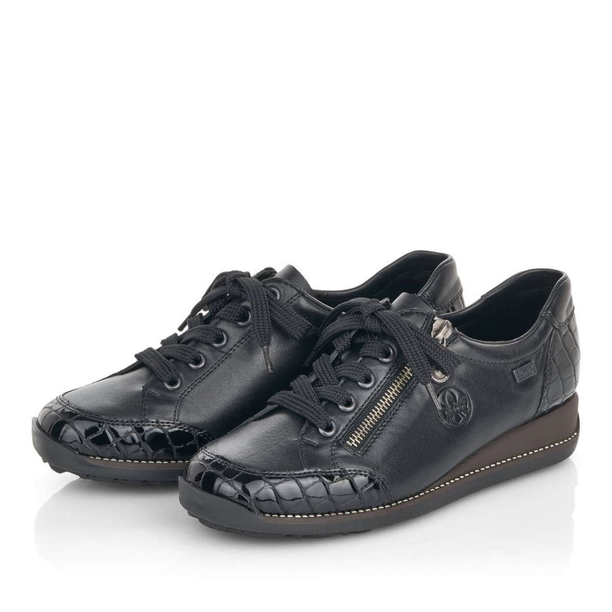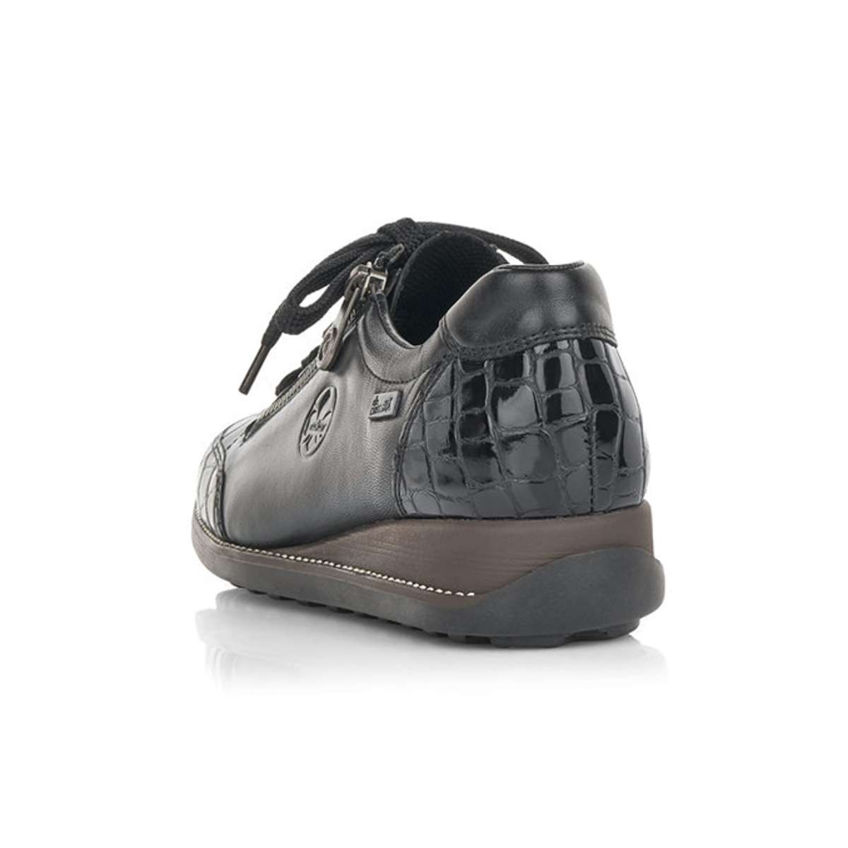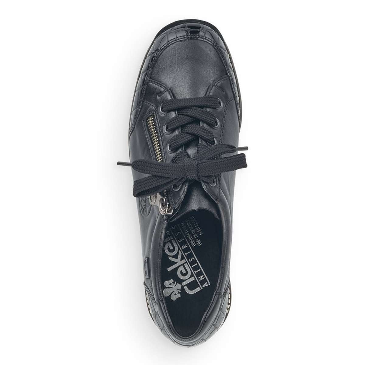 Dámská polobotka zančky RIEKER v černé barvě je zdobená elegantním šitím, hadím motivem na špičce a patě a speciální úprava Rieker TEX zajistí nepromokavost obuvi. Tyto tenisky si pohodlně nazujete pomocí zipu a šněrování tkaničkami. Tento elegantní model je vhodný pro každou ženu ke všem pracovním i volnočasovým outfitům.