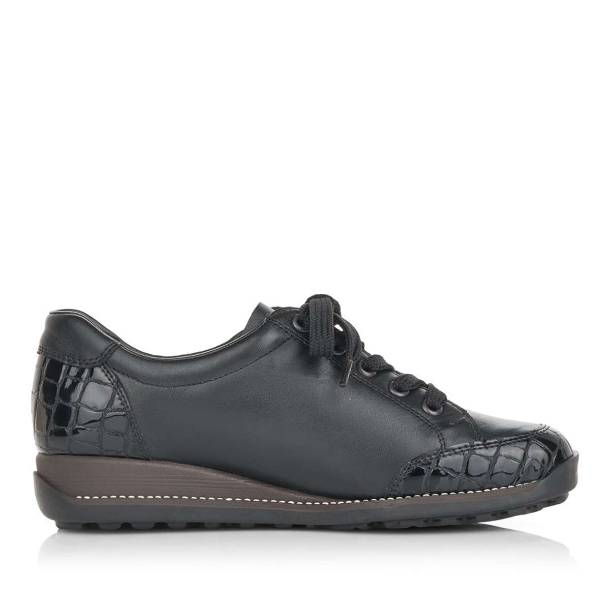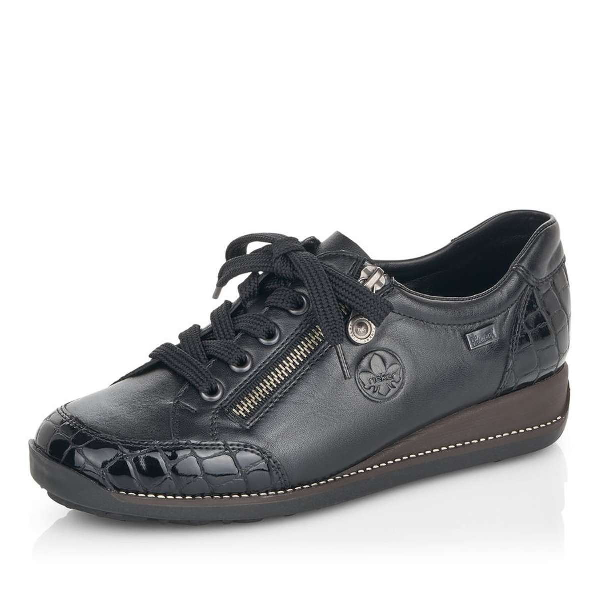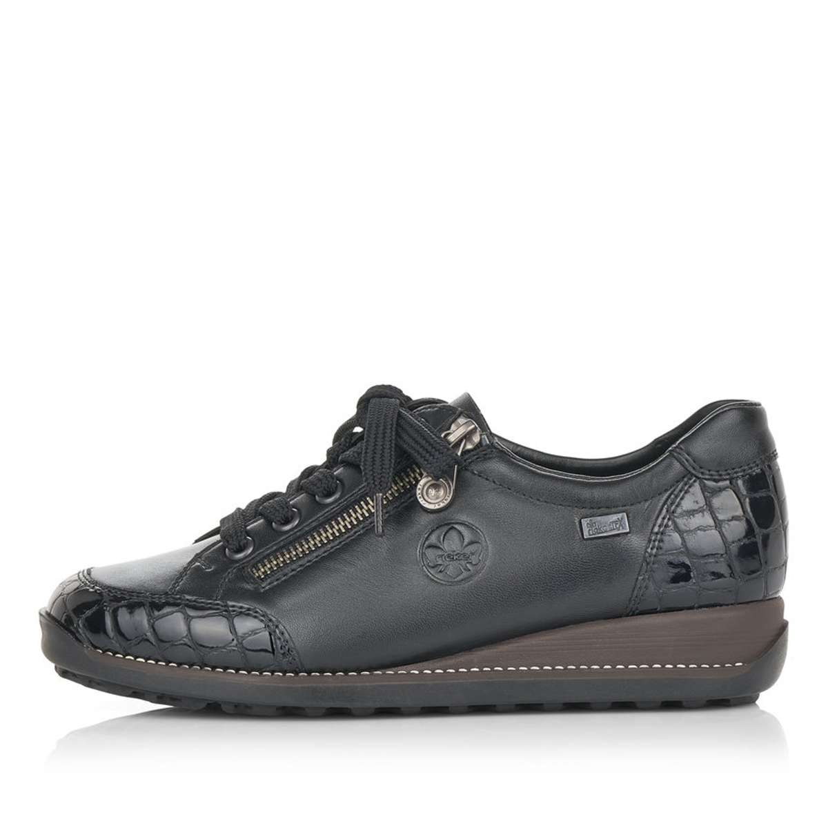 Dámská polobotka zančky RIEKER v černé barvě je zdobená elegantním šitím, hadím motivem na špičce a patě a speciální úprava Rieker TEX zajistí nepromokavost obuvi. Tyto tenisky si pohodlně nazujete pomocí zipu a šněrování tkaničkami. Tento elegantní model je vhodný pro každou ženu ke všem pracovním i volnočasovým outfitům.