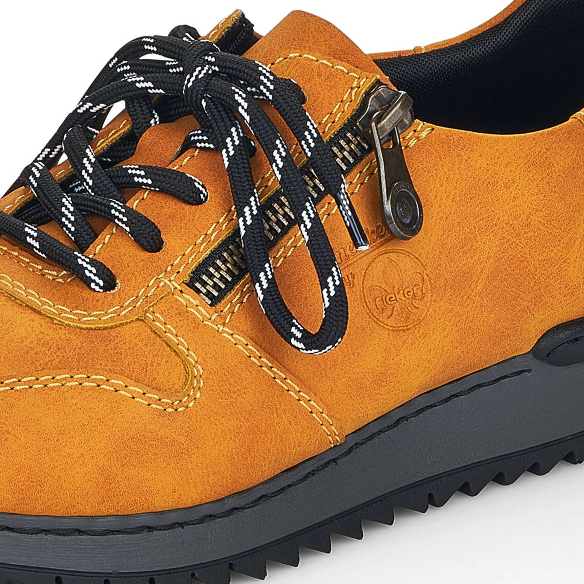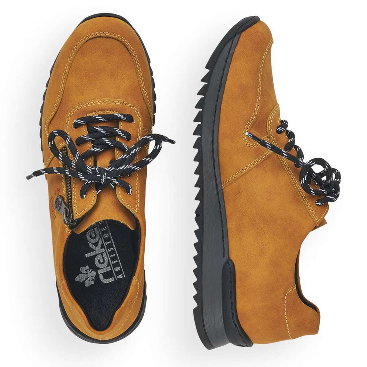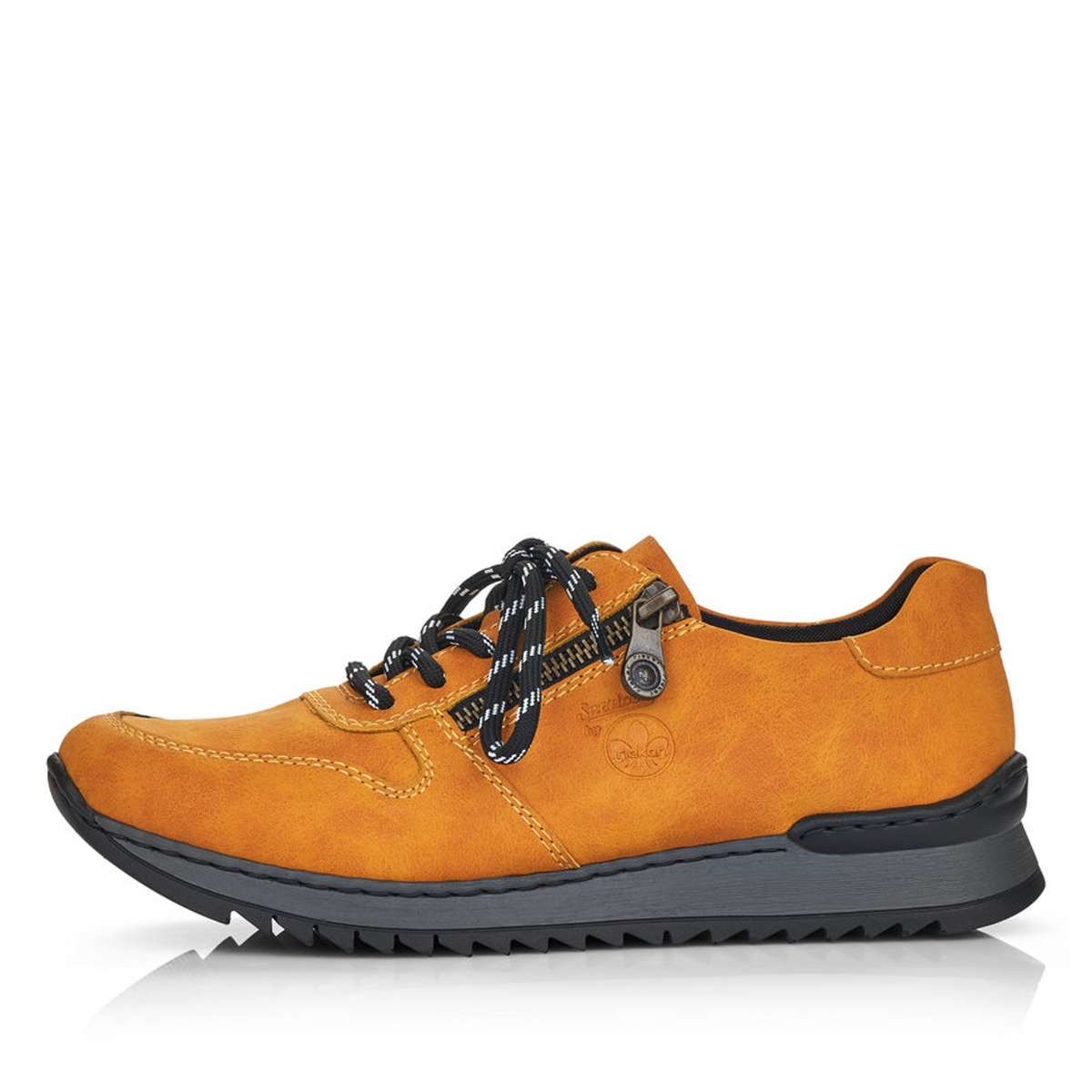 S těmito krásnými sportovními dámskými polobotkami značky RIEKER se budete cítit příjemně a podzim Vás nezaskočí. Svršek této boty je díky své barvičce nepřehlédnutelný, zipem a tkaničkami si boty krásně přizpůsobíte noze. Vtištěné logo značky rieker a jemné prošití vede obuv k dokonalosti. Výška podešve v nejvyšším bodě je cca 3,3 cm a její hrubší vzor Vám dodá komfort, který s Vámi bude celý den. Tento model si oblíbíte ať už vyrazíte do práce nebo jen tak s přáteli do města. Technologie: Antistress - podešev je díky této technologii lehká, flexibilní a absorbuje nárazy při došlapu a snadno se přizpůsobí každé noze.