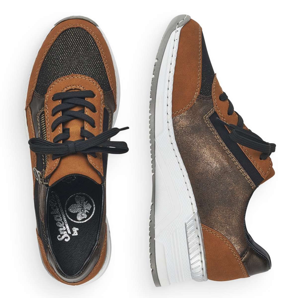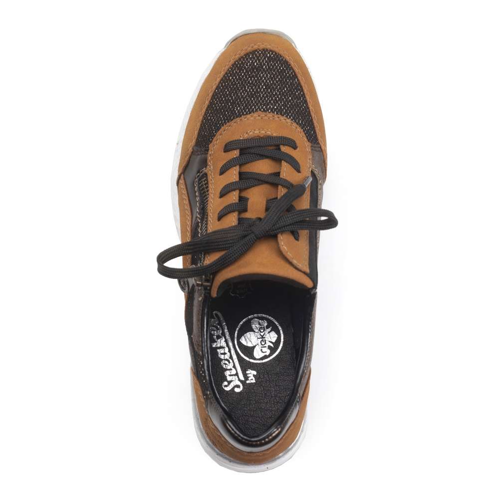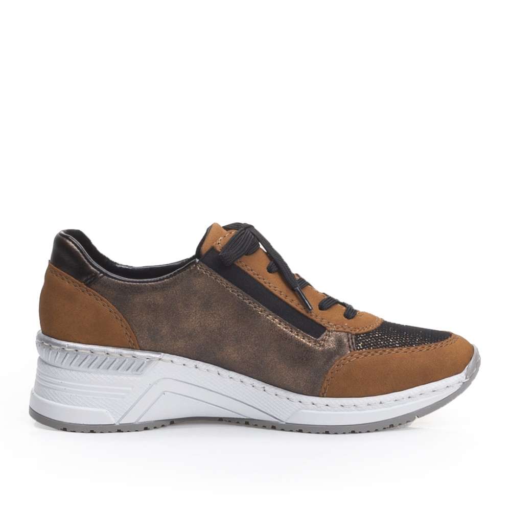 Šněrování spolu s funkčním zipem Vám ulehčí nazouvání, kvalitní svršek s hnědo-bronzovými prvky a kožená vyjímatelná stélka zaručí celkové pohodlí i při dlouhodobém nošení.