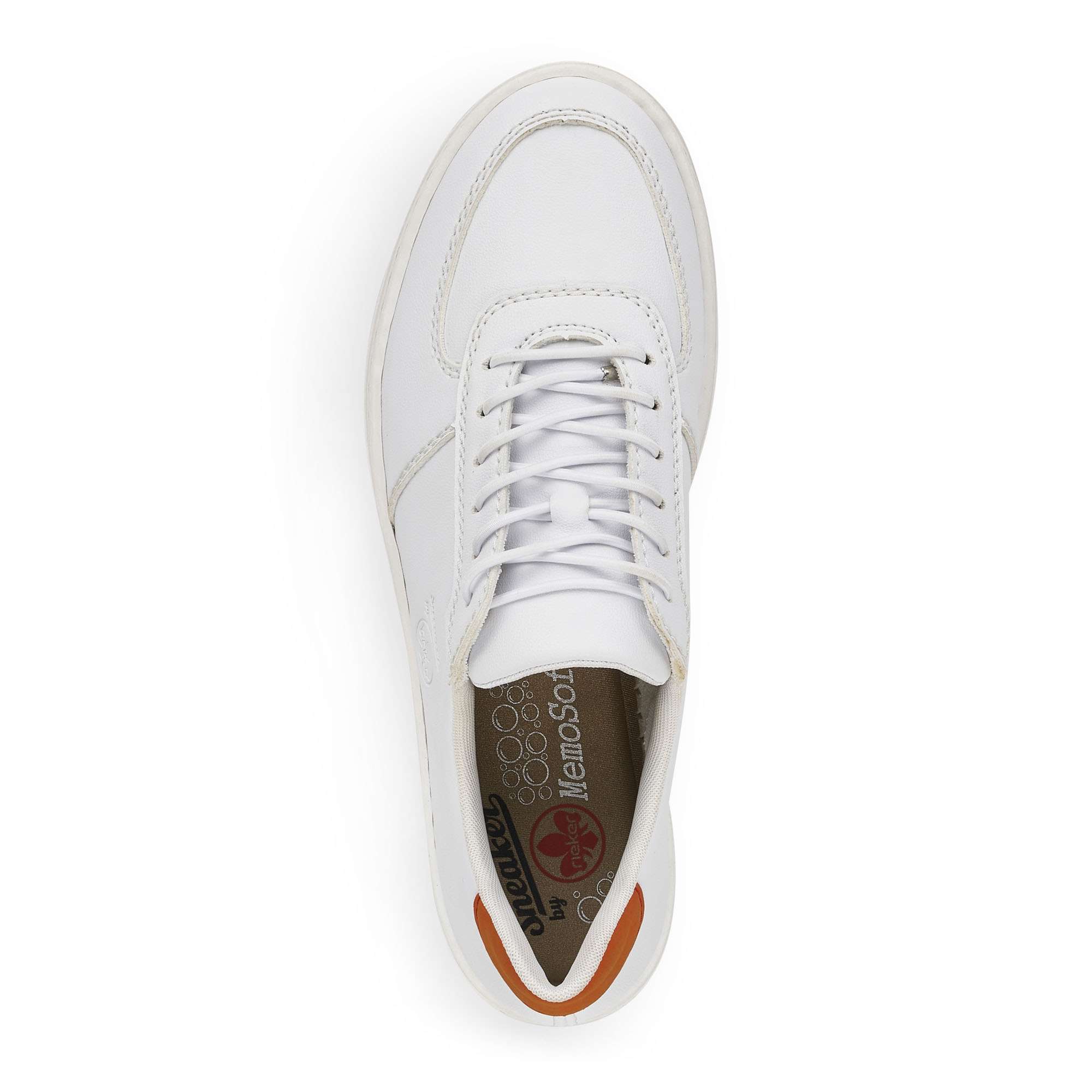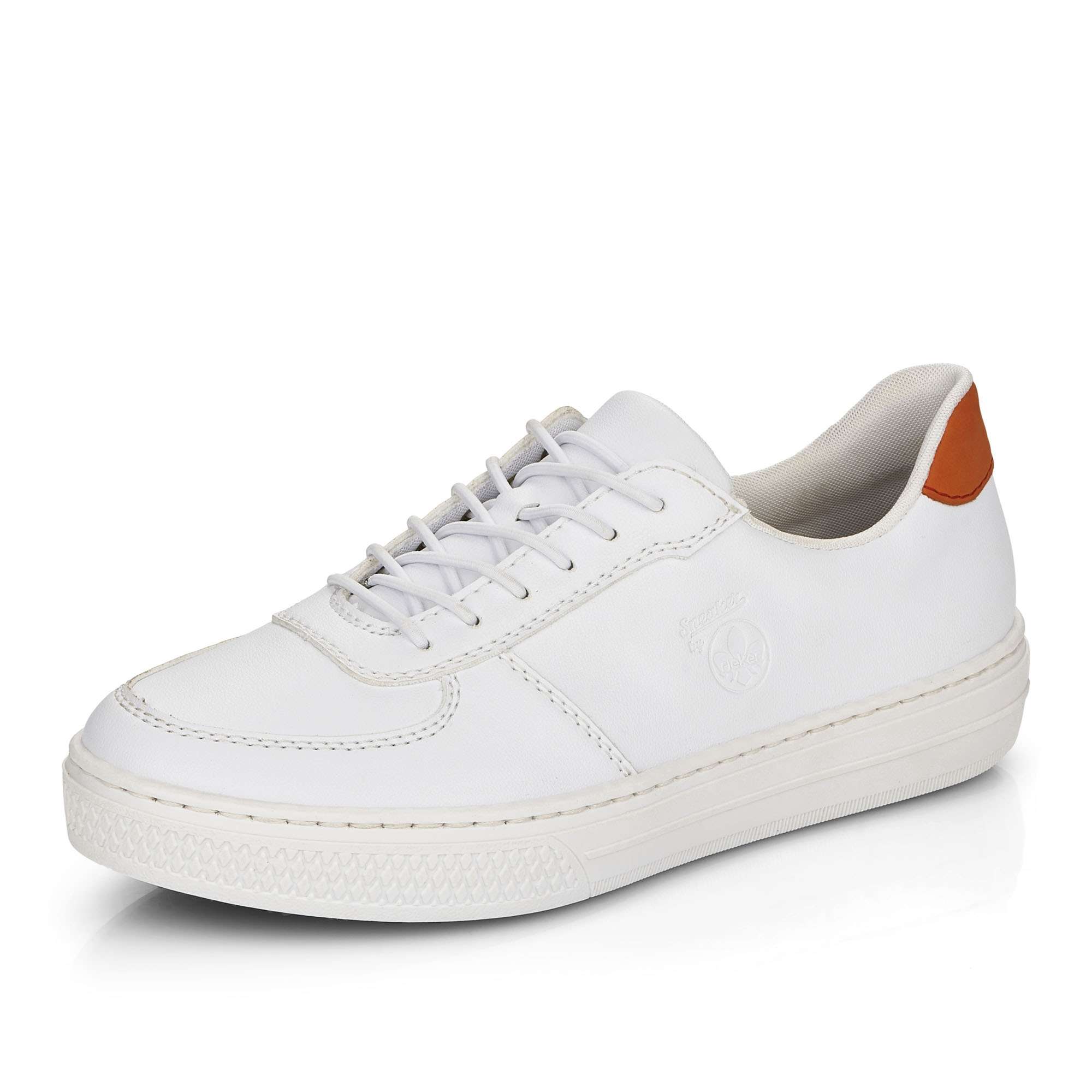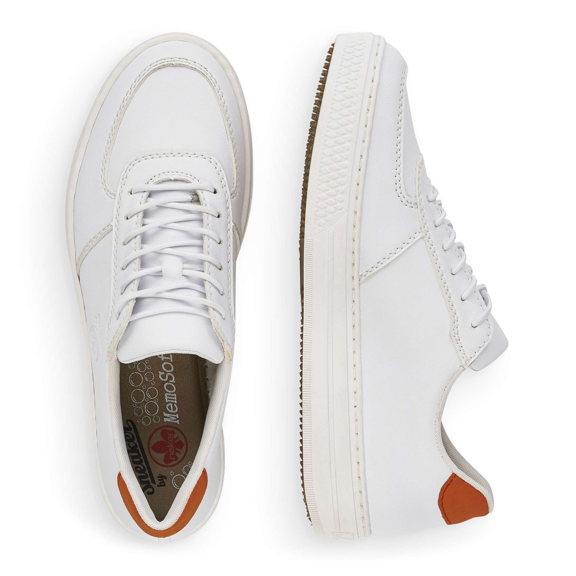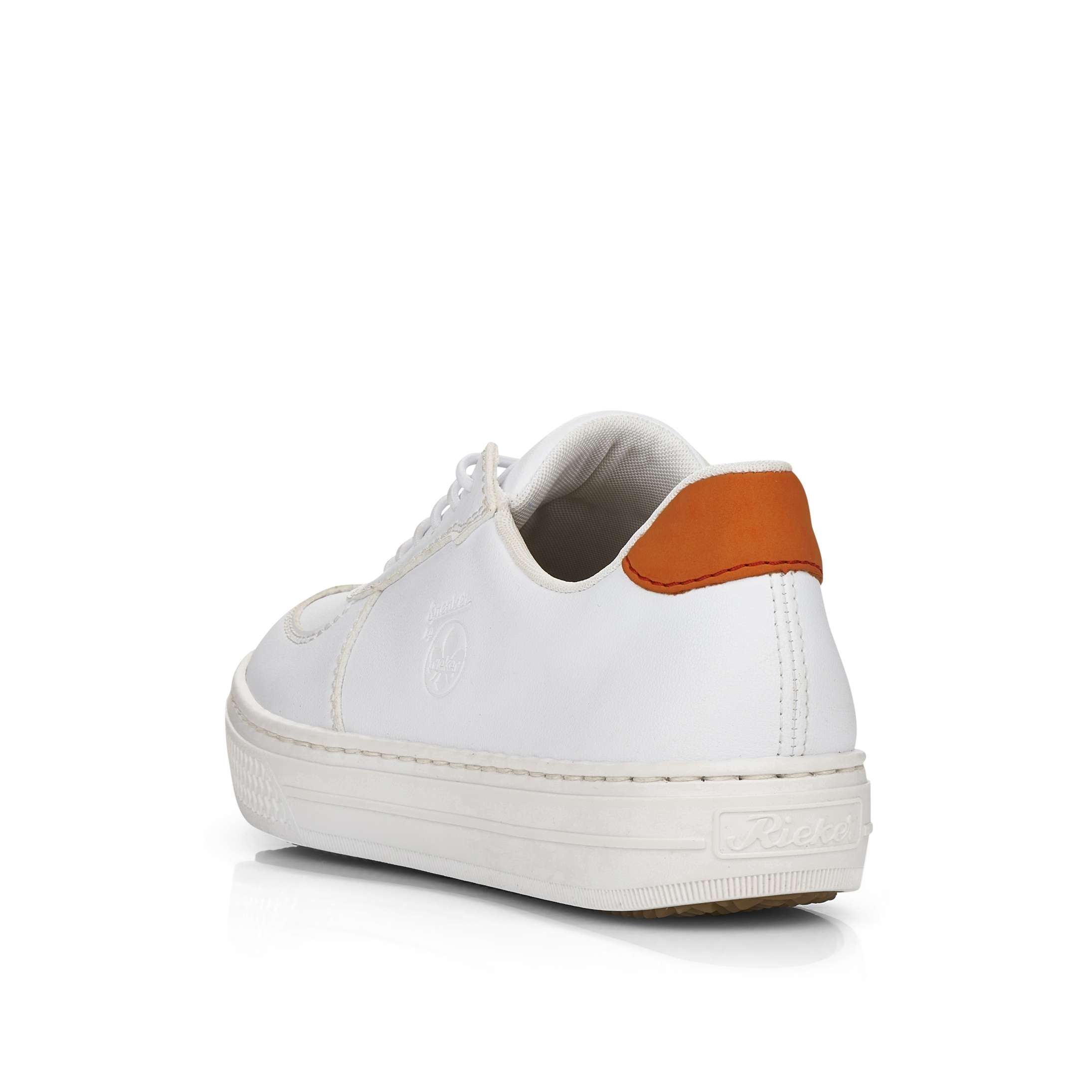Neodolatelná dámská obuv značky RIEKER, jejíž nošení bude zážitek. Bílý svršek je obohacen oranžovou částí na zadní straně a jemným šitím po obvodu tenisky. Pro jednodušší obutí slouží elastický materiál. Kvalitní stélka je vyrobena z paměťové pěny, která zajistí příslušný komfort pro Vaše chodidla po celý den. Dopřejte si nové společnice na vycházky nebo do kina. Technologie: Antistress – podešev je díky této technologii lehká, flexibilní, absorbuje nárazy při došlapu a snadno se přizpůsobí každé noze. MemoSoft – unikátní stélka z paměťové pěny, která změkčuje došlap, ale také se maximálně přizpůsobí tvaru Vašeho chodidla.