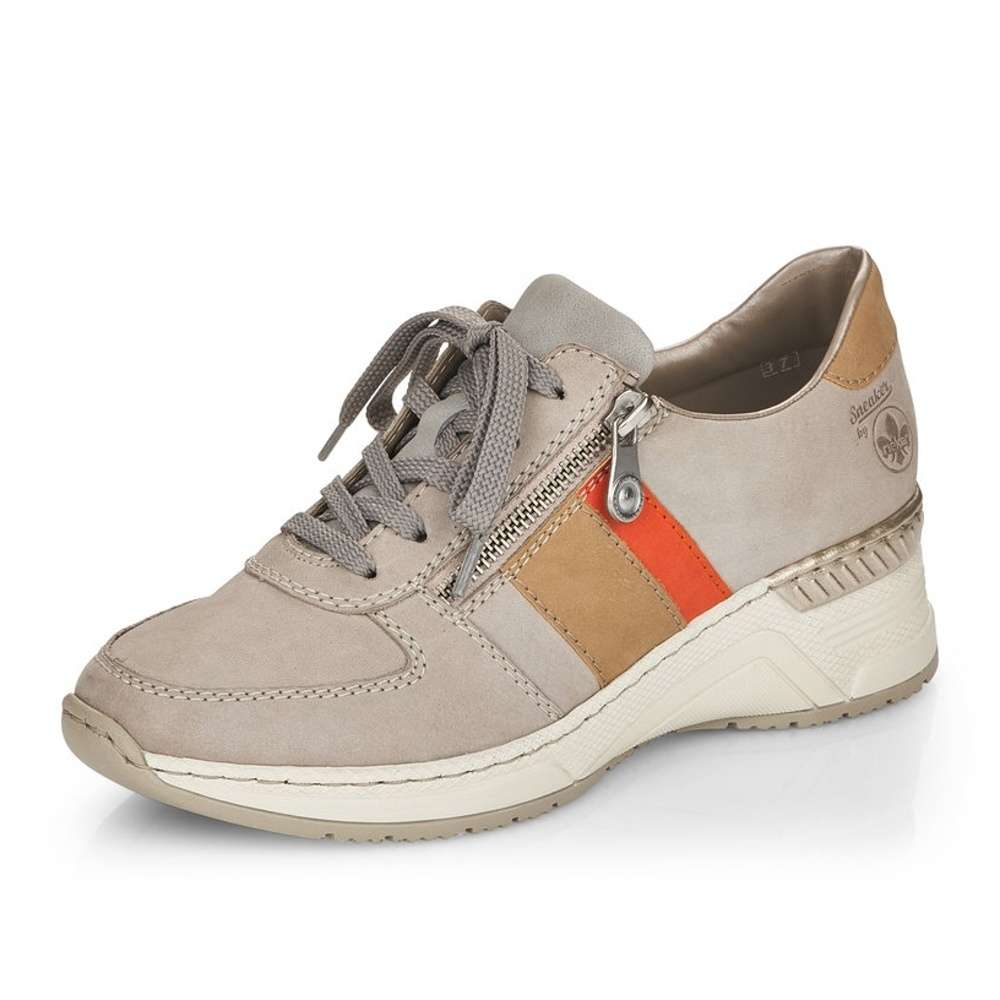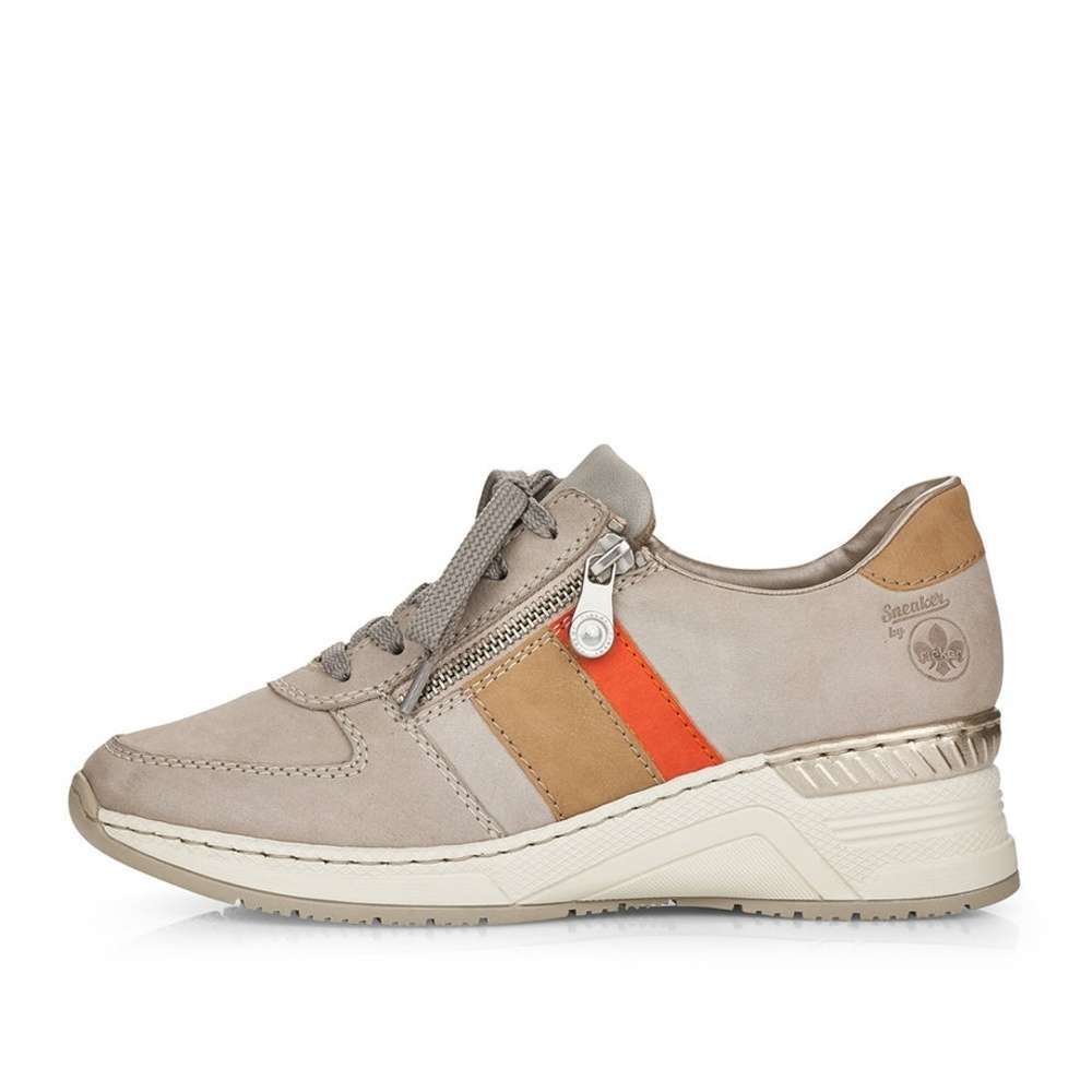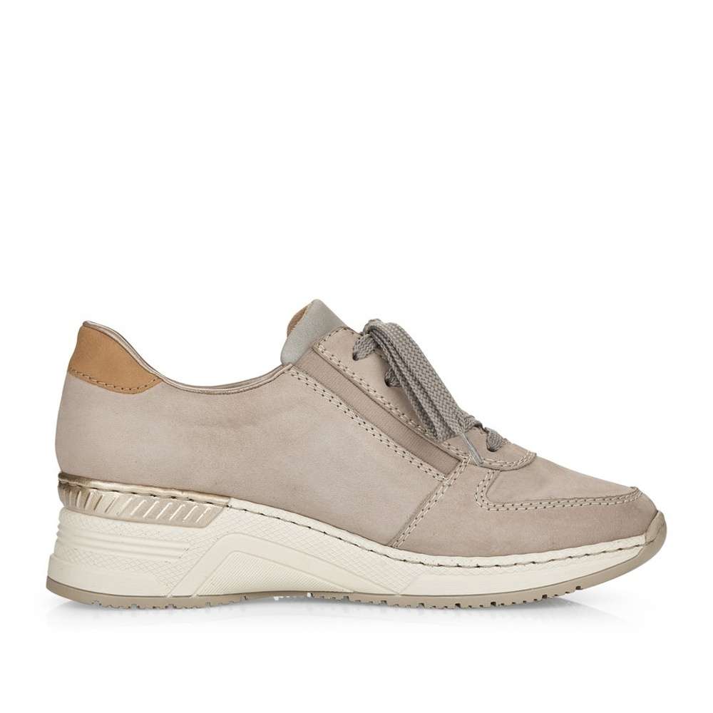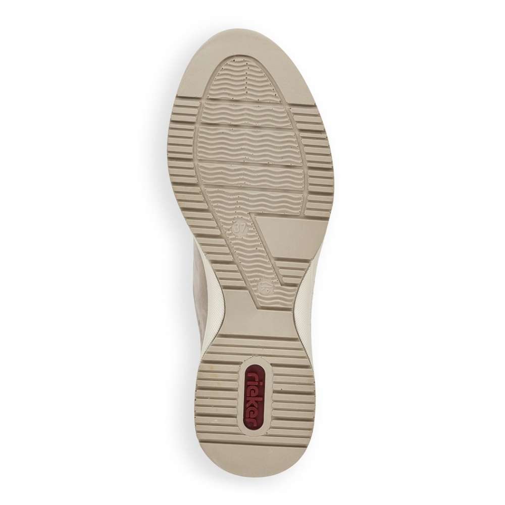 Dámské šněrovací tenisky od značky RIEKER se semišovým svrškem béžové barvy, skvěle doplňují kontrastní části po stranách a na patě. Pro snadné obutí poslouží pružná gumička, z vnější strany funkční zip a šněrování tkaničkami. Jistě oceníte pohodlnou stélku, která lze vyměnit podle potřeby. Tento model s vyšší podešví krásně prodlouží Vaše nohy a docílíte s ním dokonalého outfitu. Technologie: Antistress – podešev je díky této technologii lehká, flexibilní, absorbuje nárazy při došlapu a snadno se přizpůsobí každé noze. Tato bota je vybavena vyjímatelnou stélkou.