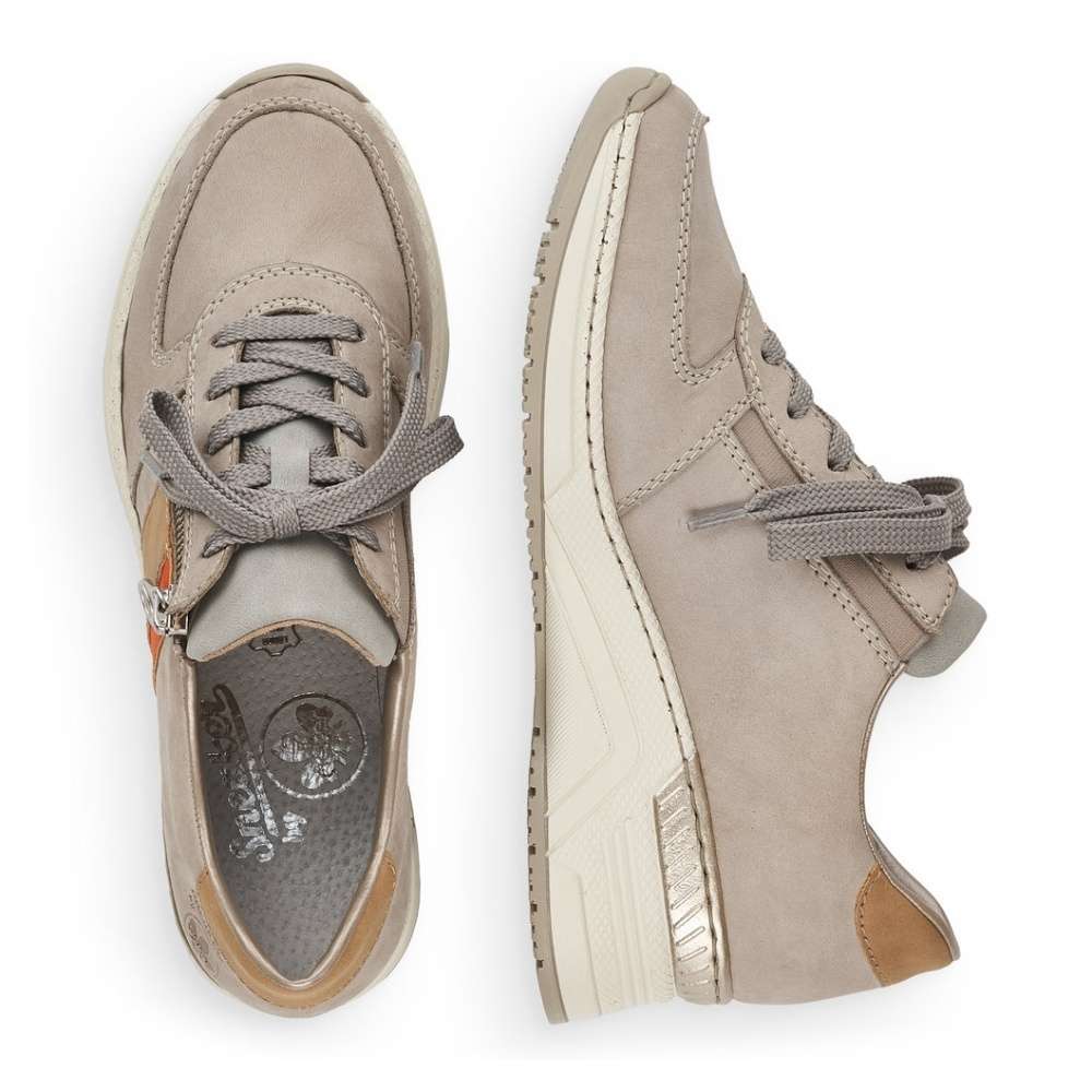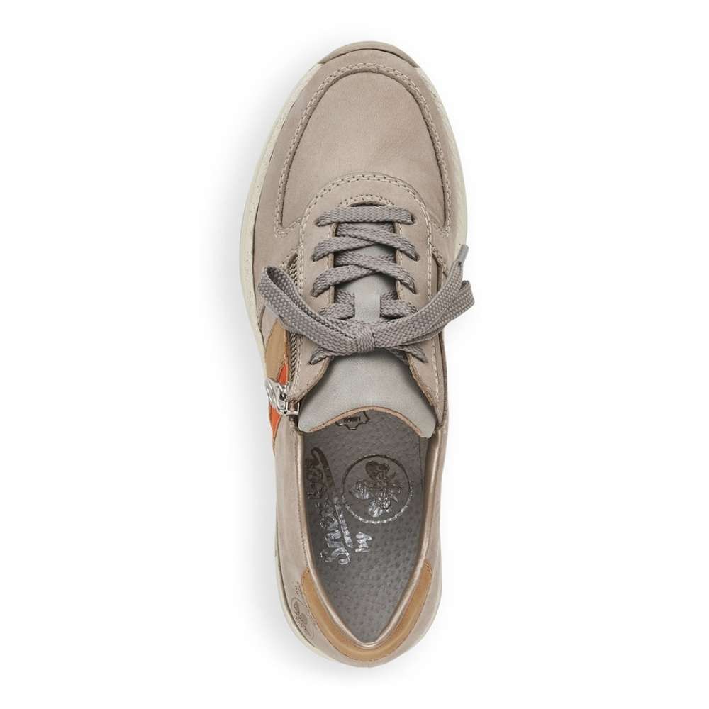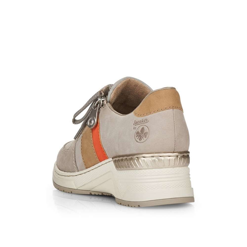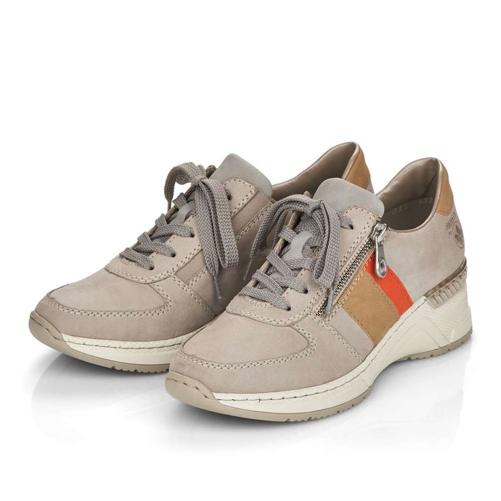 Dámské šněrovací tenisky od značky RIEKER se semišovým svrškem béžové barvy, skvěle doplňují kontrastní části po stranách a na patě. Pro snadné obutí poslouží pružná gumička, z vnější strany funkční zip a šněrování tkaničkami. Jistě oceníte pohodlnou stélku, která lze vyměnit podle potřeby. Tento model s vyšší podešví krásně prodlouží Vaše nohy a docílíte s ním dokonalého outfitu. Technologie: Antistress – podešev je díky této technologii lehká, flexibilní, absorbuje nárazy při došlapu a snadno se přizpůsobí každé noze. Tato bota je vybavena vyjímatelnou stélkou.