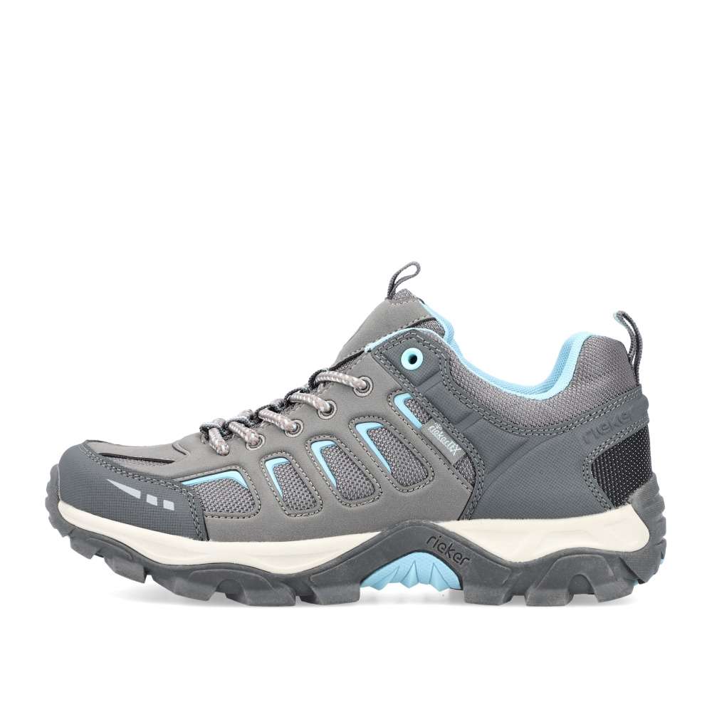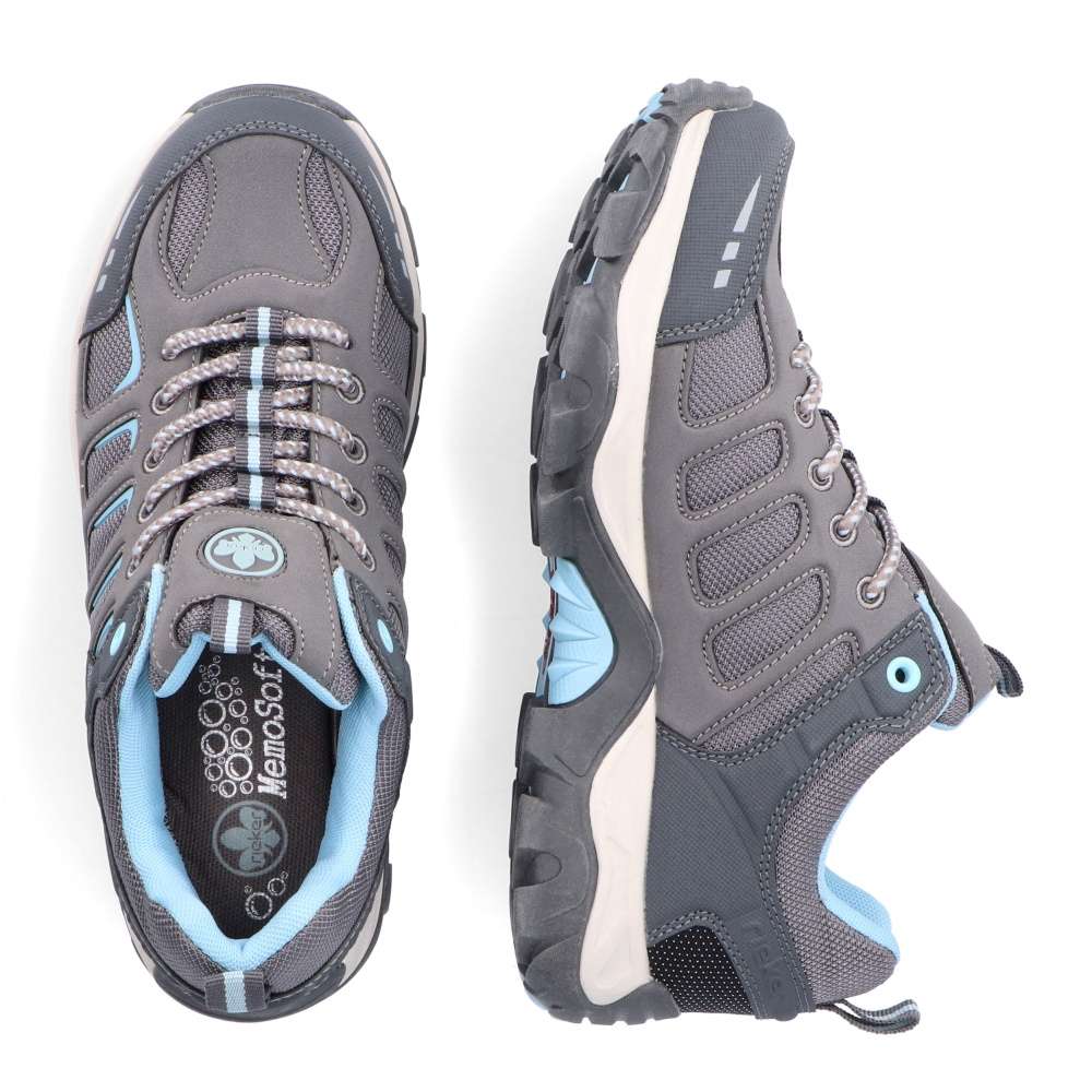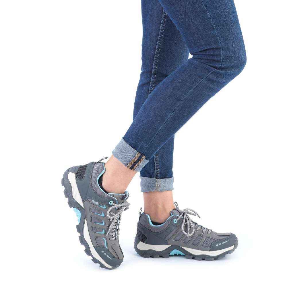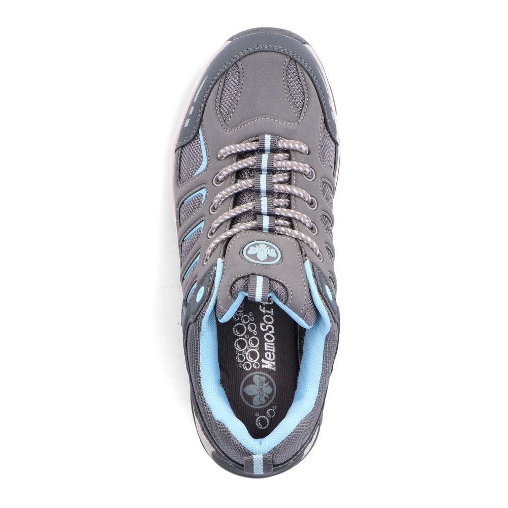 Dámská sportovní obuv s kulatým logem značky RIEKER a nádherným propojením světle šedé a pastelově modré barvy. K ještě snadnějšímu obutí zde poslouží textilní poutka u horního okraje a tkaničkami si boty můžete utáhnout přesně podle Vašich představ. Pohodlná stélka je vyrobená z paměťové pěny a zajistí Vám celodenní komfort. S tímto vkusným modelem budou procházky přírodou ještě o něco hezčí. Technologie: Antistress – podešev je díky této technologii lehká, flexibilní, absorbuje nárazy při došlapu a snadno se přizpůsobí každé noze. MemoSoft – unikátní stélka z paměťové pěny, která změkčuje došlap, ale také se maximálně přizpůsobí tvaru Vašeho chodidla.