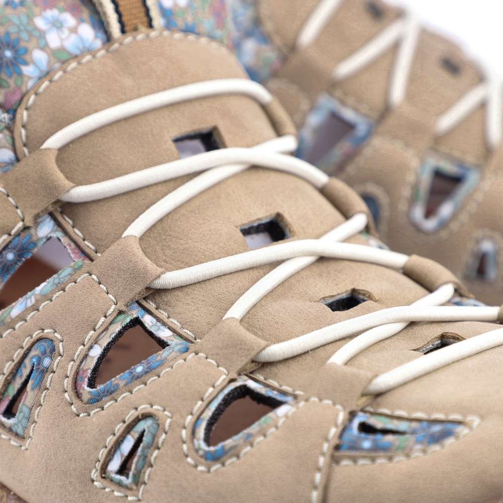 Detailní informace Líbivé dámské sandálky značky RIEKER, které rozzáří Váš den a doplní botník o originální kousek. Béžovým svrškem se prolíná květinkové vzorování, které dodá jedinečný styl. Kožená stélka je tou pravou volbou pro Vaše nekonečné pohodlí a spolu s prodyšnou podšívkou se tyto boty dostávají k dokonalosti. Pevná podešev je lehká, flexibilní a tlumí nárazy při došlapu, a tak se nemusíte bát, že byste v botách nevydržela celý den.