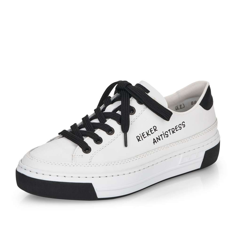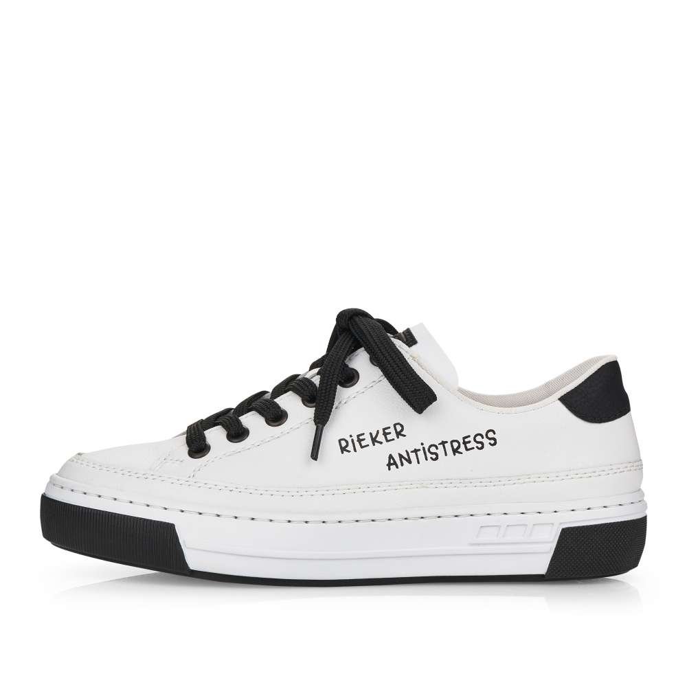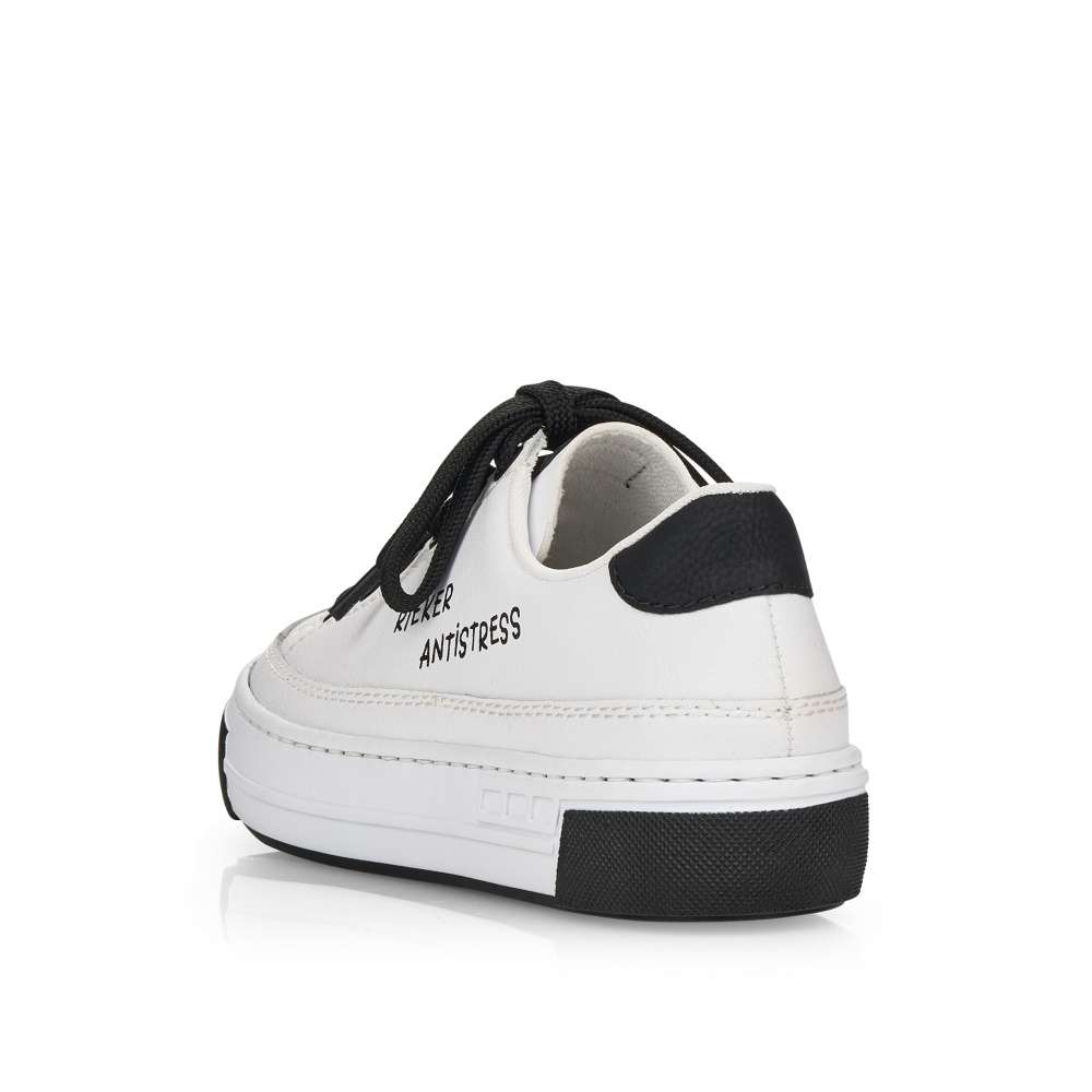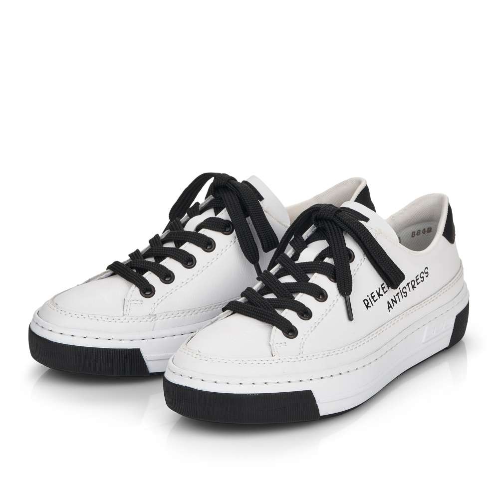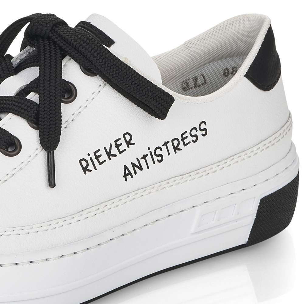 Touto dámskou teniskou od značky Rieker dovedete každý Váš outfit k dokonalosti. Svršek bílé boty lehce zdobí prošívání stejné barvy a černý prvek v oblasti paty, který krásně koresponduje s tkaničkami a logem značky, které je viditelné na vnější straně tenisky a na jejím jazyku. Botu skvěle sladíte s riflemi nebo kraťasy a tím dosáhnete parádního vzhledu. Technologie: Antistress – podešev je díky této technologii lehká, flexibilní, absorbuje nárazy při došlapu a snadno se přizpůsobí každé noze.