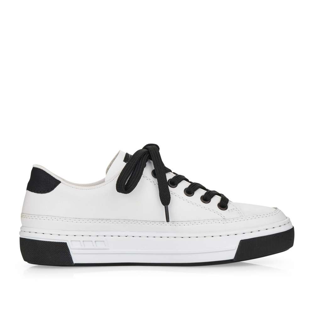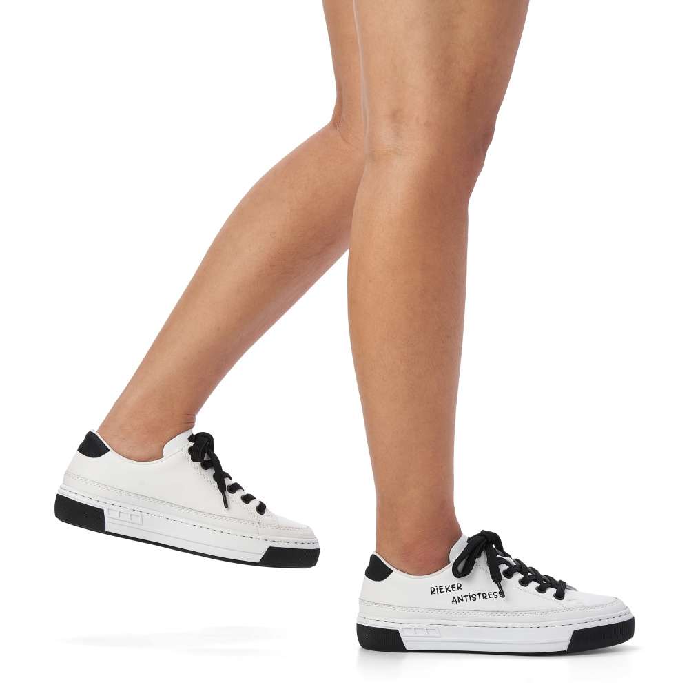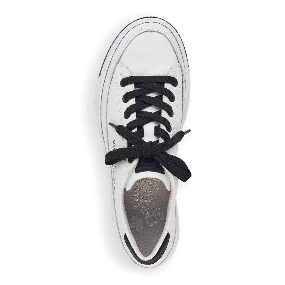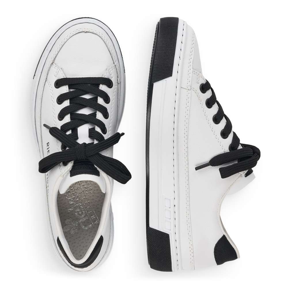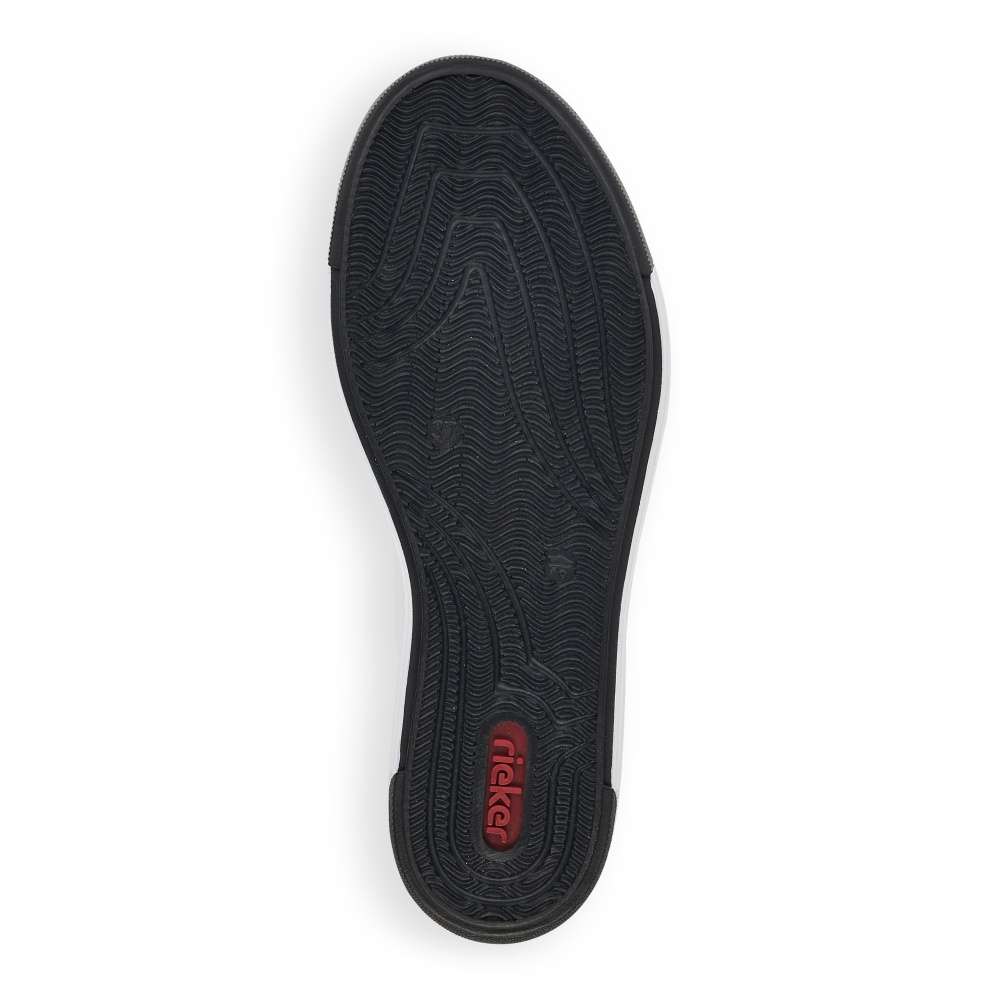 Touto dámskou teniskou od značky Rieker dovedete každý Váš outfit k dokonalosti. Svršek bílé boty lehce zdobí prošívání stejné barvy a černý prvek v oblasti paty, který krásně koresponduje s tkaničkami a logem značky, které je viditelné na vnější straně tenisky a na jejím jazyku. Botu skvěle sladíte s riflemi nebo kraťasy a tím dosáhnete parádního vzhledu. Technologie: Antistress – podešev je díky této technologii lehká, flexibilní, absorbuje nárazy při došlapu a snadno se přizpůsobí každé noze.