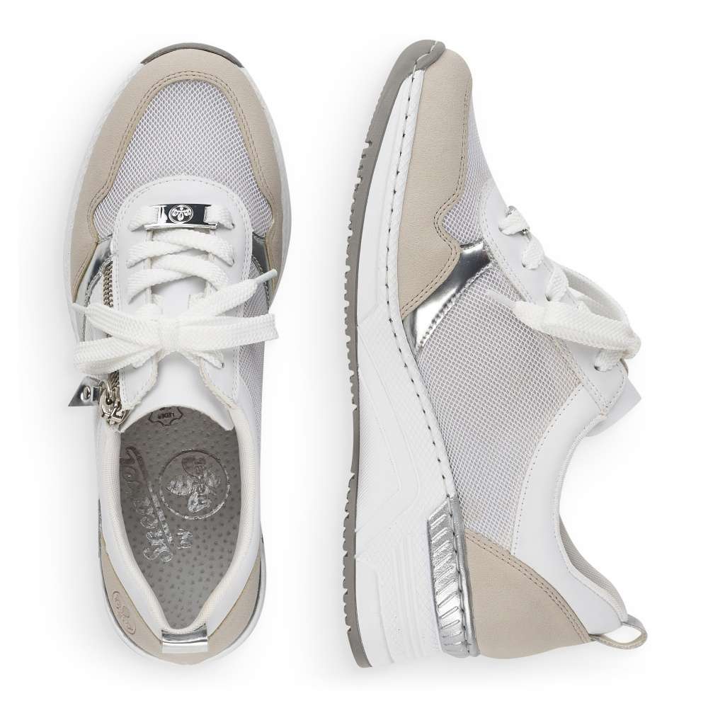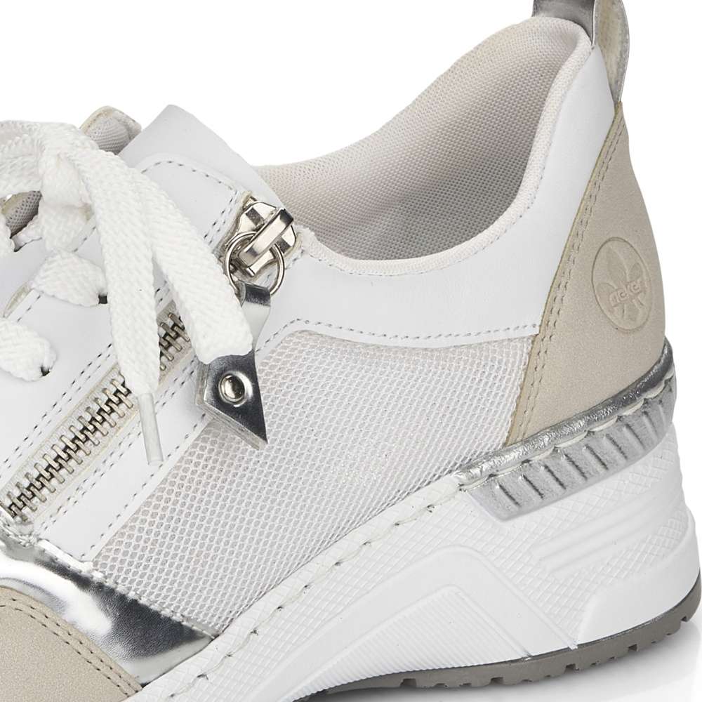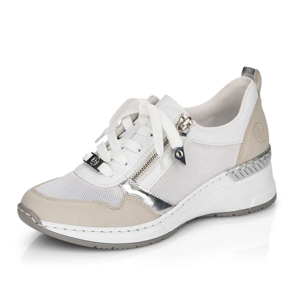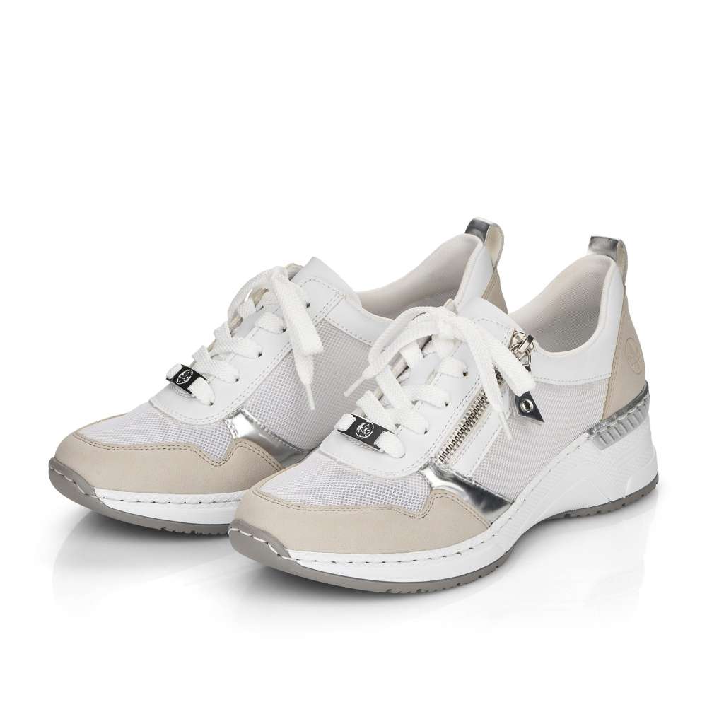 Detailní informace Rozhodně je to teniska, která by v žádném případě neměla chybět ve Vašem botníku. Svrchní materiál se vyznačuje kombinací bílé, béžové a stříbrné. Pro snadné obutí z vnější strany poslouží funkční zip a šněrování. Jistě oceníte pohodlnou stélku, která lze vyměnit dle potřeby. Tento model na vyšší podešvi krásně prodlouží Vaše nohy a docílíte s ním dokonalého outfitu pro každý váš den. Botička značky RIEKER ve které se budete cítit stylově a výjimečně.