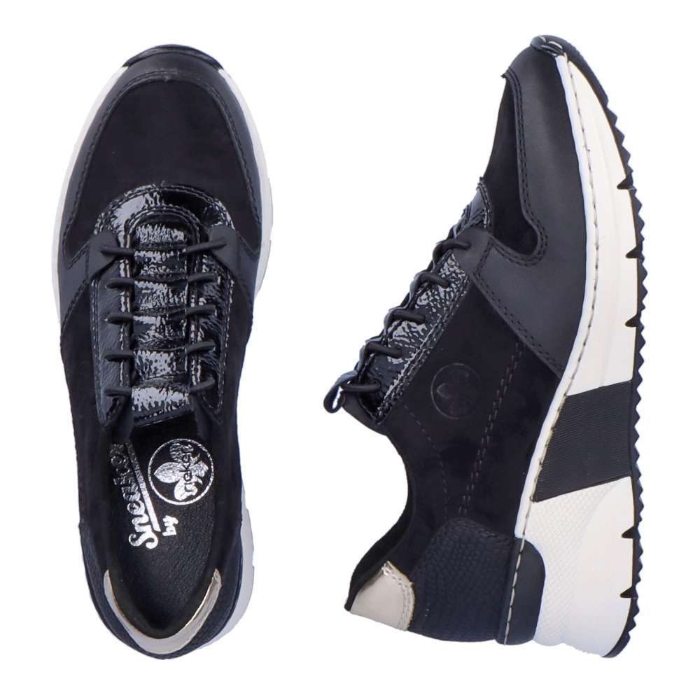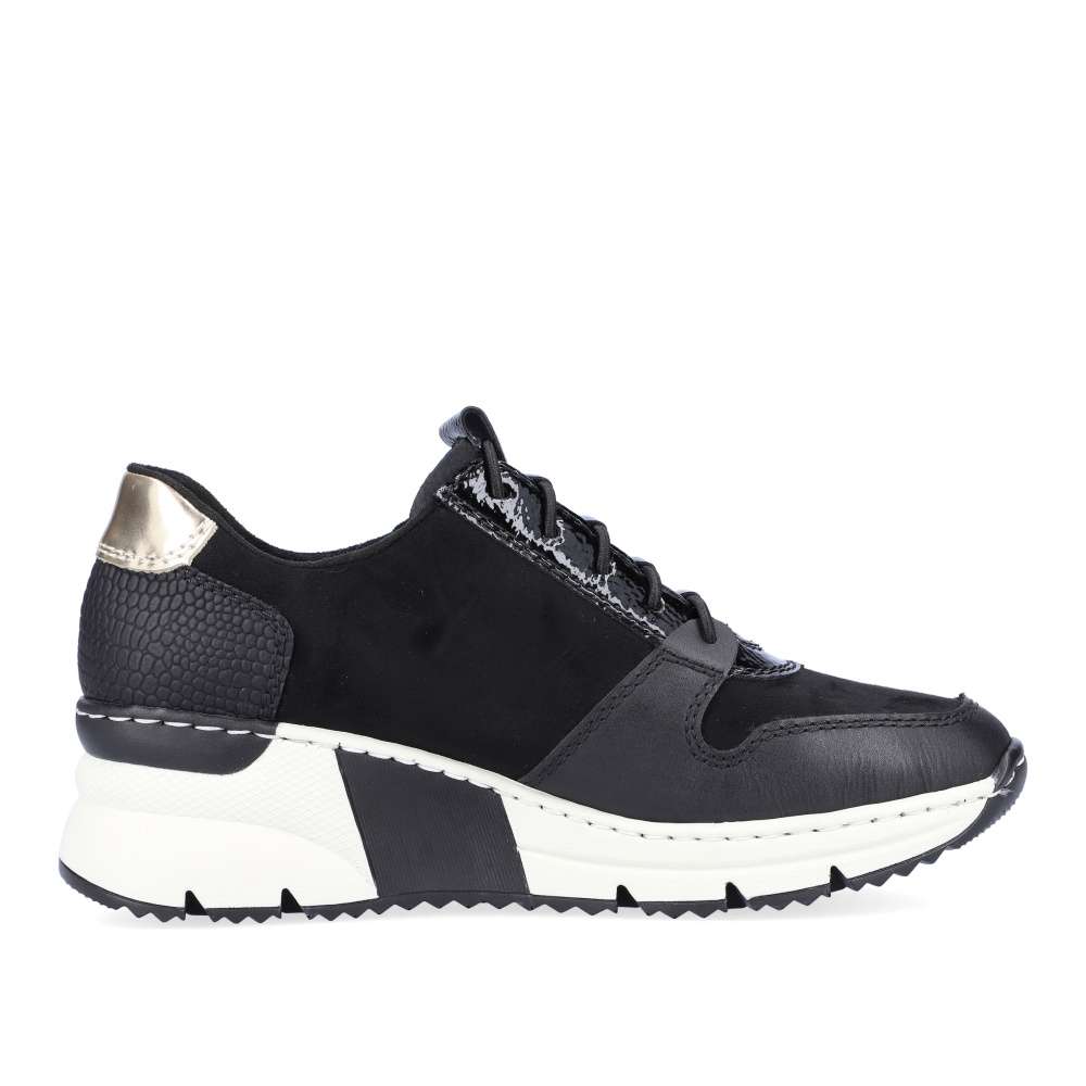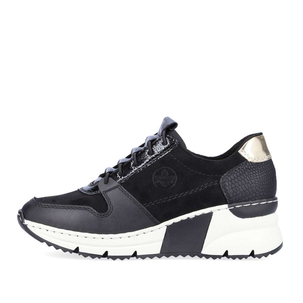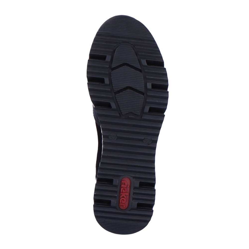 Dámské nadčasové tenisky značky RIEKER Vám nesmí chybět. Tento parádní kousek má kombinovaný svršek, a také šněrování pružnou gumičkou, která usnadní nazouvání a skvěle se přizpůsobí Vaší noze. Měkká vyjímatelná stélka a klínová podešev zajistí komfort a eleganci na každém kroku. Tyto botky se hodí ke všem outfitům do města i do práce.