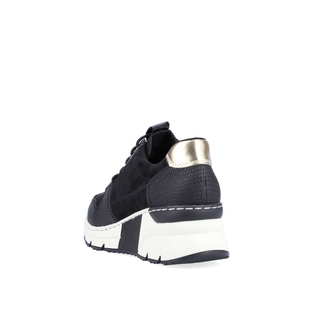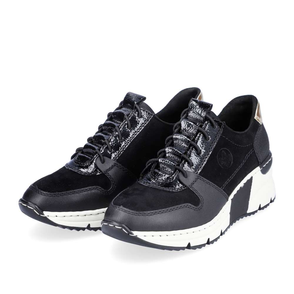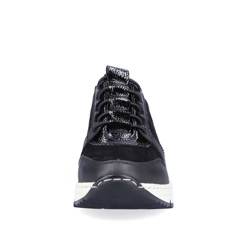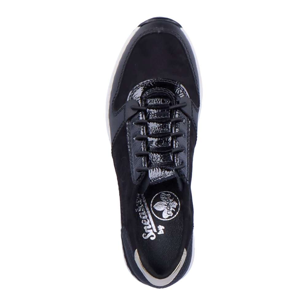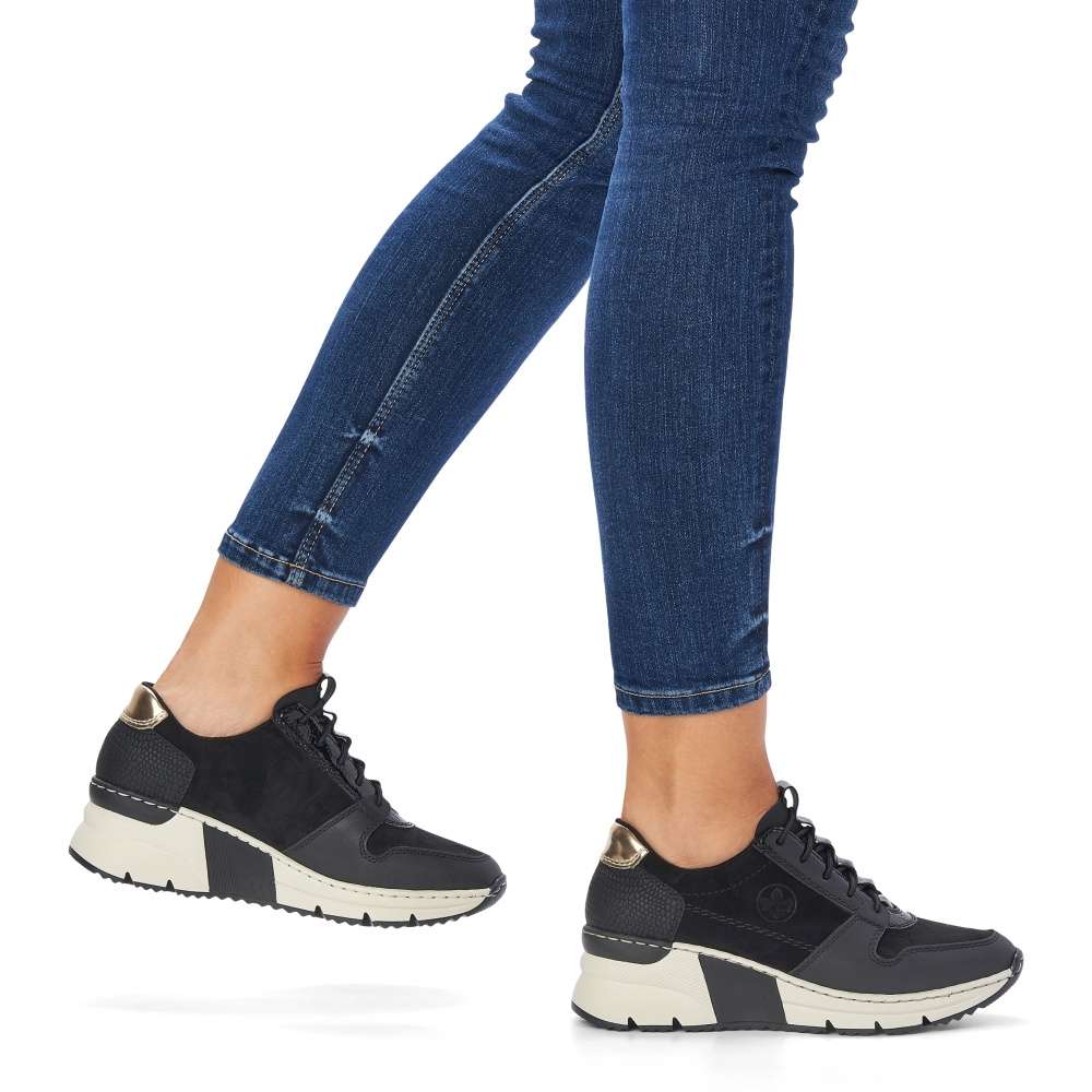 Dámské nadčasové tenisky značky RIEKER Vám nesmí chybět. Tento parádní kousek má kombinovaný svršek, a také šněrování pružnou gumičkou, která usnadní nazouvání a skvěle se přizpůsobí Vaší noze. Měkká vyjímatelná stélka a klínová podešev zajistí komfort a eleganci na každém kroku. Tyto botky se hodí ke všem outfitům do města i do práce.