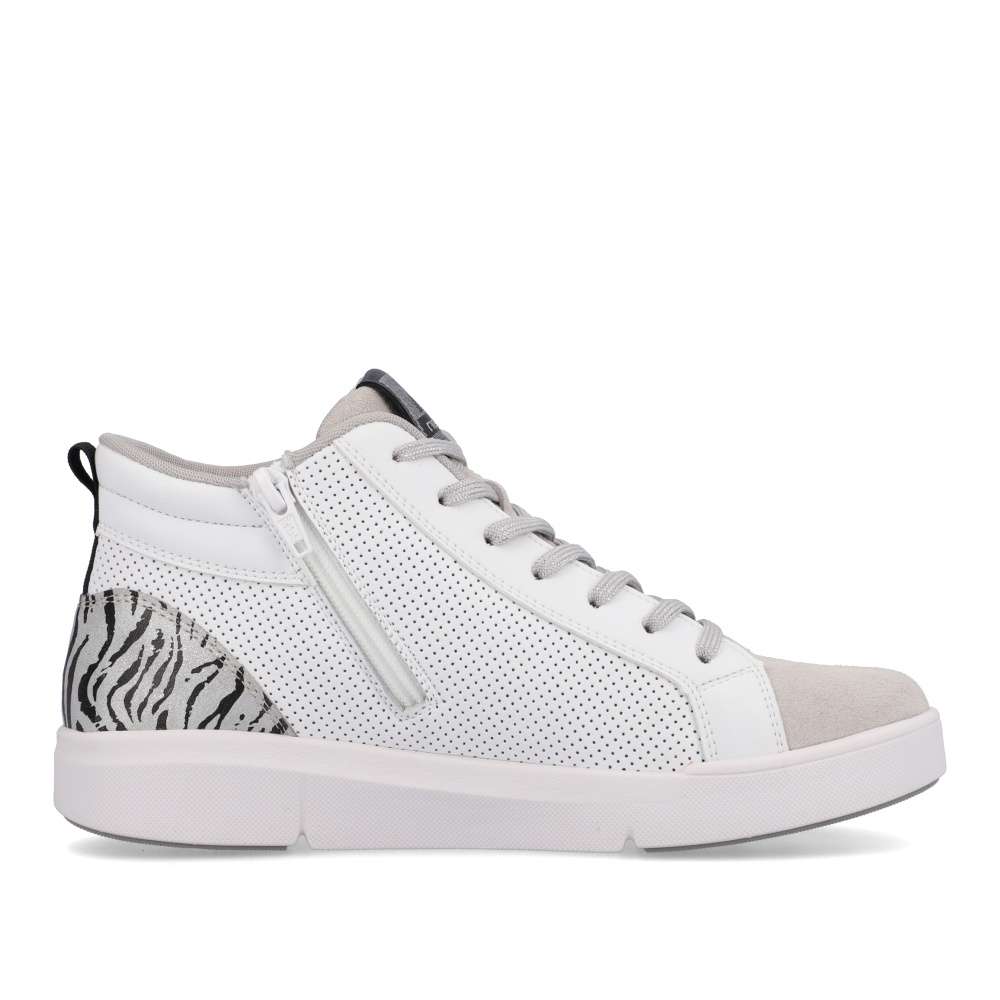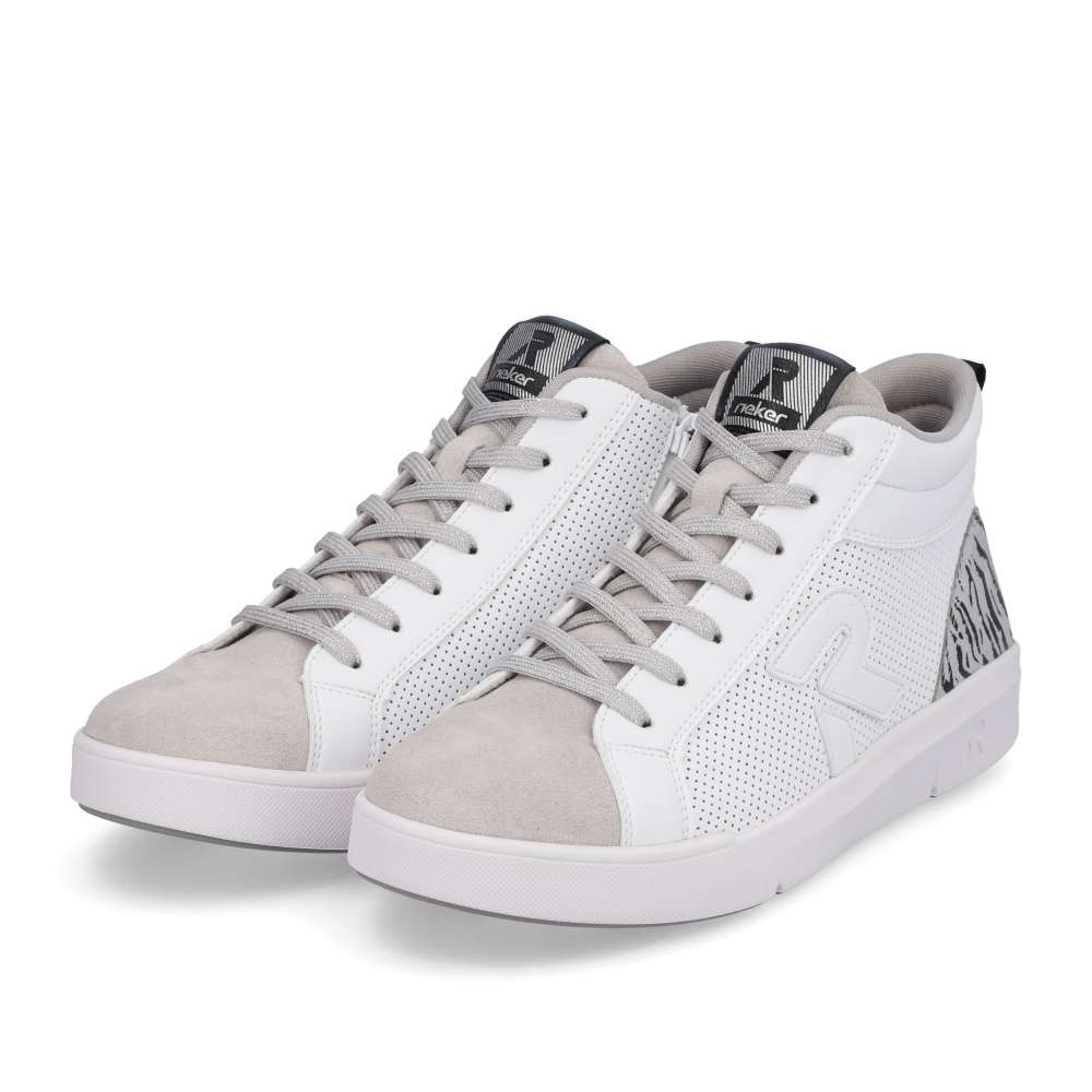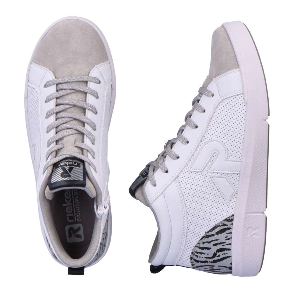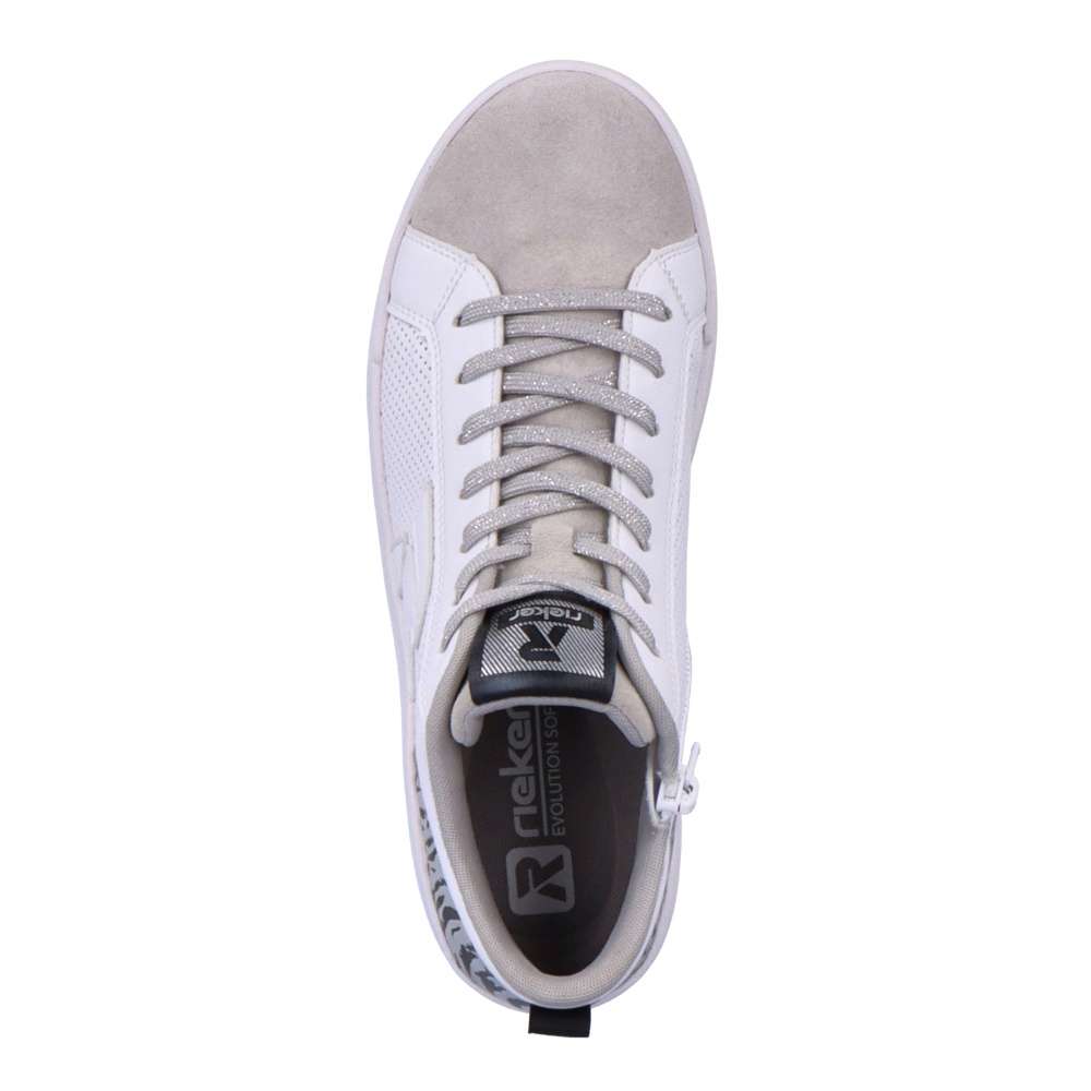 Rieker Revolution je nová řada moderní sportovní obuvi s obrovským důrazem na komfort a pohodlí i při celodenním nošení. Tyto bílo-šedé kožené tenisky Rieker jsou tou správnou volbou pro každou z Vás! Třpytivé šněrování dodává botě co nejlepší přizpůsobení se noze a zip z vnitřní strany usnadní obutí. Flexibilní a super lehká podešev spolu s měkkou vyjímatelnou stélkou nabízejí trvalou pohodu i během dlouhých dní. Svršek je zdoben jemným prošíváním a designovou perforací, která zajistí prodyšnost obuvi. Tento originální model skvěle doplní každý Váš outfit do města i na posezení s přáteli. Technologie: RevolutionSoft – unikátní stélka z paměťové pěny, která změkčuje došlap, ale také se maximálně přizpůsobí tvaru Vašeho chodidla. Tato bota je vybavena vyjímatelnou stélkou.