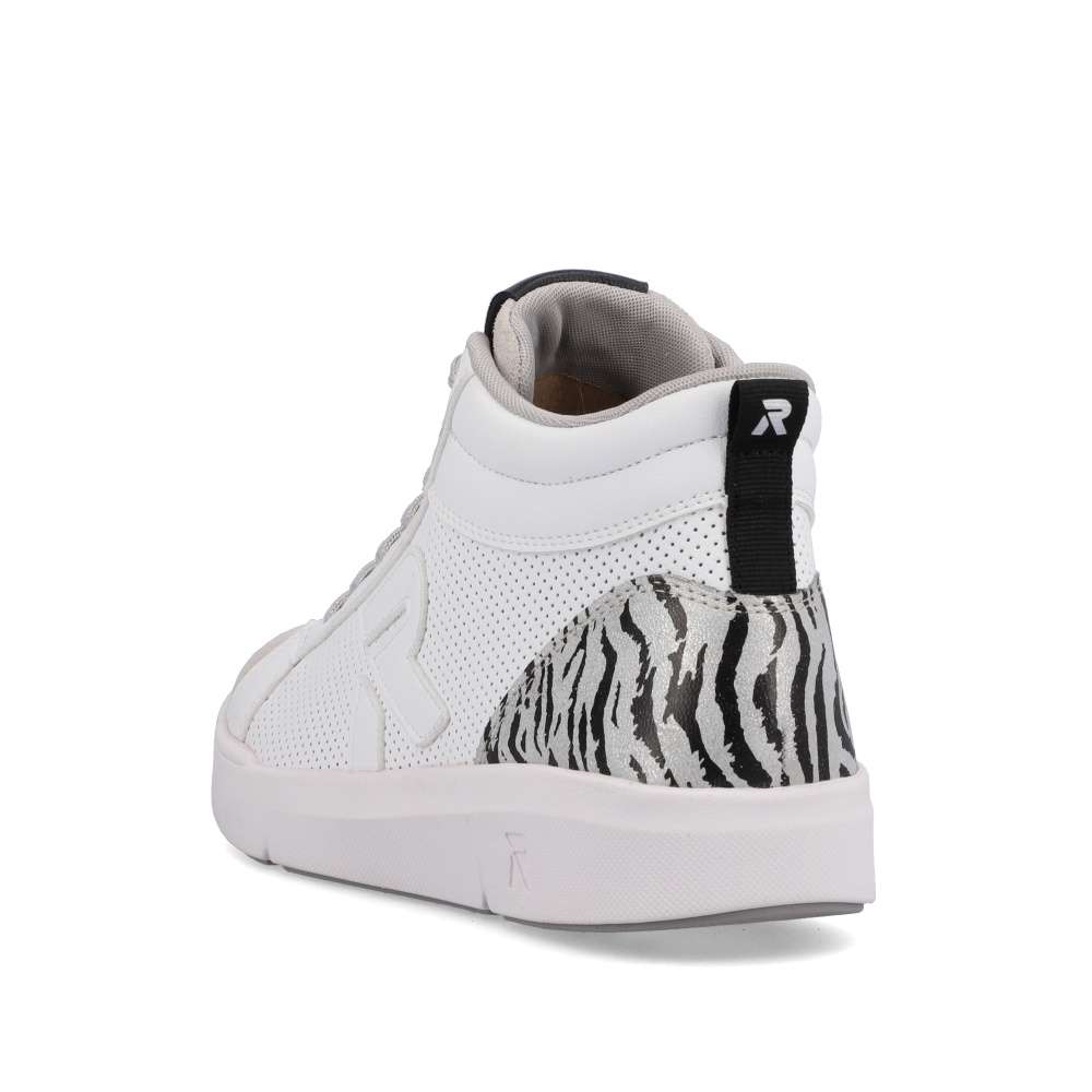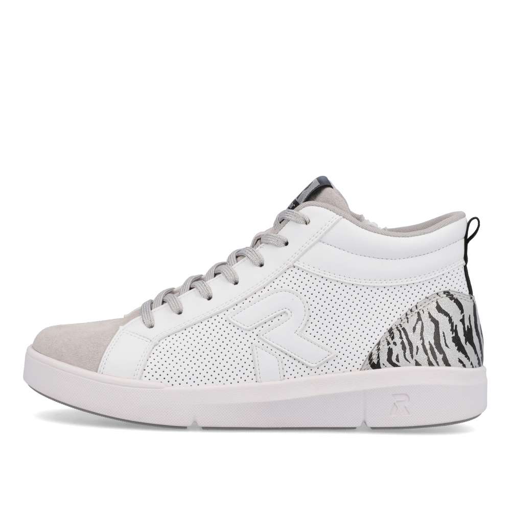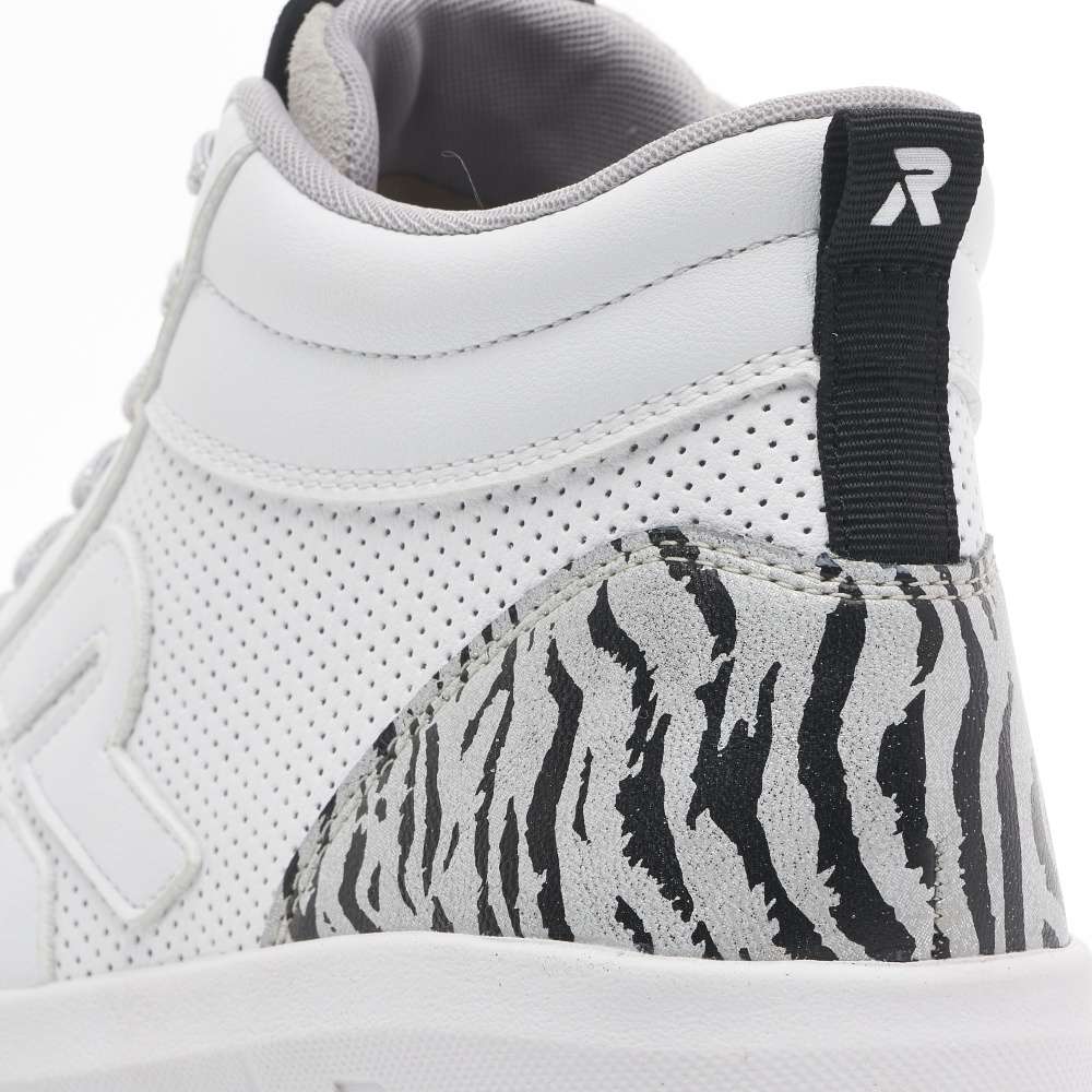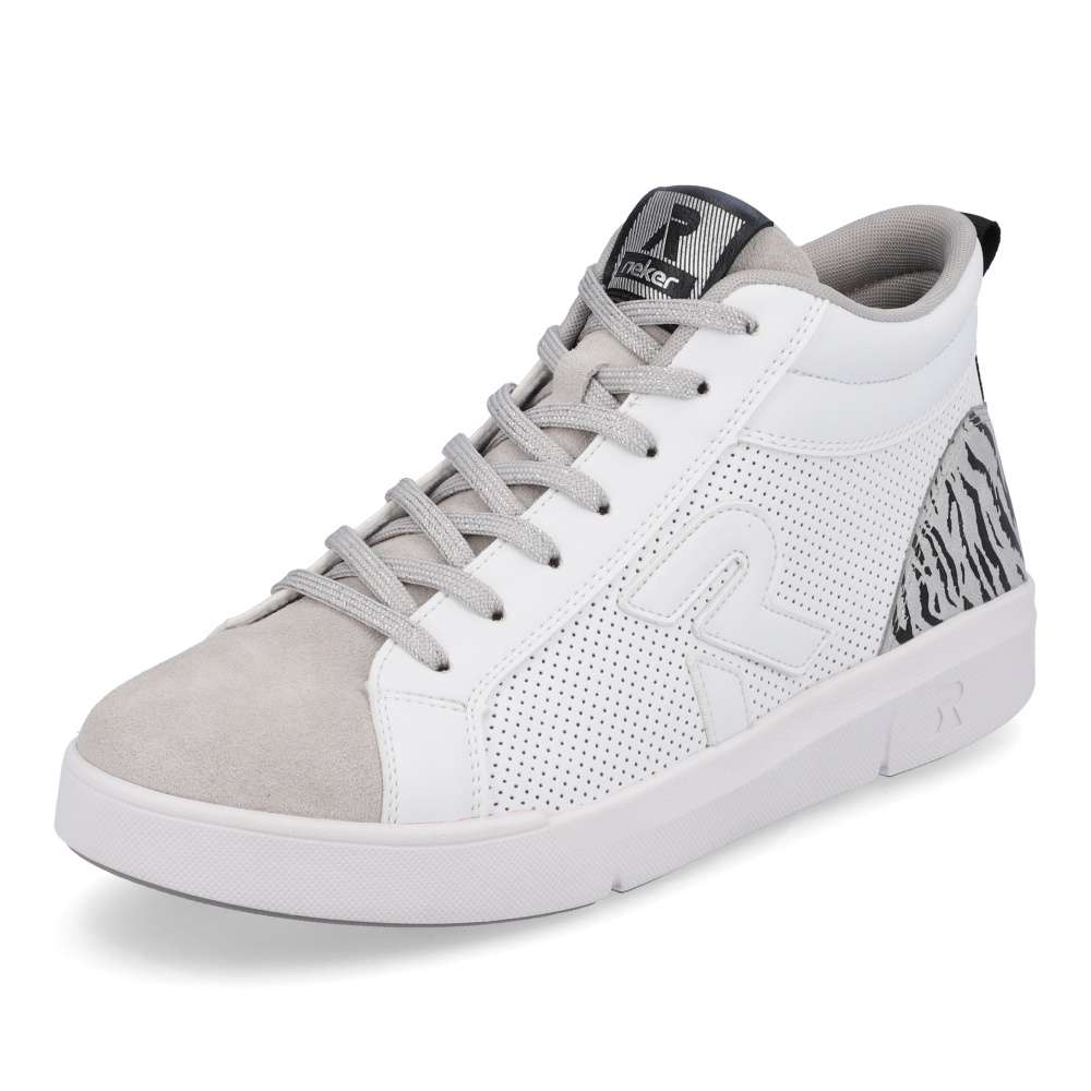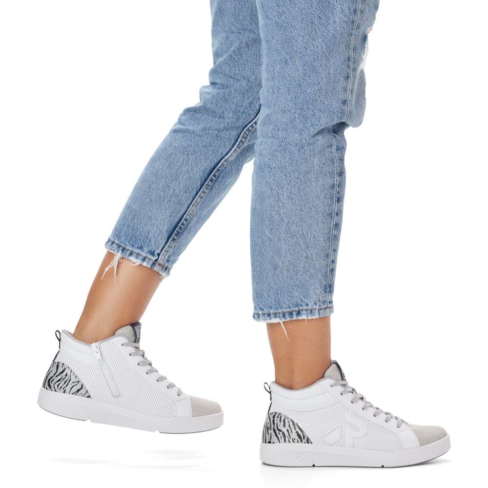 Rieker Revolution je nová řada moderní sportovní obuvi s obrovským důrazem na komfort a pohodlí i při celodenním nošení. Tyto bílo-šedé kožené tenisky Rieker jsou tou správnou volbou pro každou z Vás! Třpytivé šněrování dodává botě co nejlepší přizpůsobení se noze a zip z vnitřní strany usnadní obutí. Flexibilní a super lehká podešev spolu s měkkou vyjímatelnou stélkou nabízejí trvalou pohodu i během dlouhých dní. Svršek je zdoben jemným prošíváním a designovou perforací, která zajistí prodyšnost obuvi. Tento originální model skvěle doplní každý Váš outfit do města i na posezení s přáteli. Technologie: RevolutionSoft – unikátní stélka z paměťové pěny, která změkčuje došlap, ale také se maximálně přizpůsobí tvaru Vašeho chodidla. Tato bota je vybavena vyjímatelnou stélkou.