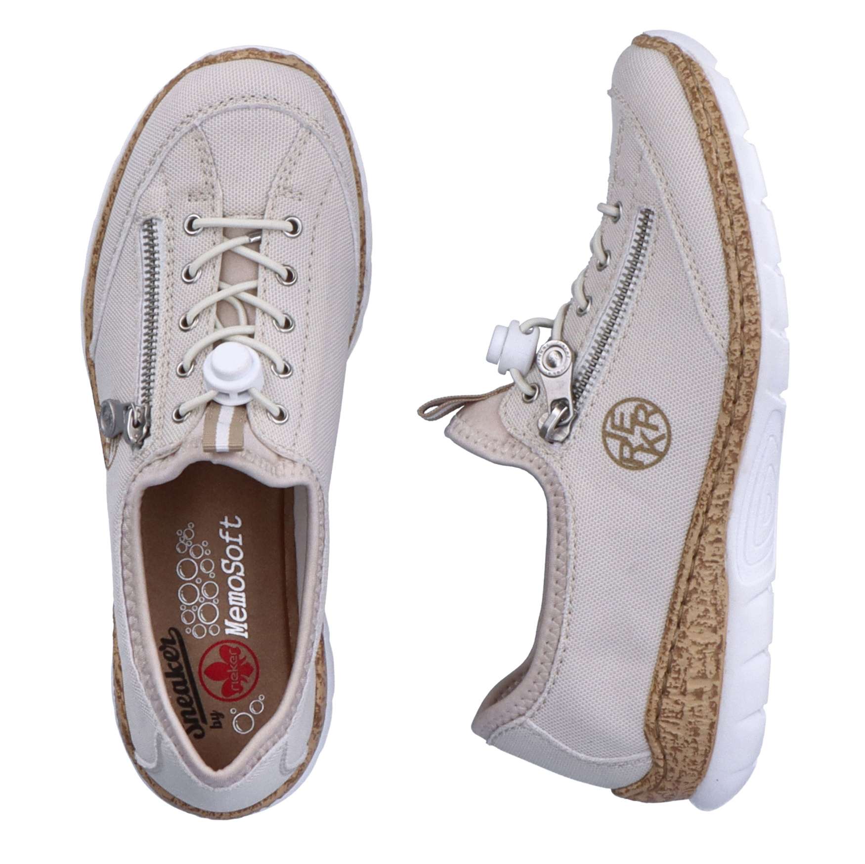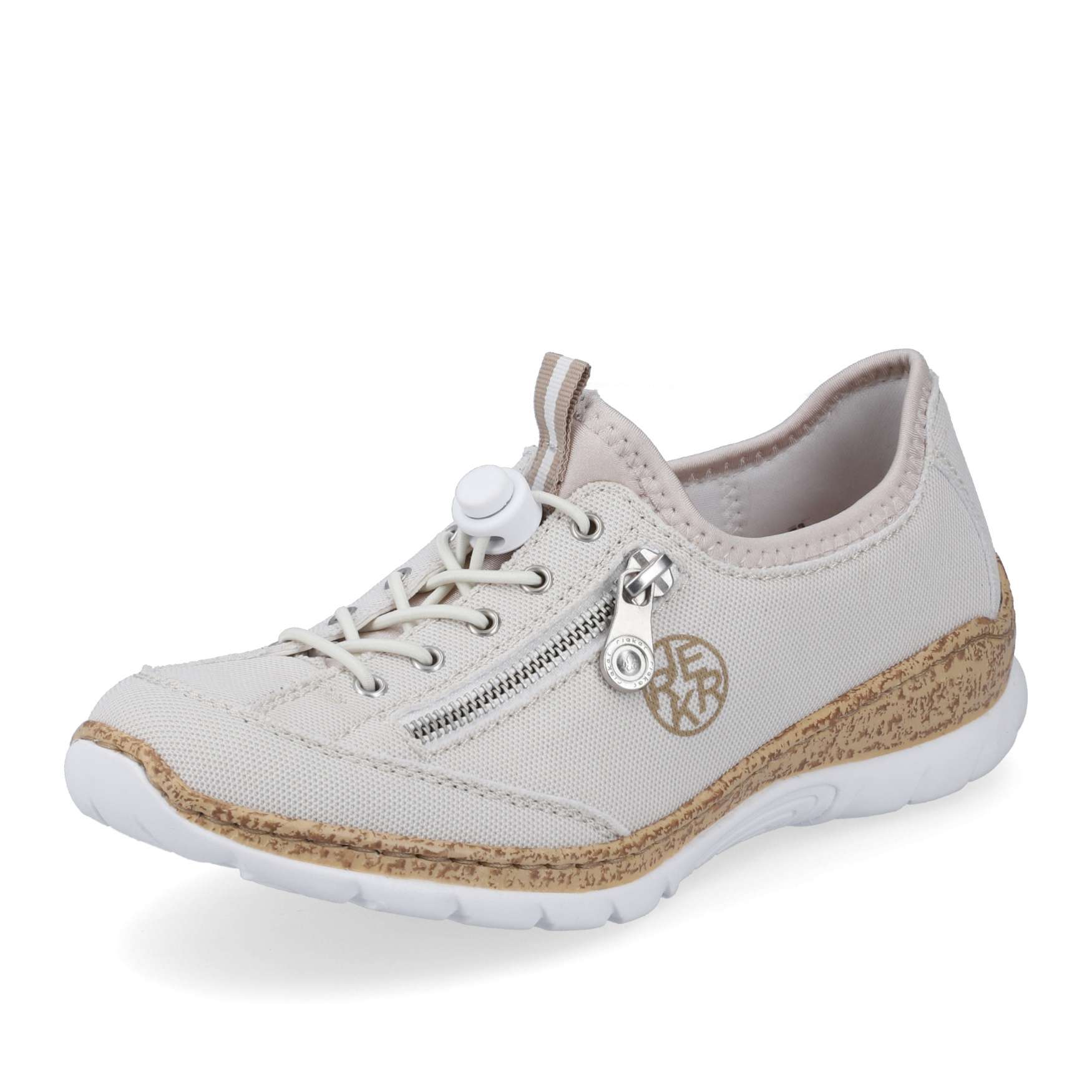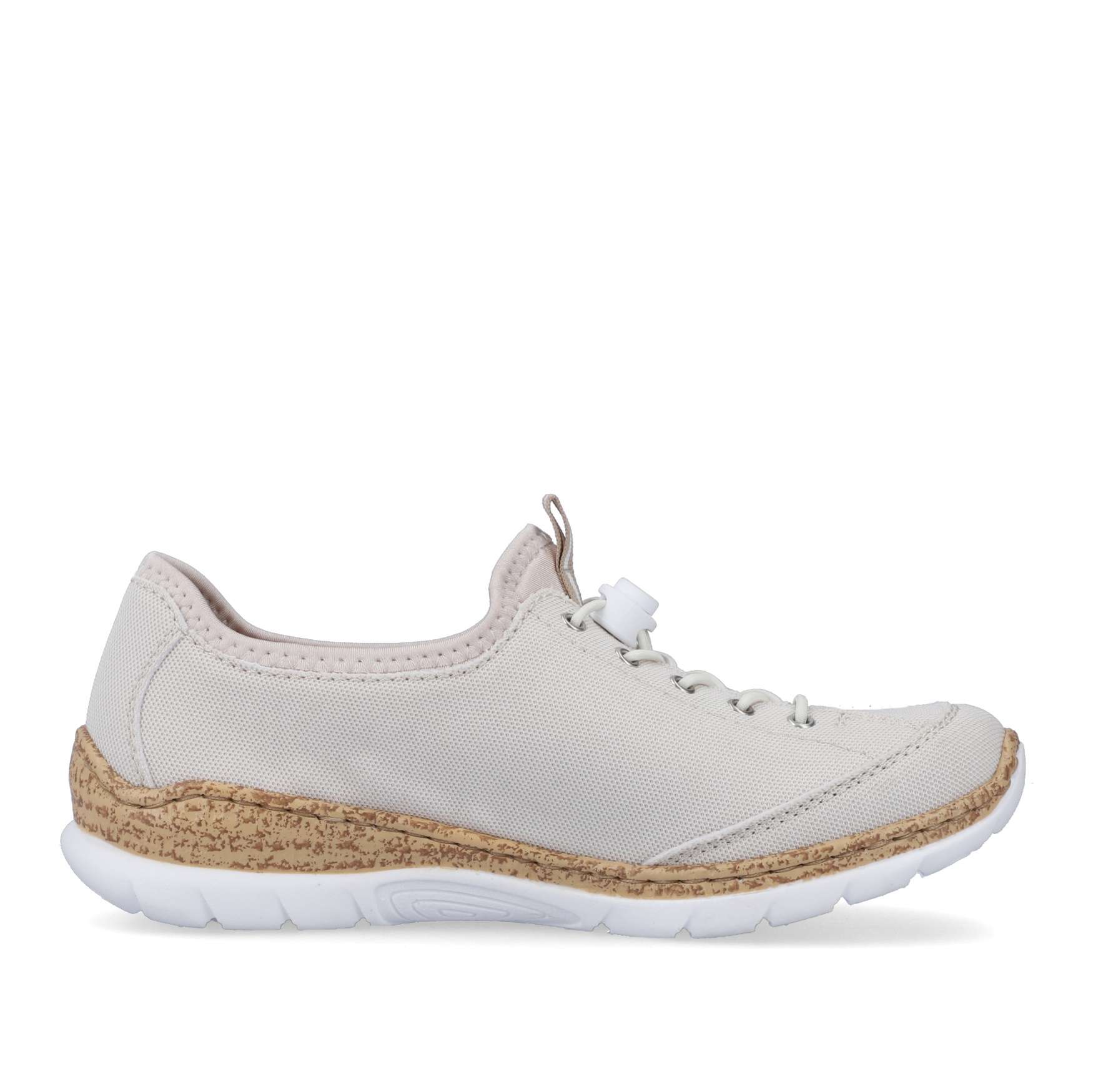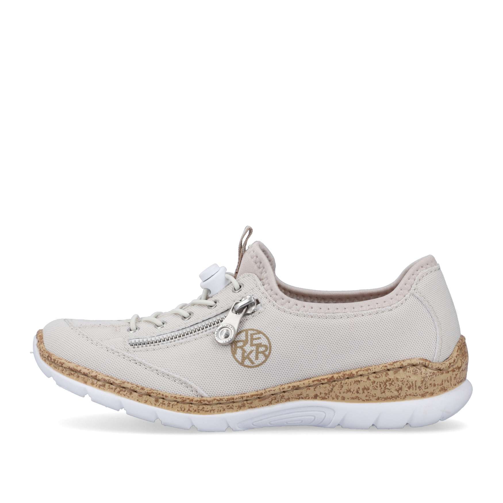 Detailní informace Elegantní, ale zároveň sportovní jsou tyto polobotky značky RIEKER. Textilní svršek světlé barvy je doplněn potiskem s logem značky, zipem či pružným lemem horního okraje obuvi. Snadno si obuv nazujete a přizpůsobíte díky kontrastnímu poutku a šněrování pružnou gumičkou, které lze snadno utáhnout či povolit. Unikátní textilní stélka z paměťové pěny změkčí došlap a přizpůsobí se tvaru Vašeho chodidla. Podešev v horní části s imitací korku je vyrobená s technologií Antistress díky níž je lehká a flexibilní. Tento vysoce komfortní vzor je vhodný pro každodenní nošení ke každému outfitu.