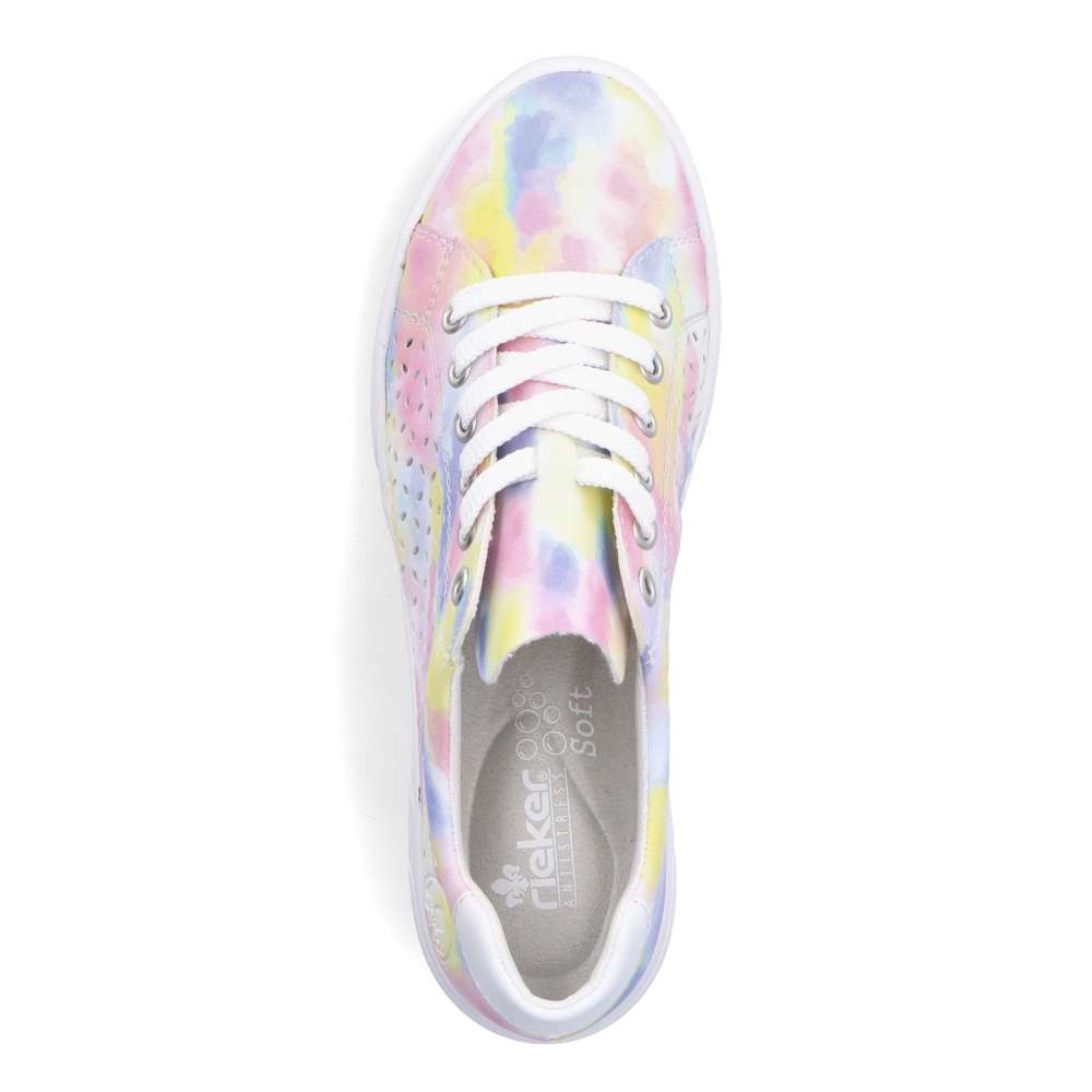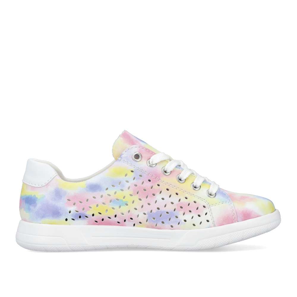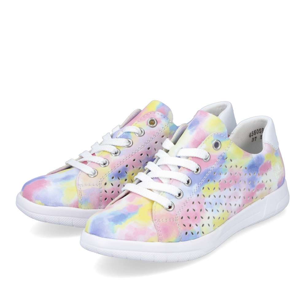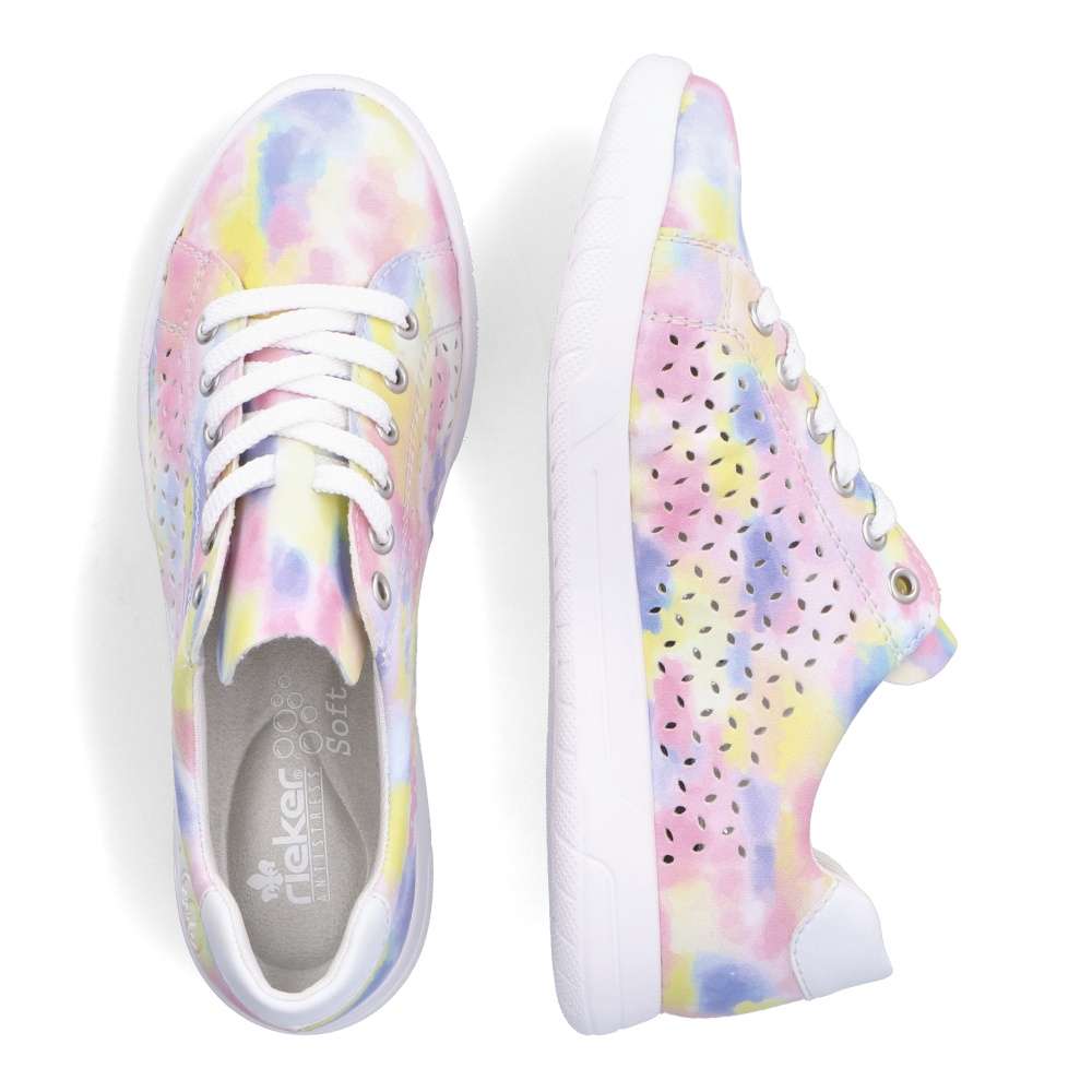 Detailní informace Nádherné tenisky RIEKER s perforací a nepřehlédnutelnou barevnou kombinací vykouzlí úsměv každým obutím. Navíc díky vyjímatelné měkké stélce a podešvi vybavené unikátní technologií ANTISTRESS nebudete chtít tyto krásky zout. Boty jsou na zavazování, tedy si je jednoduše přizpůsobíte přesně jak potřebujete. Jednoduše je sladíte k sukni, šatům, šortkám i kalhotám. Tento model nesmí chybět ve Vašem nákupním košíku.