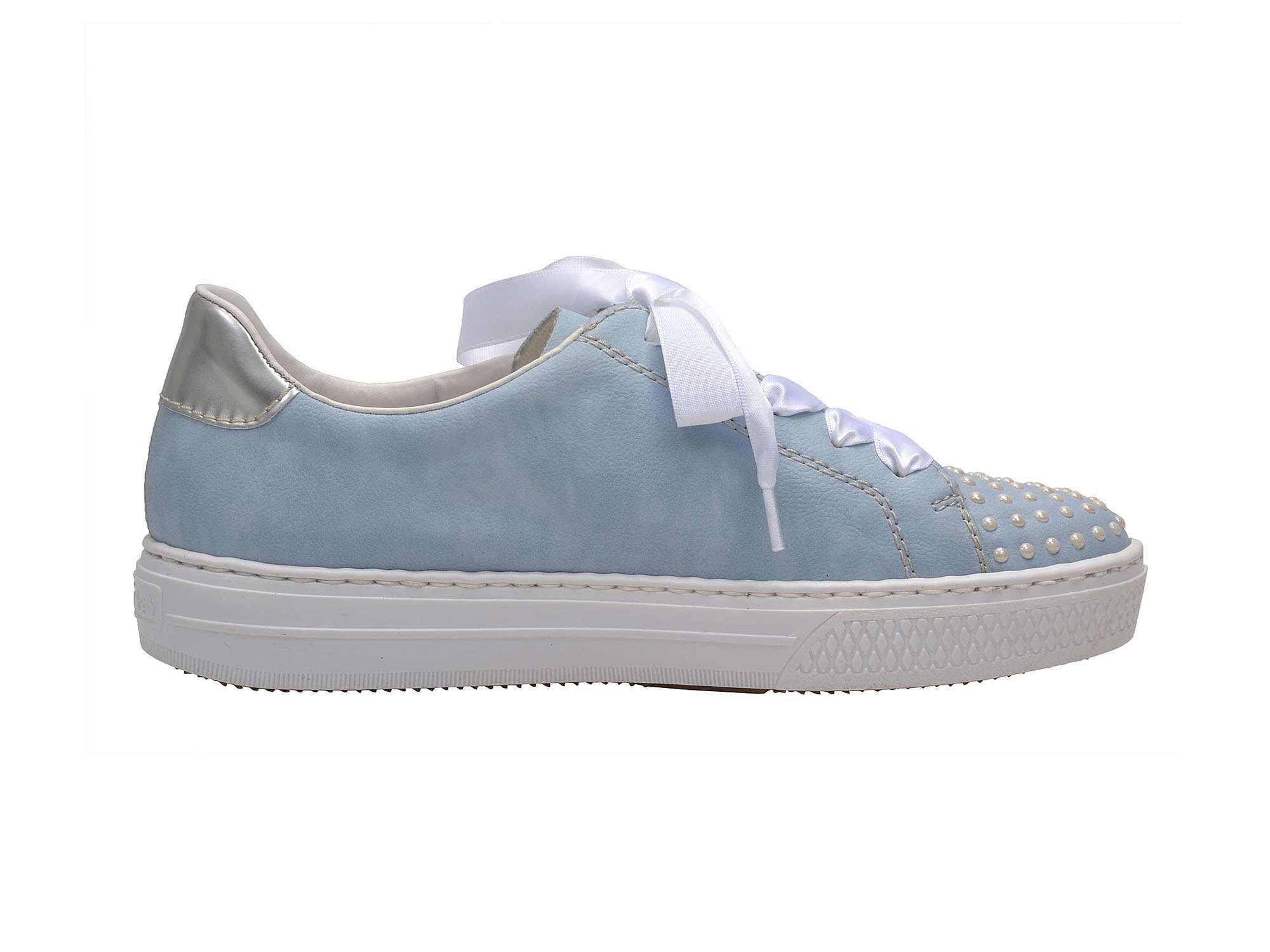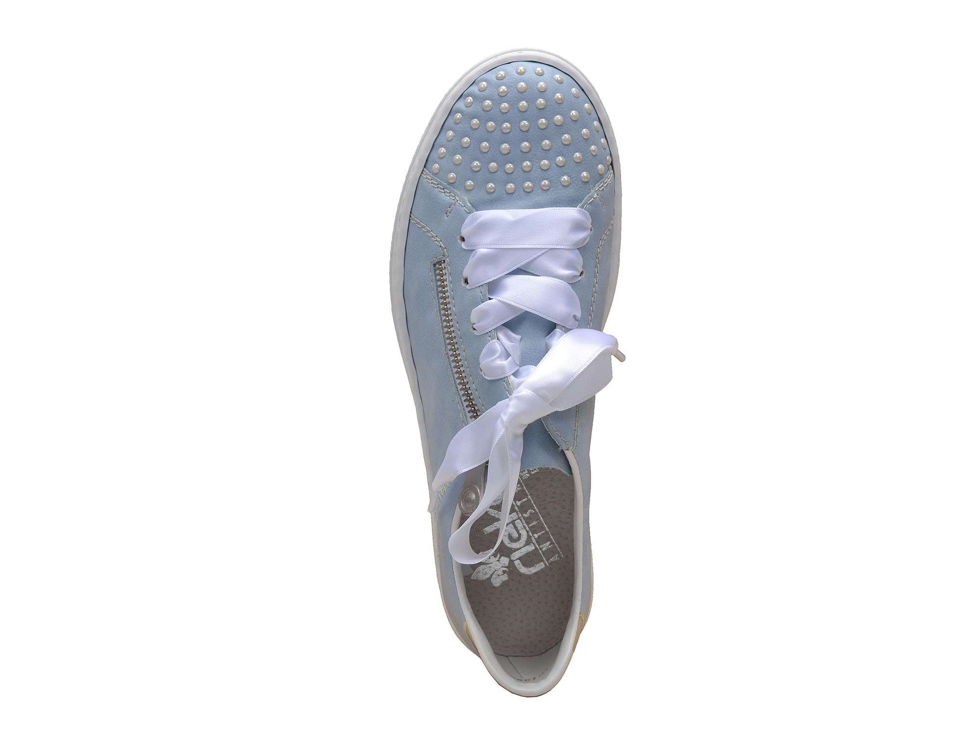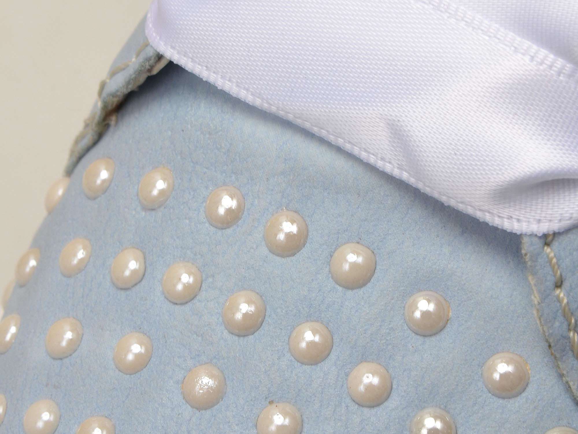 Svršek tenisek je vyroben ze syntetického materiálu v modré barvě. V přední části nalezneme ozdobné perličky, které mají bílou barvu, stejně jako stuha, která je ve formě šněrování místo tkaniček. Obuv má na vnější straně funkční zip, díky kterému se obuv snadněji nazouvá a zouvá.