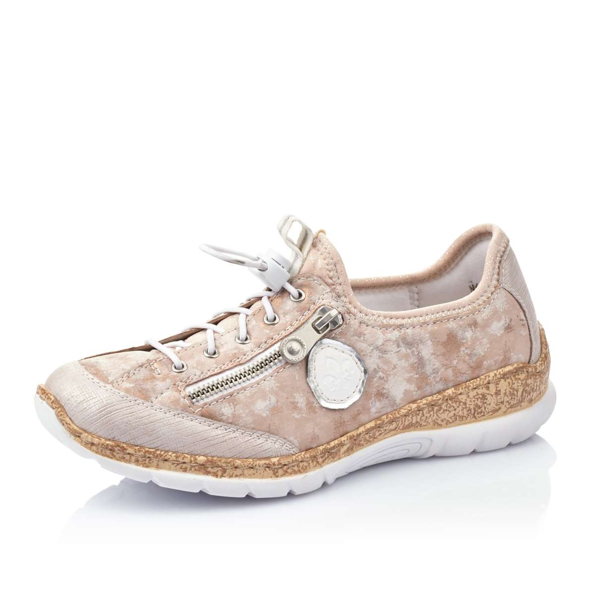 Šikovné a elegantní polobotky sportovního stylu mají zdobný zip na vnější straně i logo značky Rieker a kontrastní dvoubarevnou podešev. Místo tkaniček je zde praktická bílá gumička a poutko pro snadné obutí. Tento vysoce komfortní vzor je vhodný pro každodenní nošení ke každému outfitu.