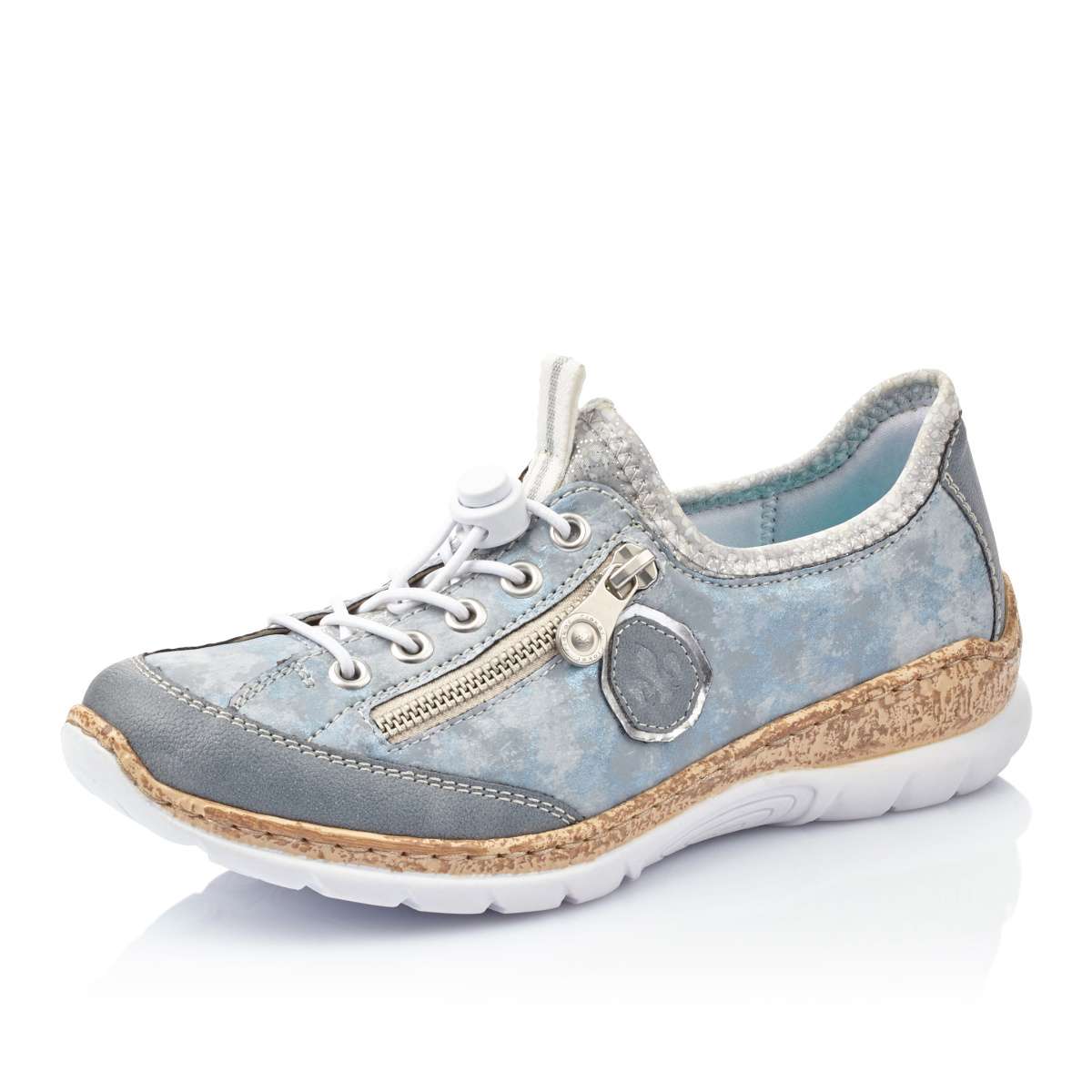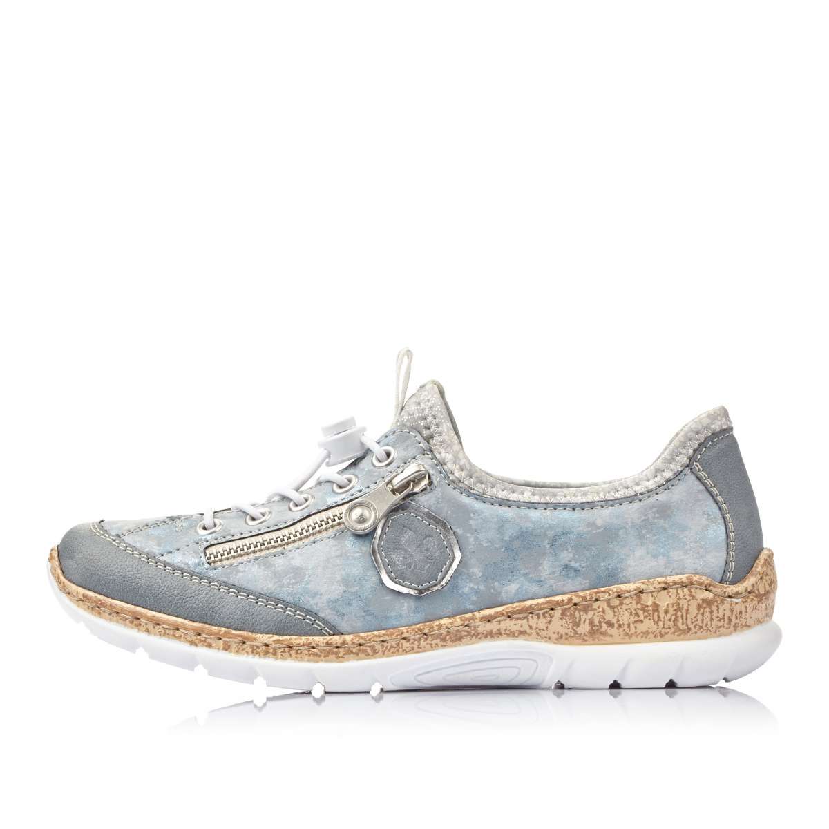 Polobotky sportovního stylu mají zdobný zip na vnější straně i logo značky Rieker a kontrastní dvoubarevnou podešev. Místo tkaniček je zde praktická bílá gumička a poutko pro snadné obutí.