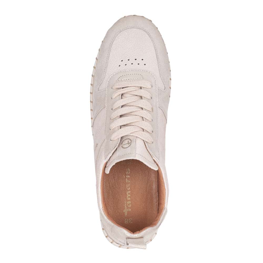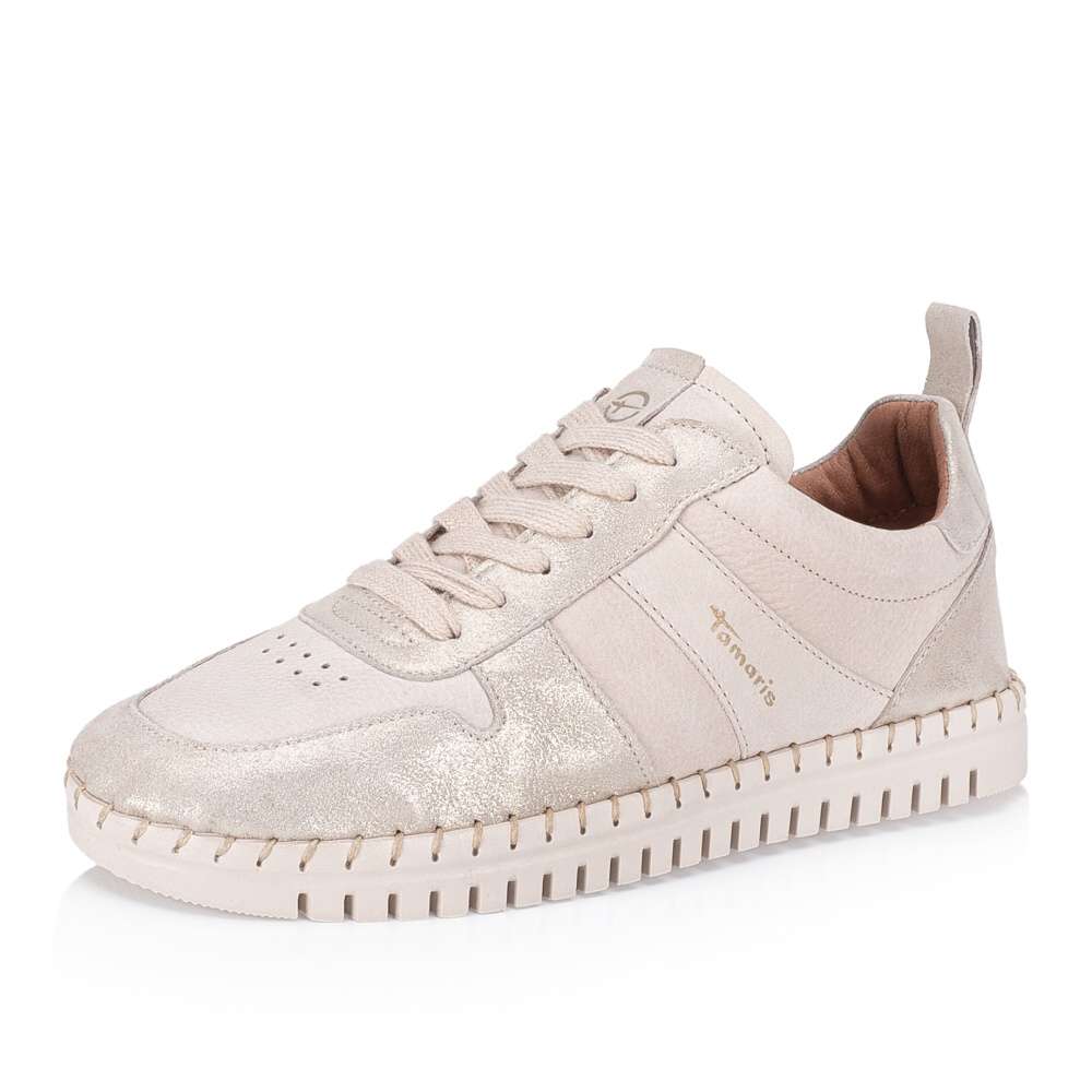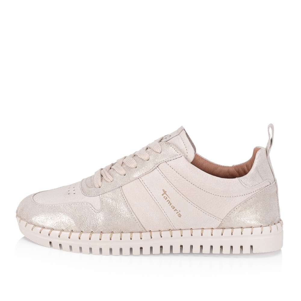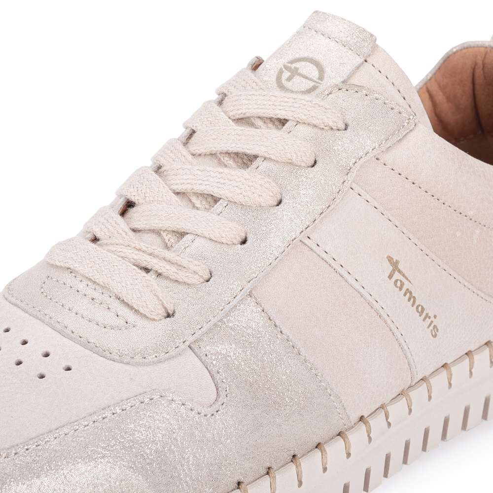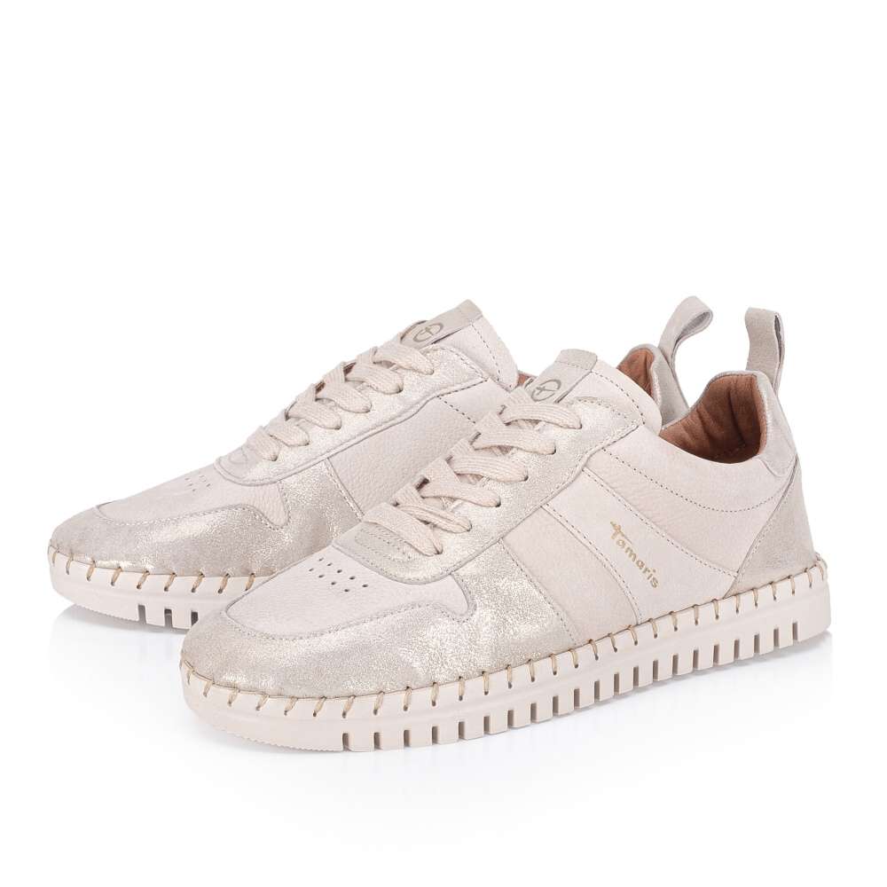 Kožené tenisky Tamaris mají půvabné části s odlesky a jsou moderním doplňkem do každodenního života. Zdobí je logo značky a zdobné prošití po obvodu podešve, která je vyšší a poskytuje jak estetiku, tak i komfort při nošení. Vyjímatelná stélka umožňuje snadnou údržbu a šněrovaní zajistí perfektní přizpůsobení a stabilitu během nošení. Tyto tenisky spojují styl s pohodlím a jsou skvělou volbou pro každodenní nošení.