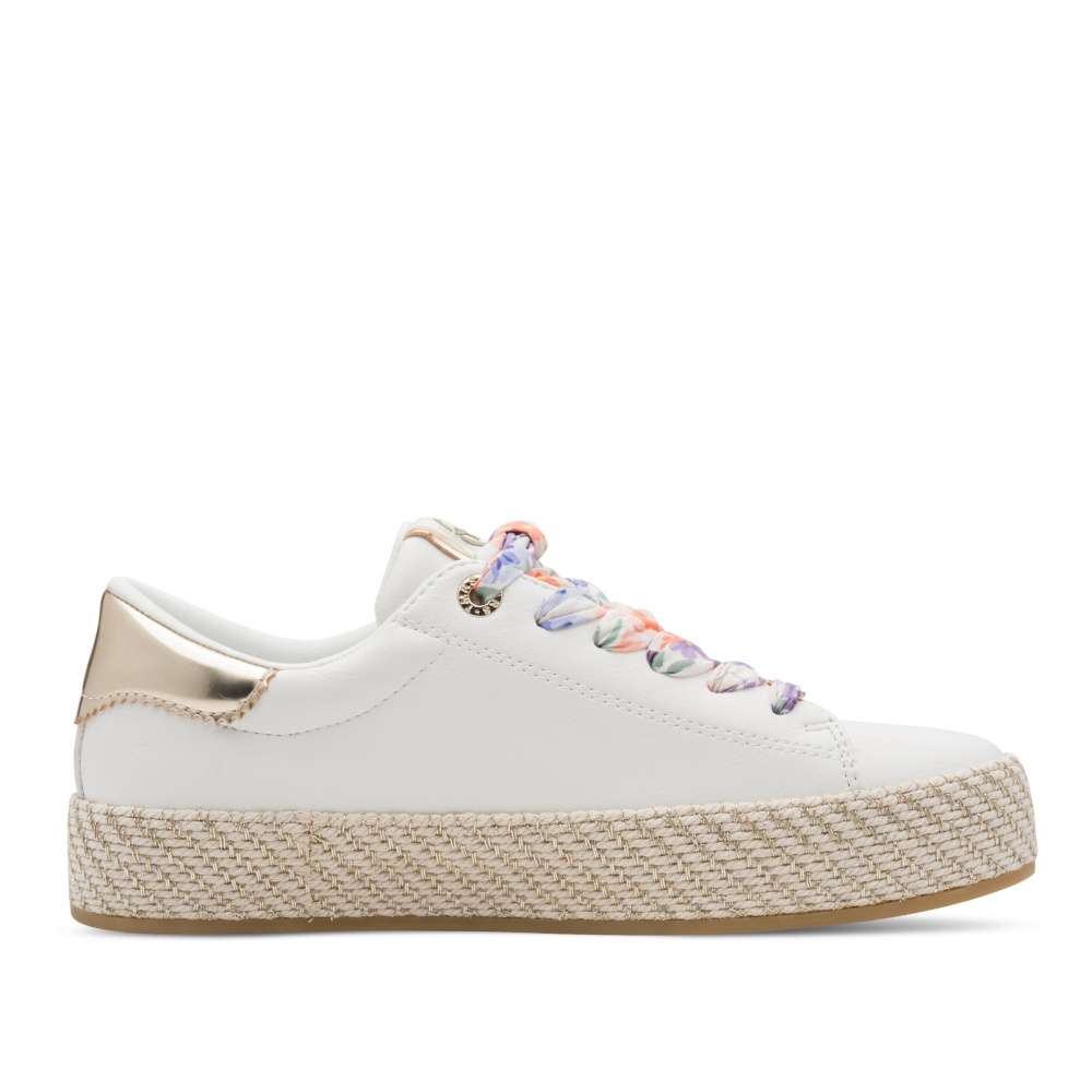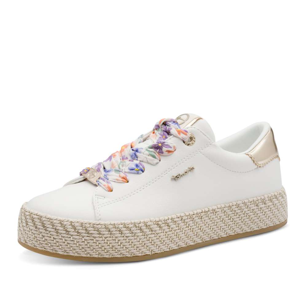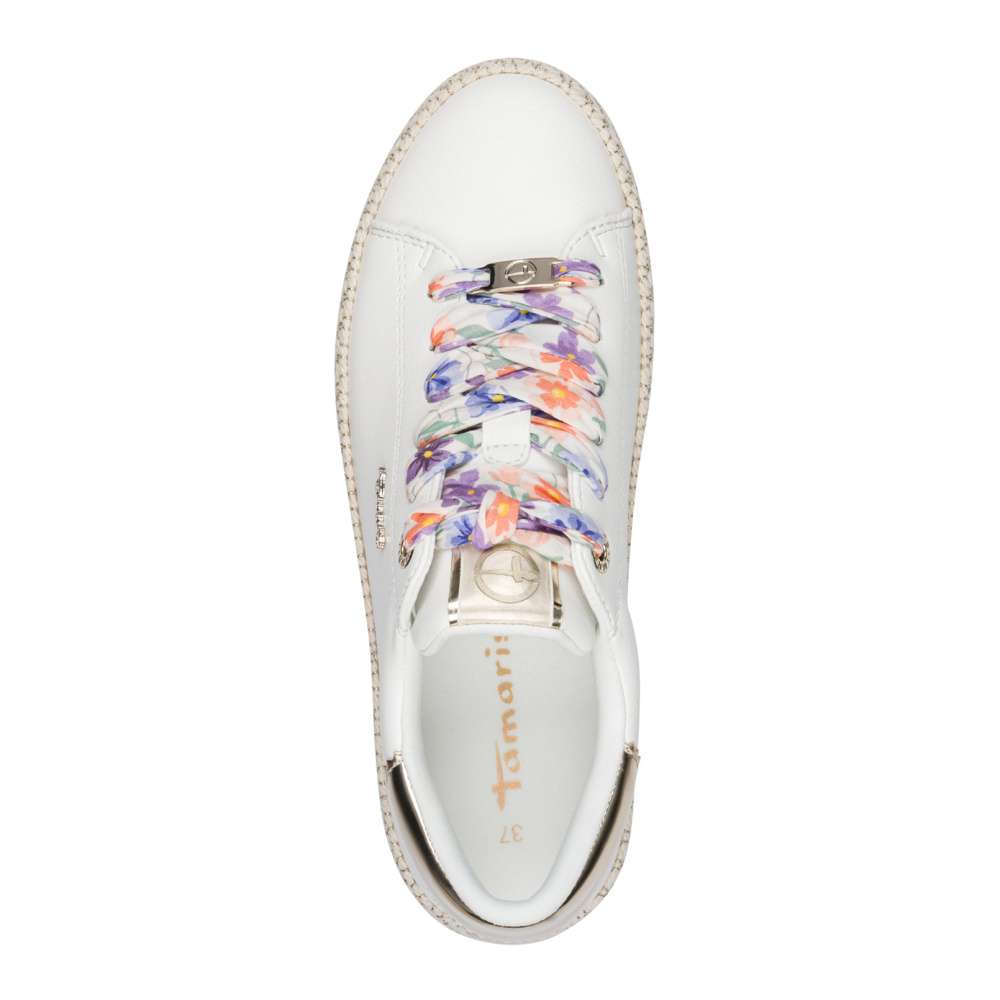 Tyto dámské tenisky značky Tamaris představují dokonalou kombinaci stylu, pohodlí a promyšlených designových detailů. Bílý svršek je ozdoben metalicky lesklými aplikacemi, které dodávají obuvi sofistikovaný vzhled a jemný třpyt, jenž zaujme na první pohled. Vyšší podrážka nejen vizuálně zvyšuje atraktivitu modelu svým zajímavým zpracováním, ale zároveň poskytuje stabilitu při každém kroku, čímž zajišťuje komfort při celodenním nošení. Šněrování barevnou stuhou umožňuje přesné přizpůsobení šířky obuvi tvaru chodidla, což přispívá k pohodlí a bezpečnému držení nohy. Místo tradičních tkaniček je použita efektní stuha, která dodává teniskám moderní a originální vzhled a podtrhuje jejich elegantní charakter. Stylové, pohodlné a nápadité – tyto tenisky Tamaris jsou ideálním doplňkem pro ženy, které chtějí spojit moderní design s praktickým komfortem a vyjádřit svůj osobní styl.